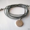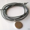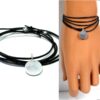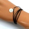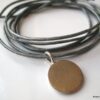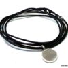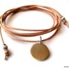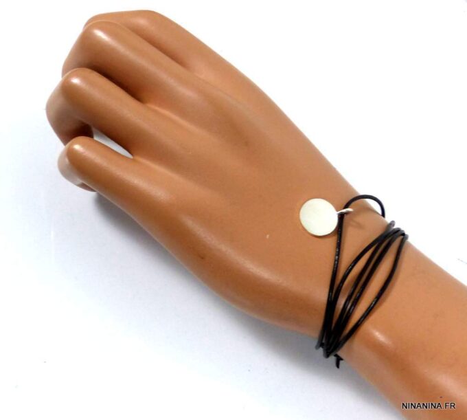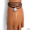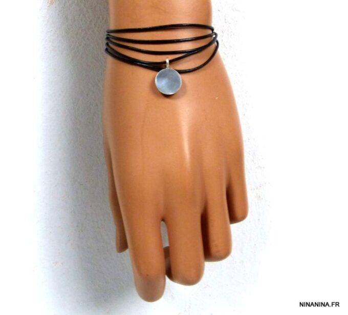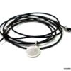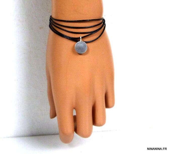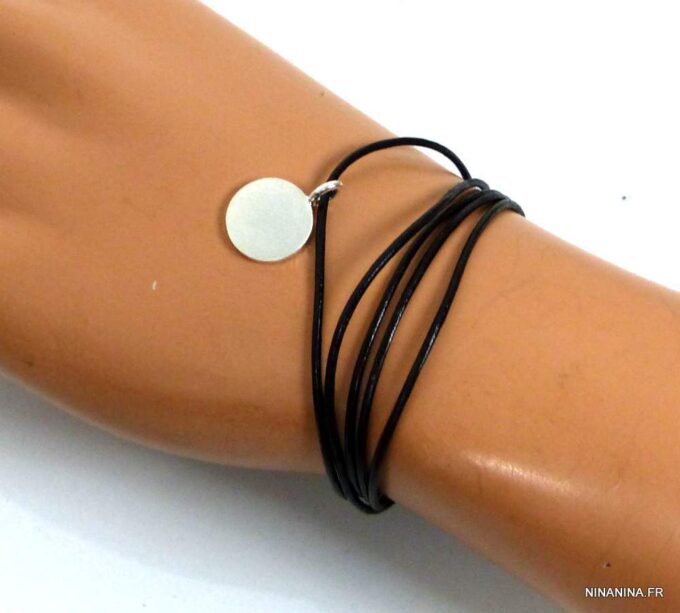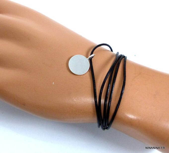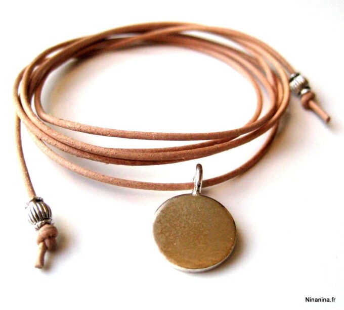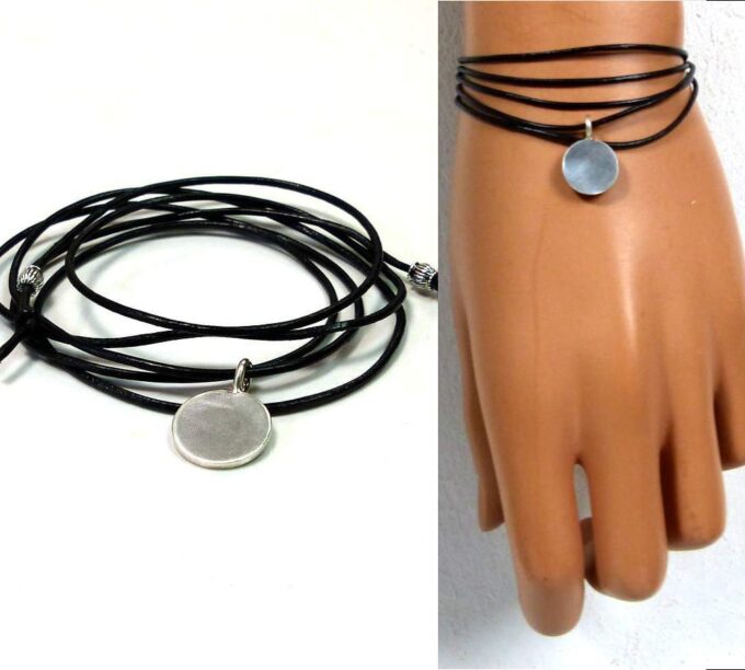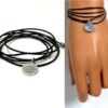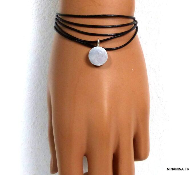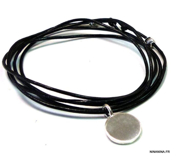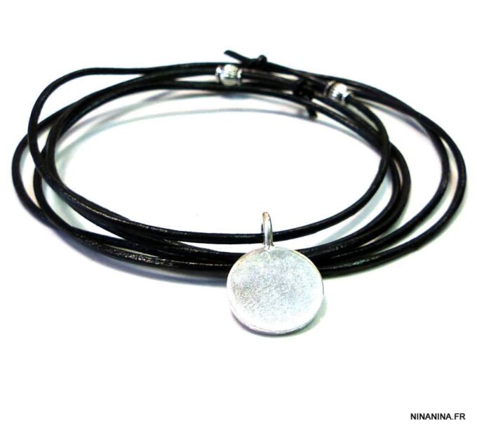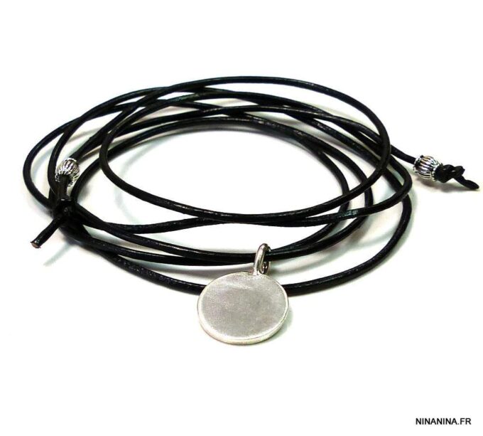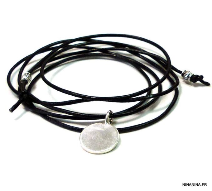Bracelet à enrouler autour poignet médaille Argent cuir composé d’une médaille en argent 925 montée sur un lien de cuir et terminé par deux perles striées en argent 925 à enrouler autour du poignet. Dim de la médaille : 1,4 X 1,2 cm. Fermeture par un noeud simple. Longueur totale : 75 cm env. Livré dans sa pochette d’organza. Bijou 100% fait main.