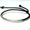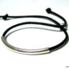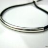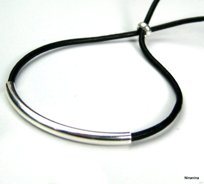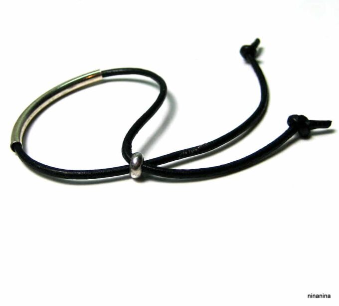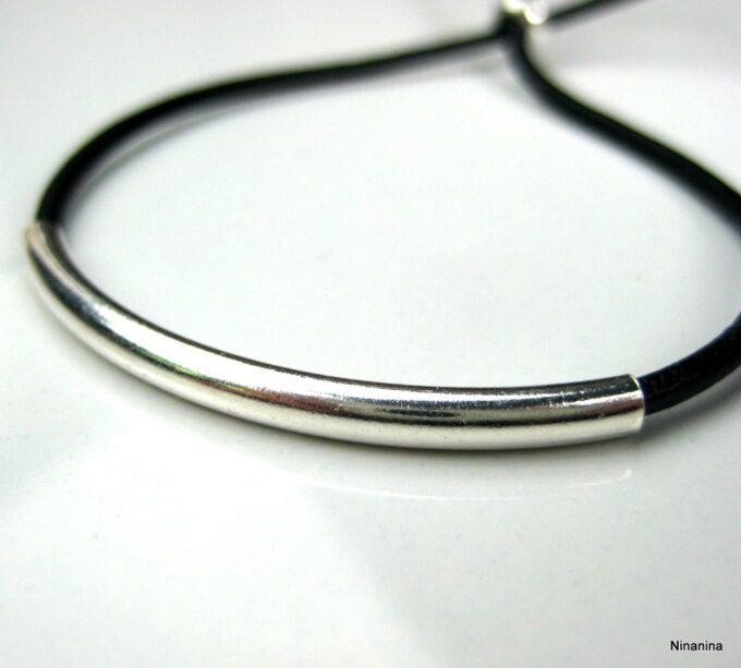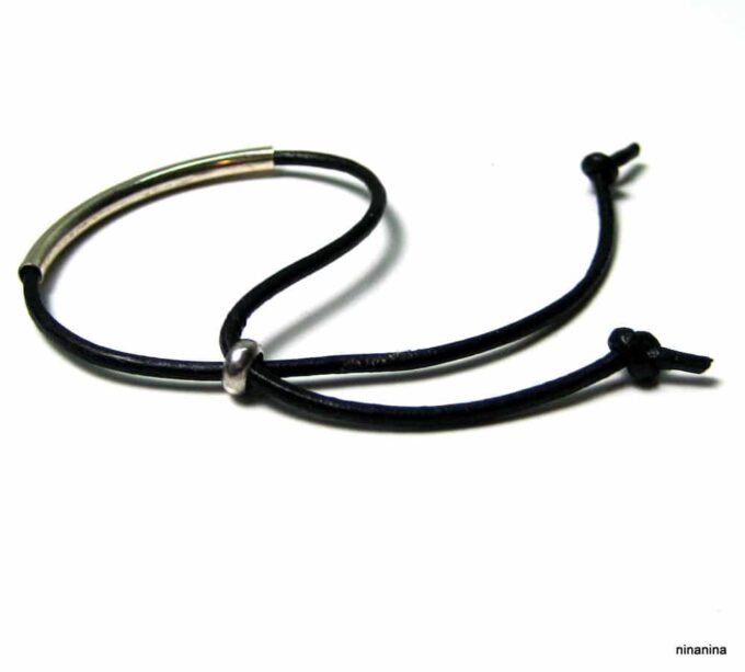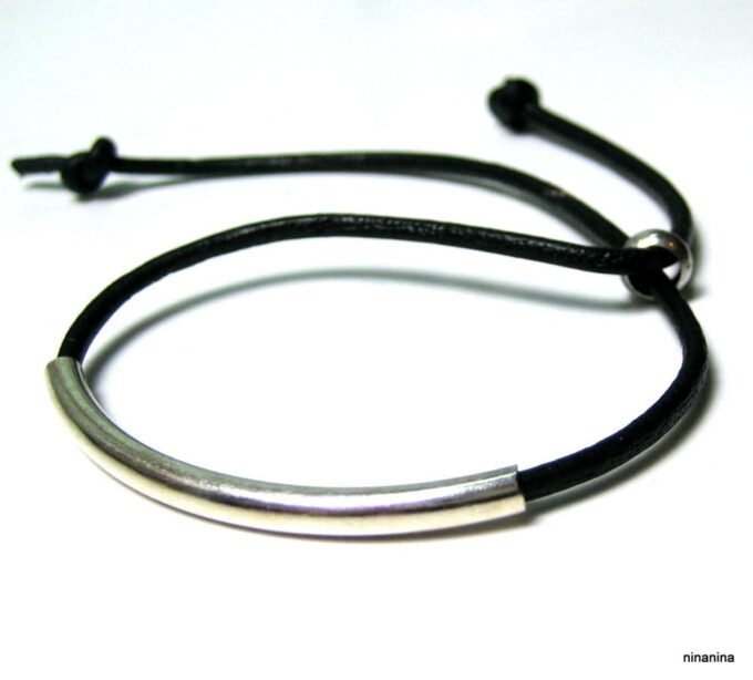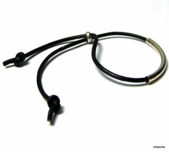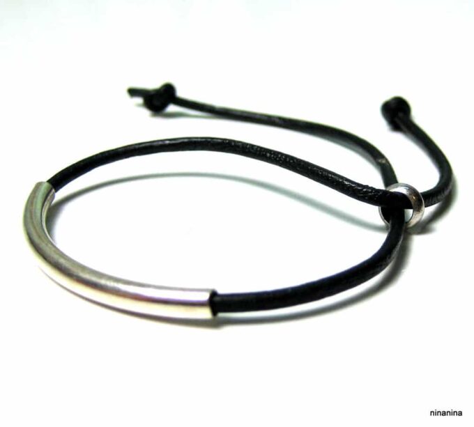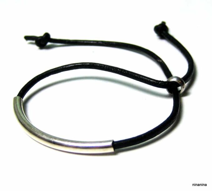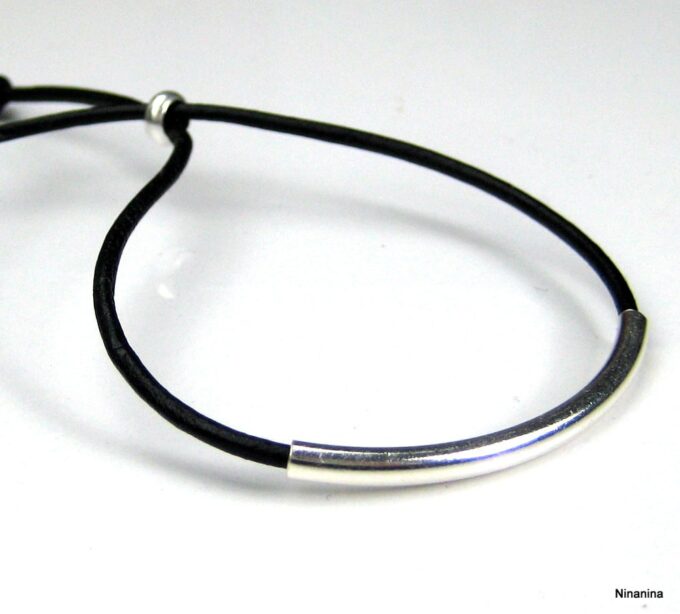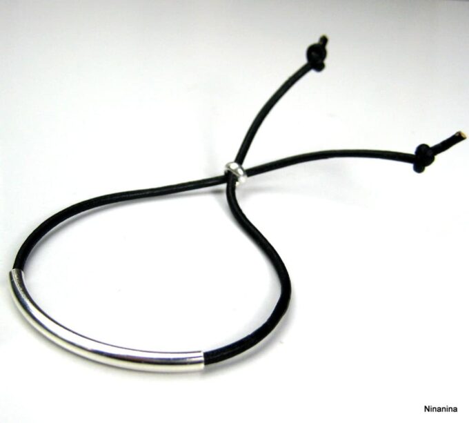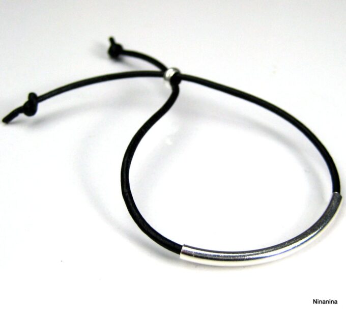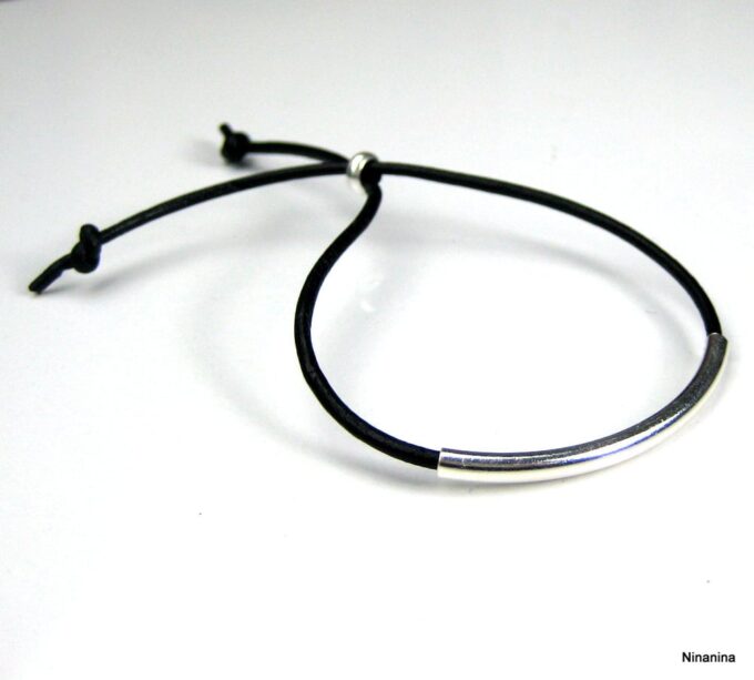 Bracelet ajustable perle tube Argent 925 Cordon Cuir composé d’une perle cylindrique demi-lune en argent 925 montée sur un cordon de cuir. Diamètre du cordon : 2 mm. Existe aussi avec un cordon gris, marron chocolat et noir. Dim du tube : 0,3 X 2 cm. Fermeture par liens coulissants. Longueur : De 17 à 29 cm env réglable. Livré dans sa pochette d’organza. Bijou 100% fait-main. Poids : 0,5 g