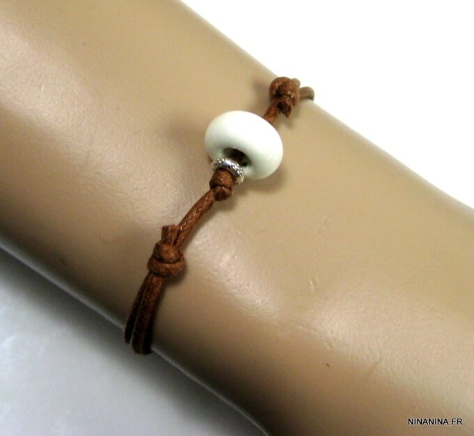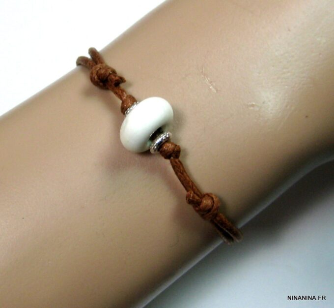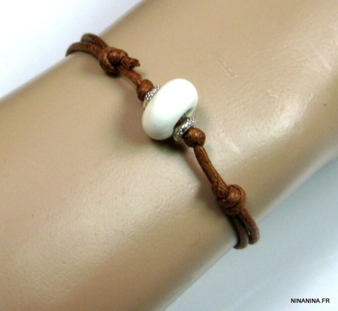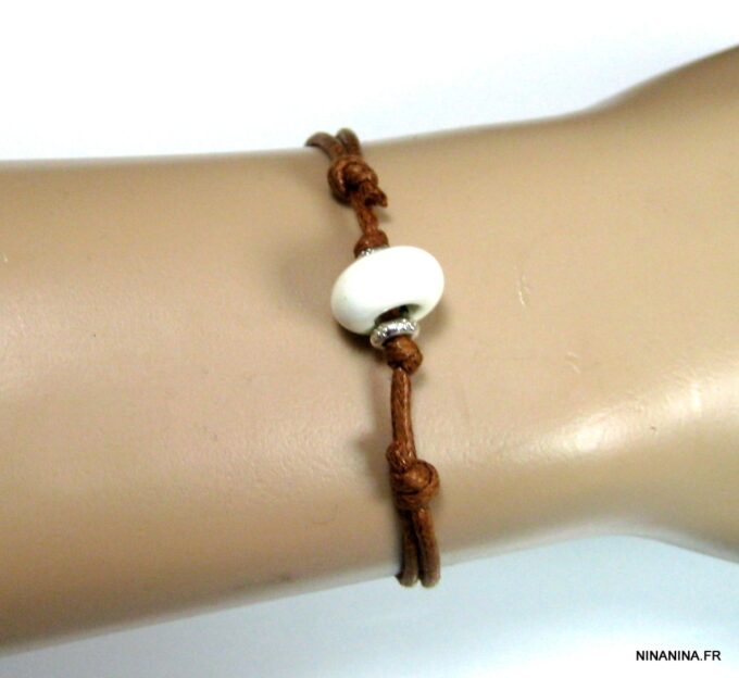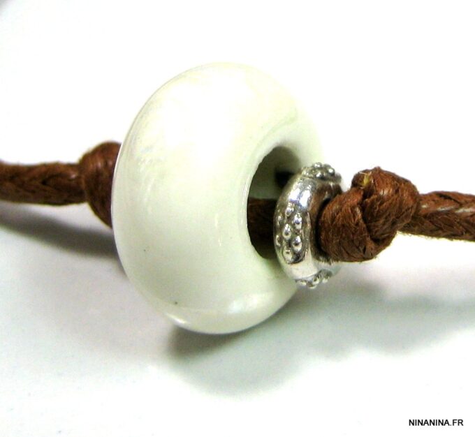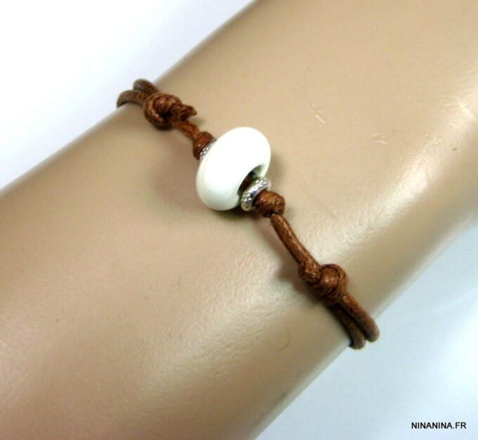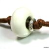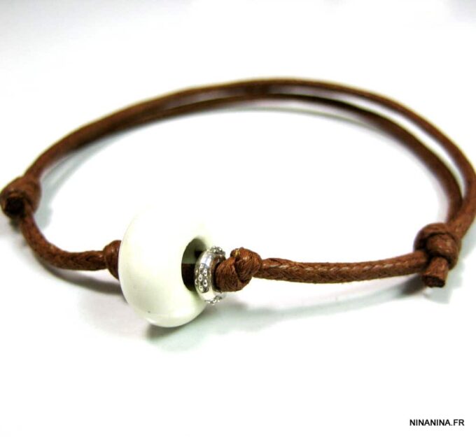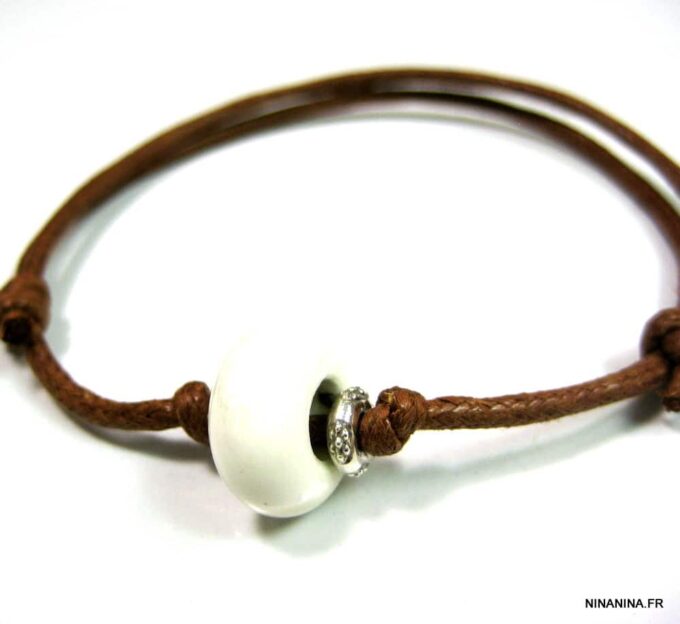 Bracelet homme cordon argent massif composé d’une perle en céramique blanche et de deux rondelles en argent 925 montées sur un double cordon de coton ciré caramel (2mm de diamètre).