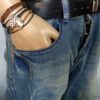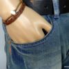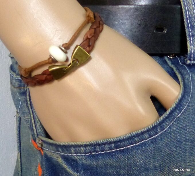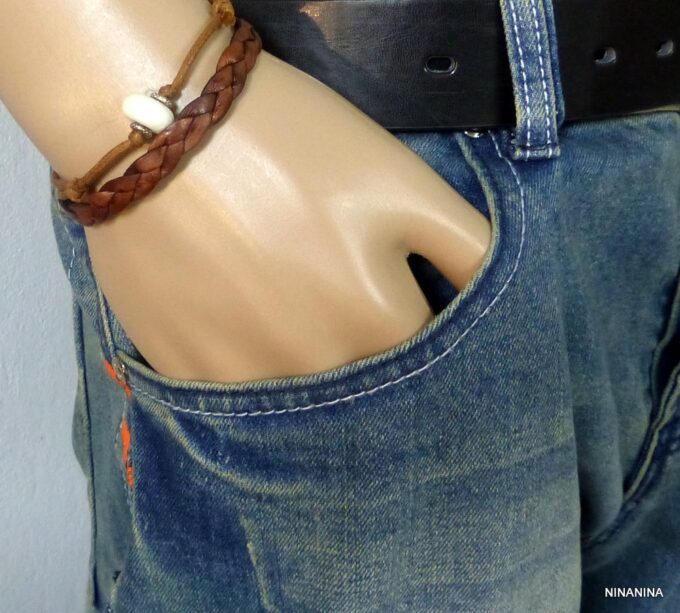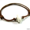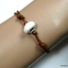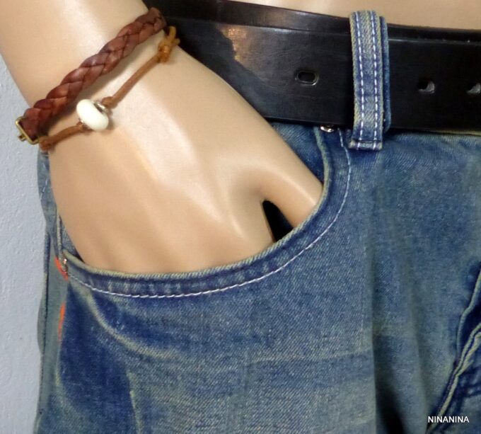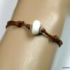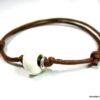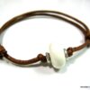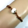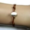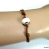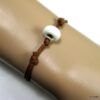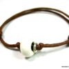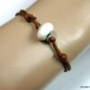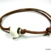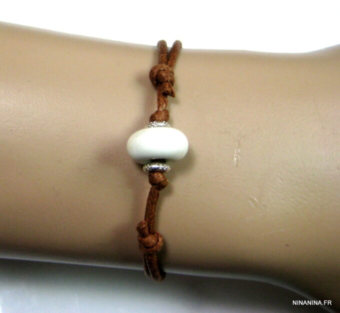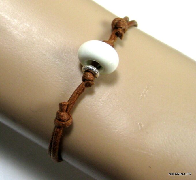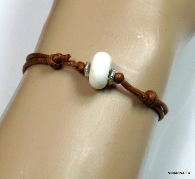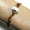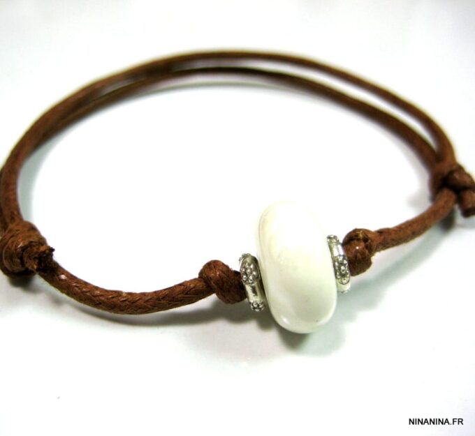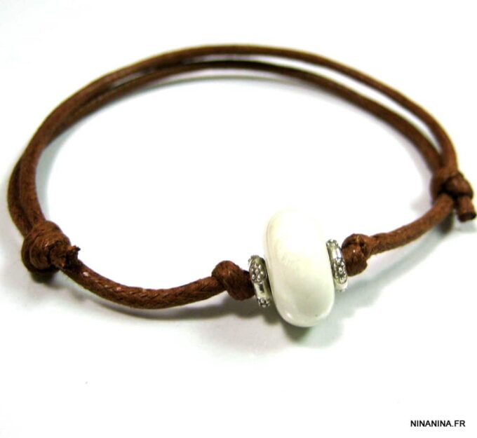 Bracelet homme cordon argent massif composé d’une perle en céramique blanche et de deux rondelles en argent 925 montées sur un double cordon de coton ciré caramel (2mm de diamètre).