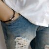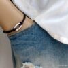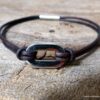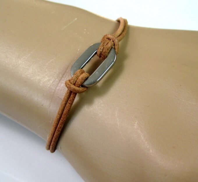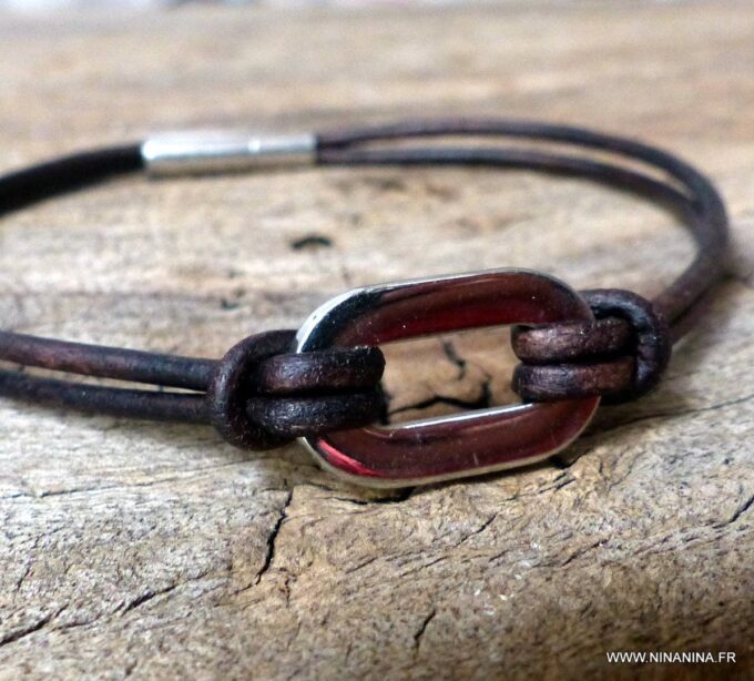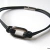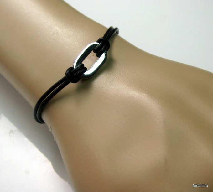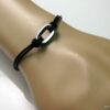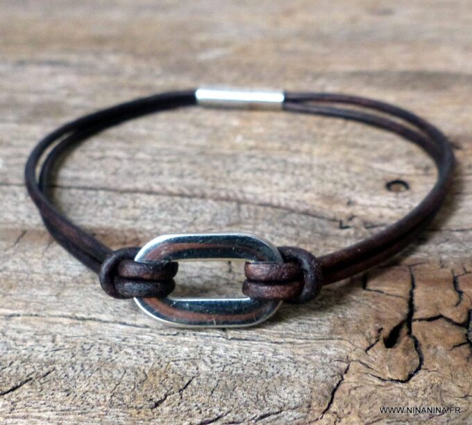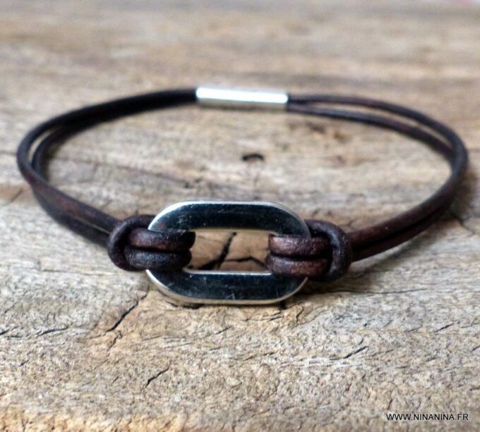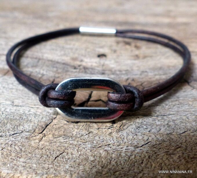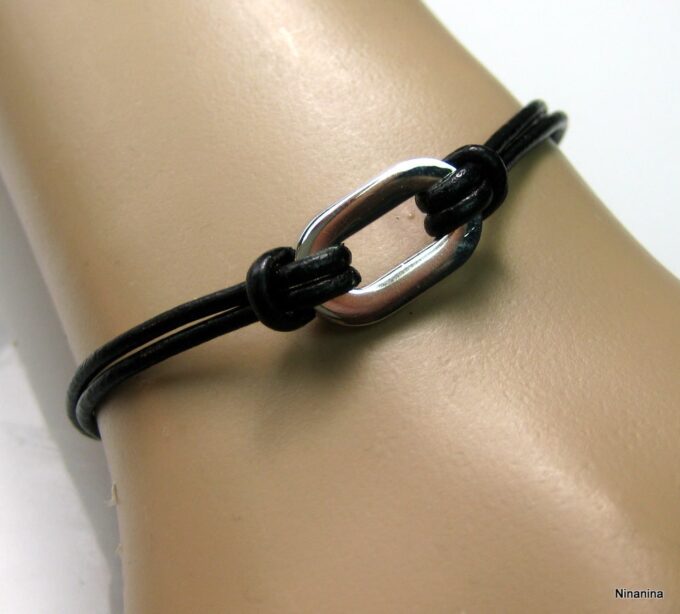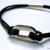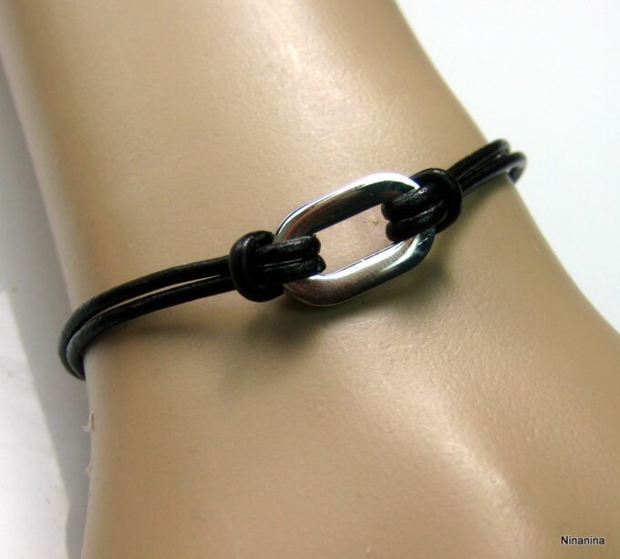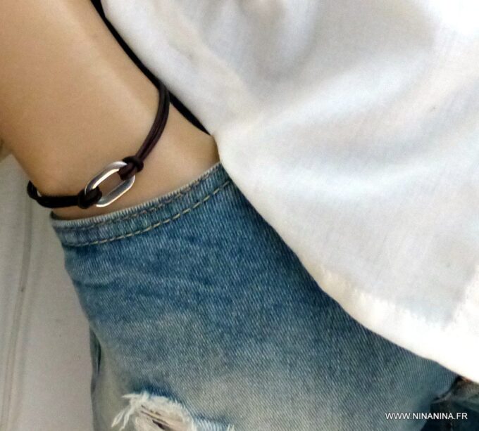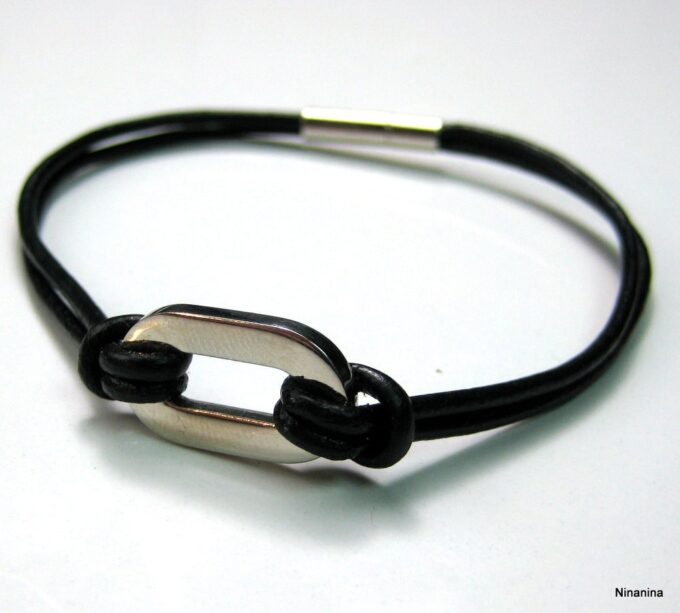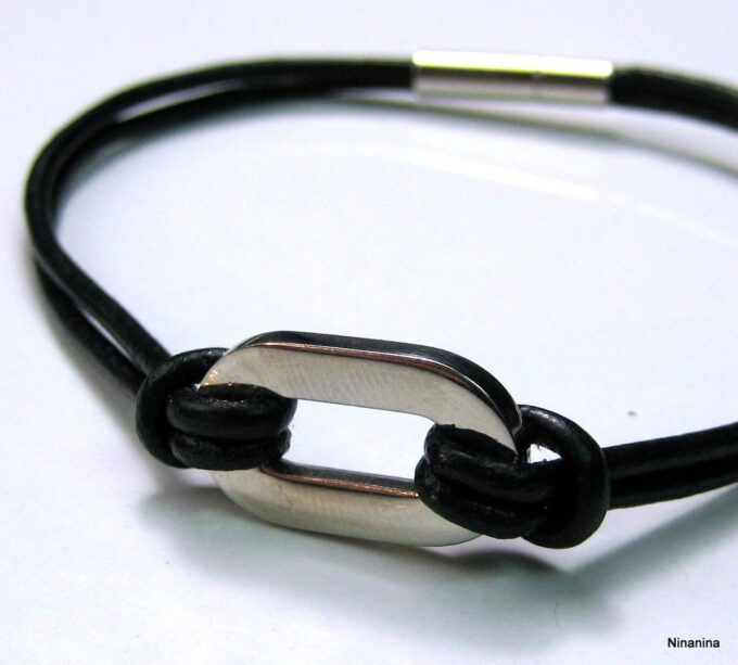 Bracelet cordon cuir Anneau Ovale Acier composé d’un anneau ovale en acier inoxydable monté sur un double cordon de cuir noir (2 mm de diamètre).  Dim de l’anneau : 2 X 1,2 cm.  Existe avec un cordon noir, marron chocolat, turquoise et naturel.  Fermoir cylindrique en acier inoxydable. Longueur : 21 cm env.  Livré dans sa pochette d’organza. Bijou 100% fait main.