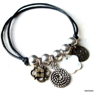 Ce bracelet artisanal allie modernité et symbolisme. Il se compose d’une chaînette en acier inoxydable, d’un cordon noir ciré coulissant et de deux médaillons protecteurs :