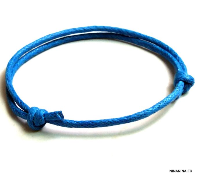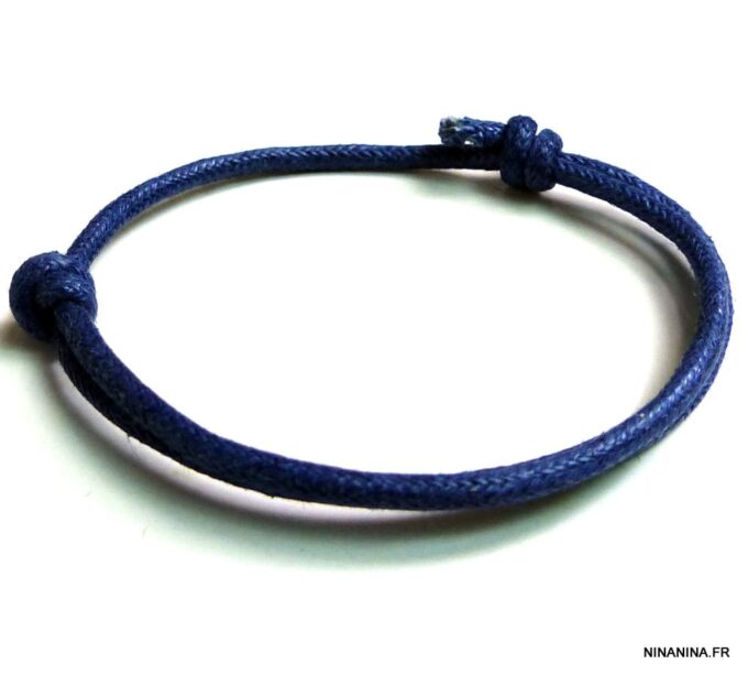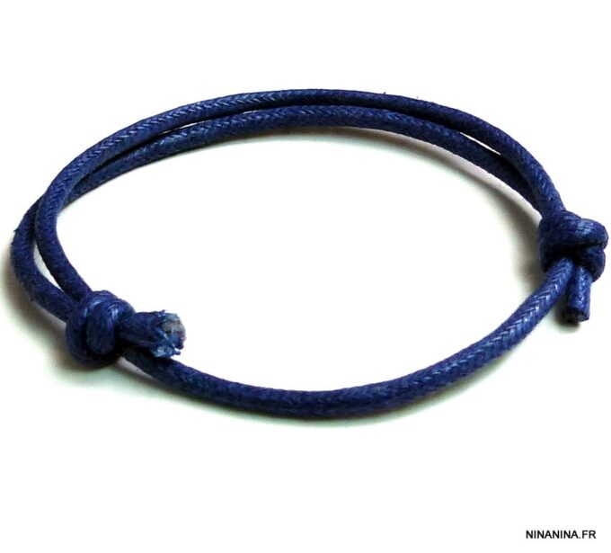Bracelet cordon bleu réglable homme ou femme composé d’un cordon de coton ciré bleu nuit (2mm de diamètre). Fermeture par liens coulissants.