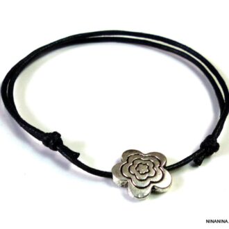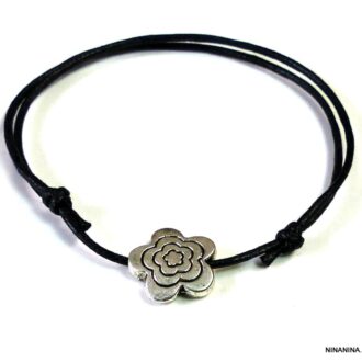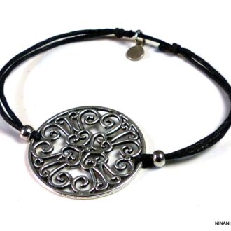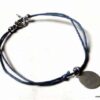 Bracelet cordon coton ciré gris breloque ronde constitué d’un sequin en métal argenté monté sur cordon de coton ciré. Existe en noir, marron chocolat, gris, blanc cassé, turquoise, rouge et rose. Existe aussi avec un cordon cuir. Fermoir mousqueton. Diamètre : 5 cm env réglable par liens coulissants. Livré dans sa pochette d’organza. Bijou 100% fait-main.