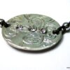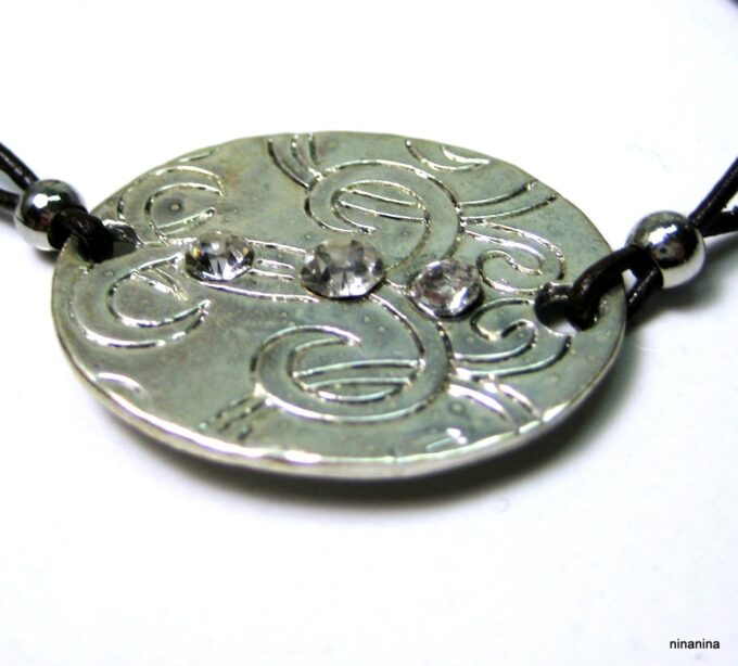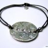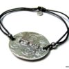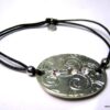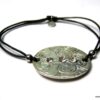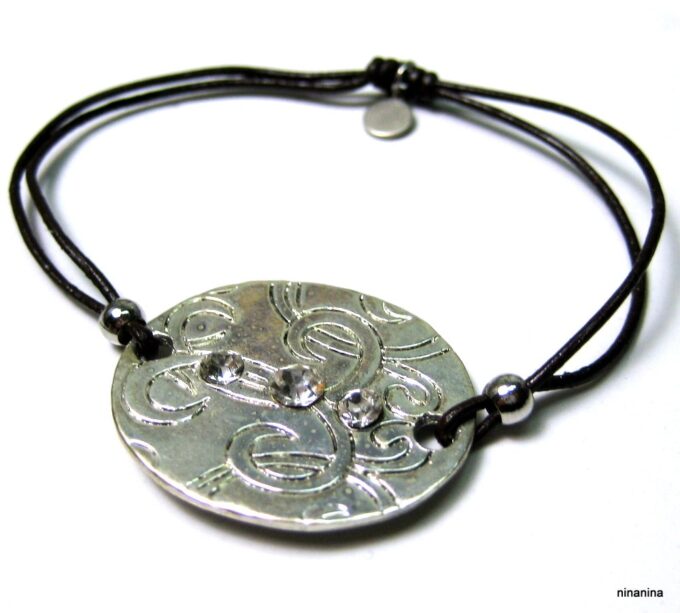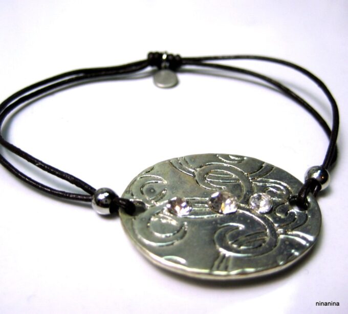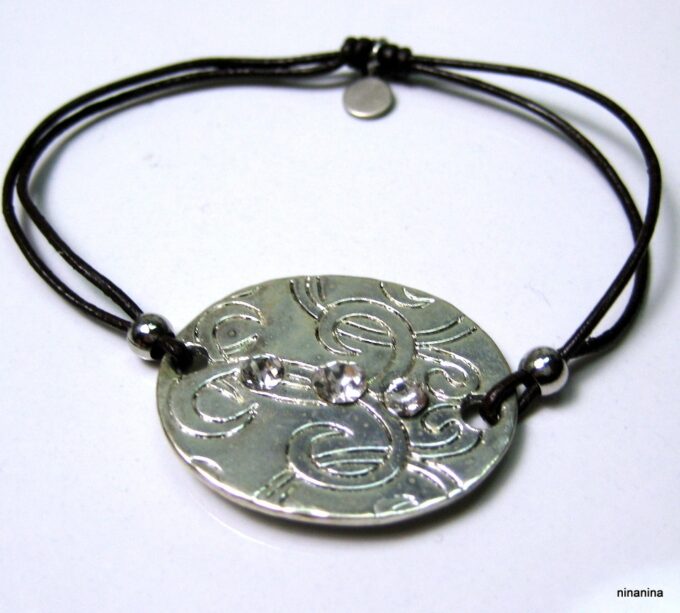 Bracelet cordon métal argenté composé d’une estampe ovale en métal argenté réhaussée de 3 petits strass montée sur cordon de coton ciré. Existe en noir, marron chocolat, gris, blanc cassé, turquoise, rouge et rose. Existe aussi avec un cordon cuir. Diamètre : 5 cm env réglable par liens coulissants. Livré dans sa pochette d’organza. Bijou 100% fait-main.