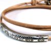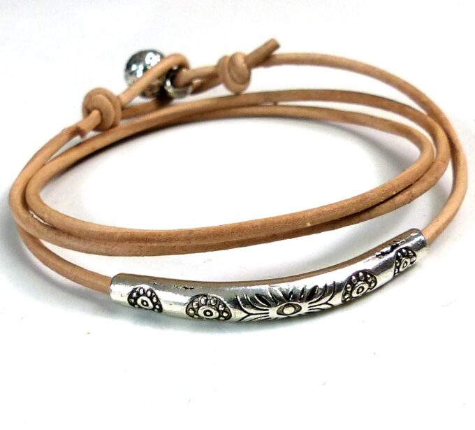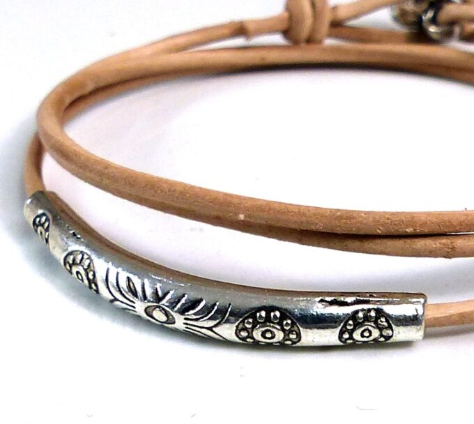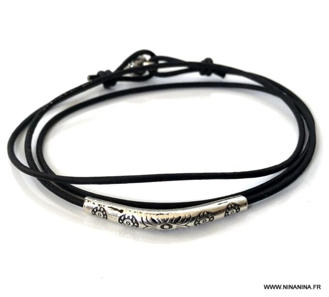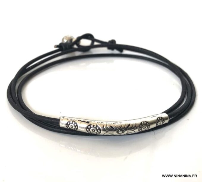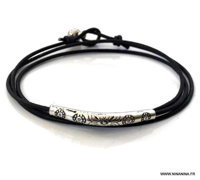 Ajoutez une touche bohème à votre tenue avec ce discret mais élégant Bracelet femme cordon réglable cuir perle tube fleur boheme composé d’une perle tube incurvée gravée de délicats motifs d’inspiration bohème montée sur un cordon de cuir naturel (1,5 mm de diamètre), à enrouler autour du poignet.
