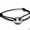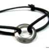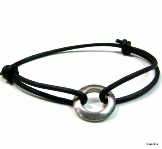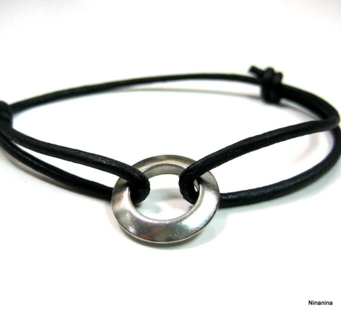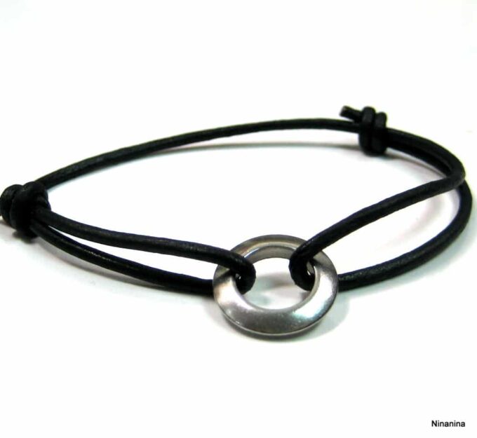 Bracelet anneau homme ou femme cordon cuir Acier composé d’un anneau rond en acier inoxydable monté sur un cordon de cuir noir (2 mm de diamètre). Diamètre de l’anneau : 1,8 cm. Fermeture par liens coulissants. Longueur : de 16 à 25 cm réglable. Livré dans sa pochette d’organza. Bijou 100% fait main.