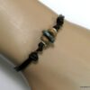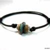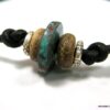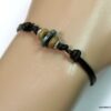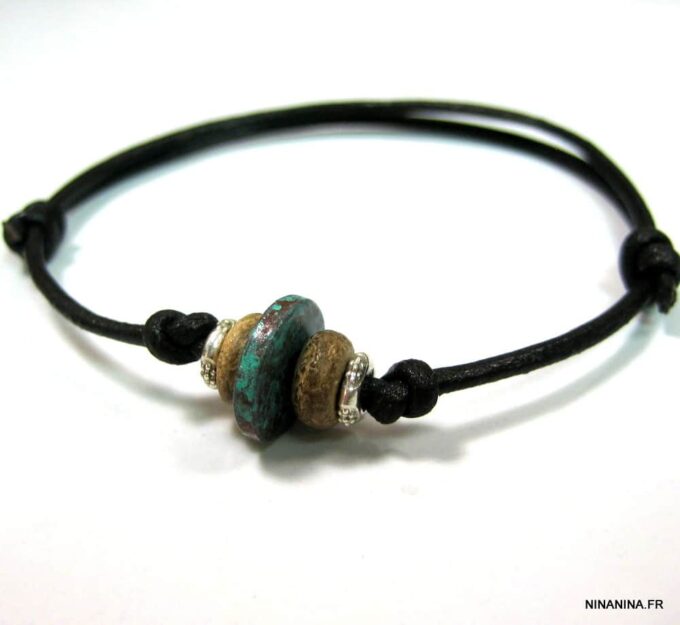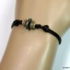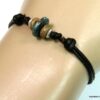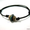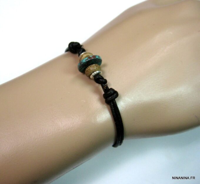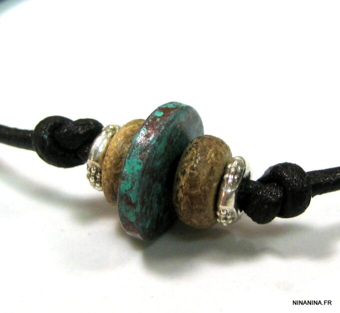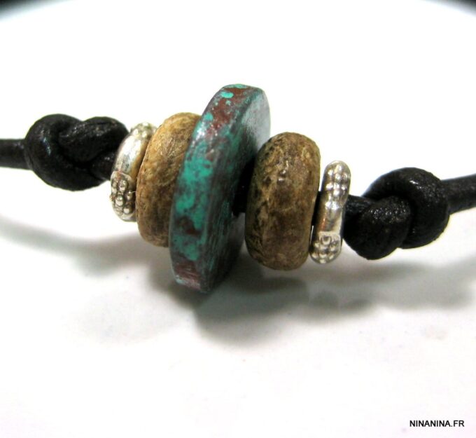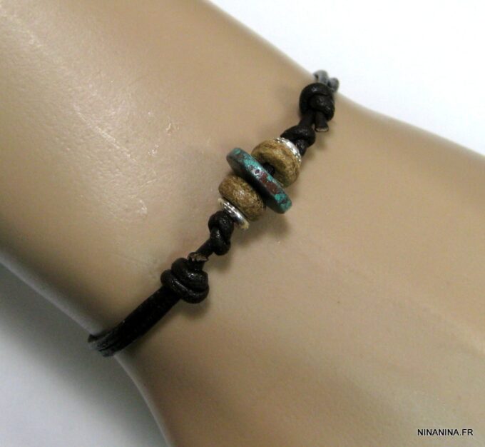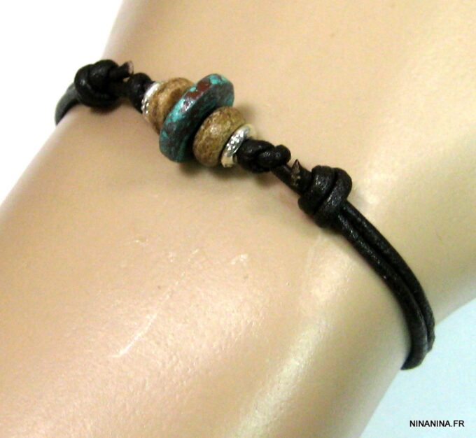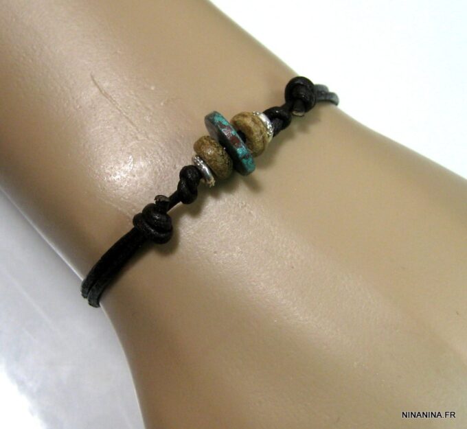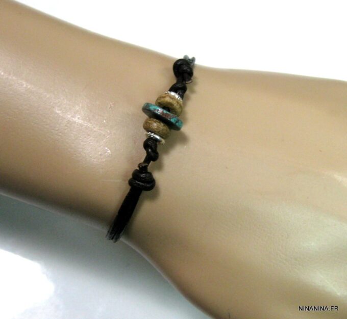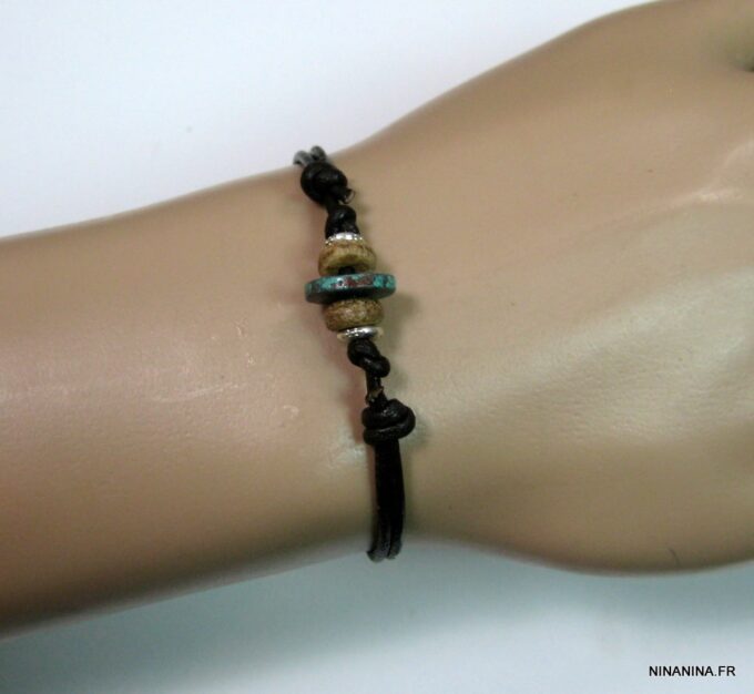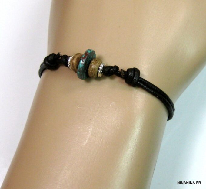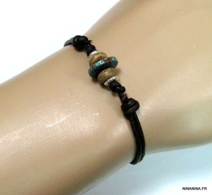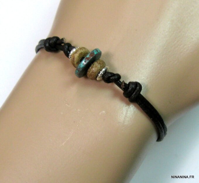 Bracelet homme Cordon cuir Argent et turquoise naturelle composé de rondelles en argent 925 et en bois montées sur un cordon de cuir noir (2mm de diamètre).