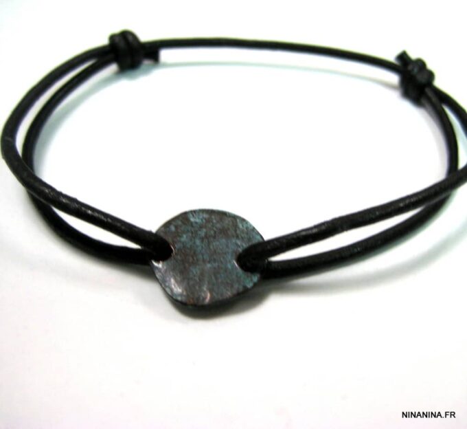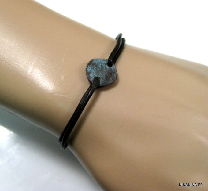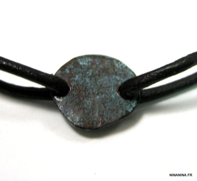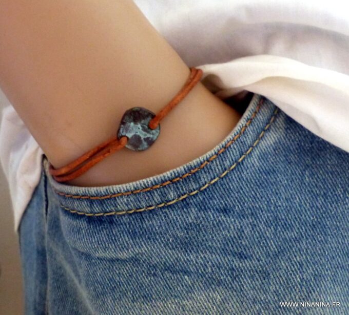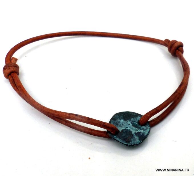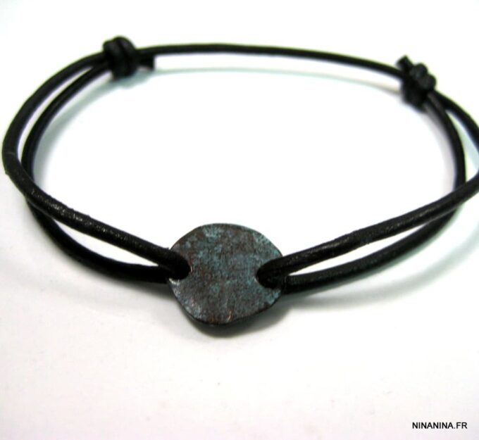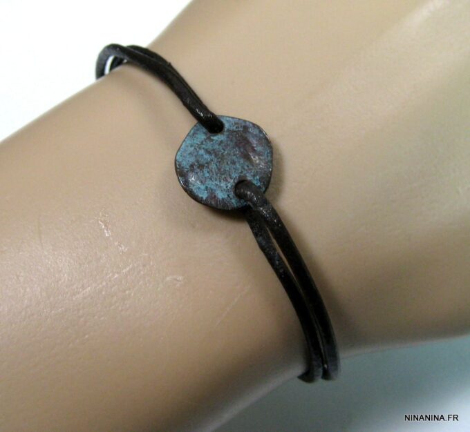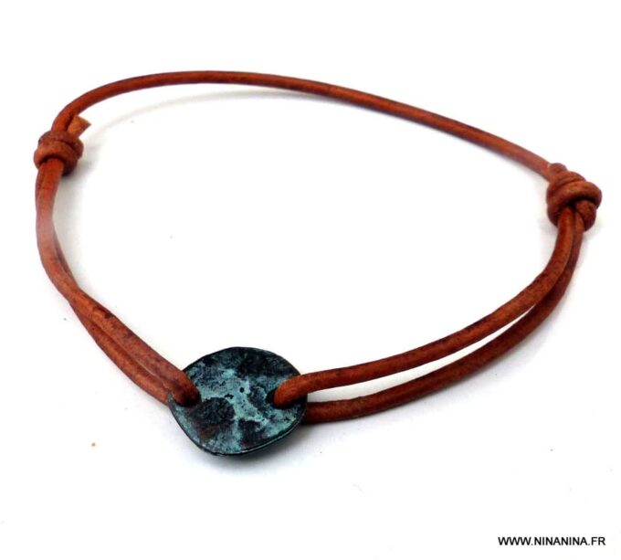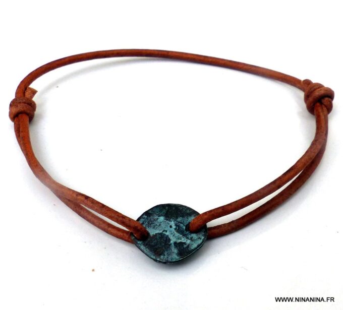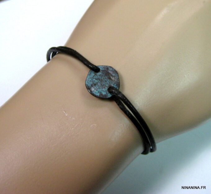Bracelet homme cordon cuir disque turquoise composé d’un disque en métal bronze patiné turquoise martelé monté sur un cordon de cuir naturel (2mm de diamètre).