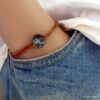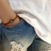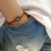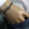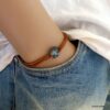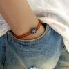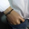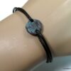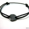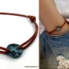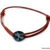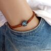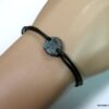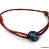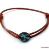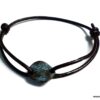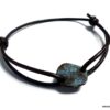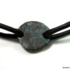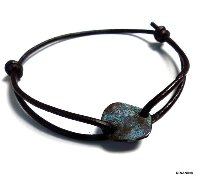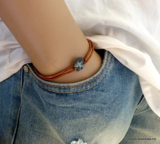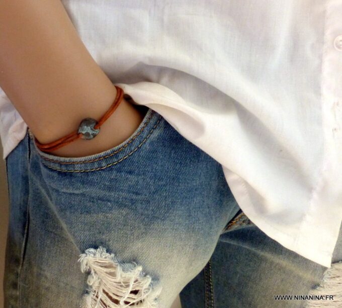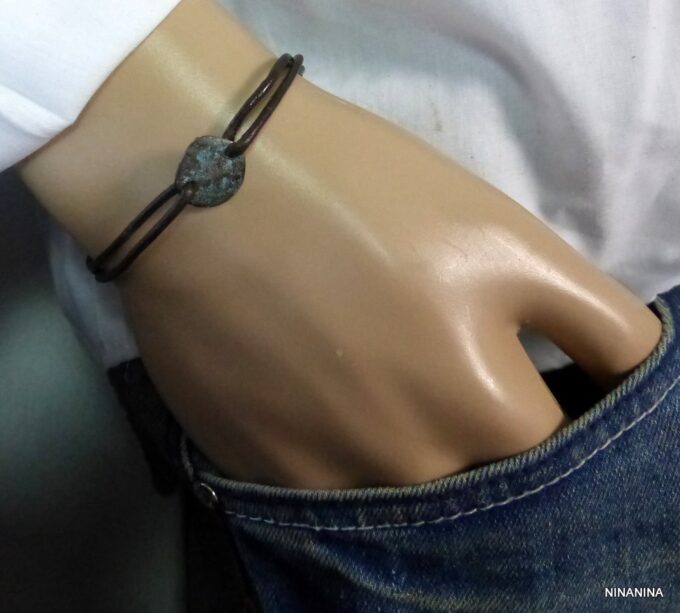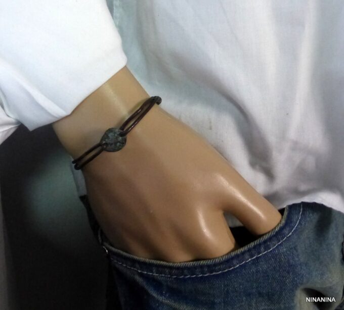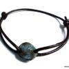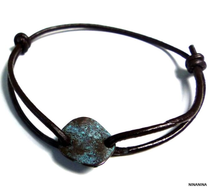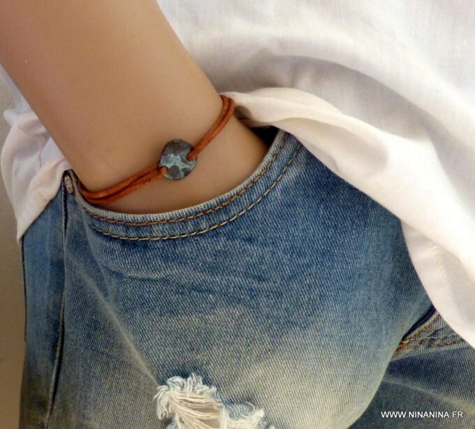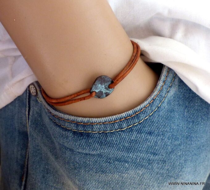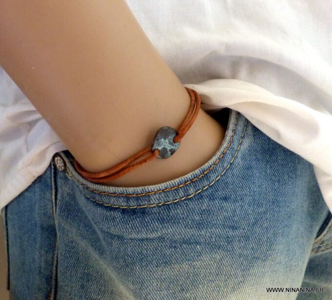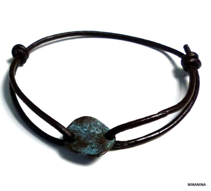 Bracelet homme cordon cuir disque turquoise composé d’un disque en métal bronze patiné turquoise martelé monté sur un cordon de cuir naturel (2mm de diamètre).