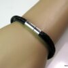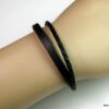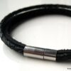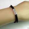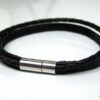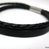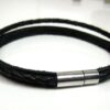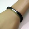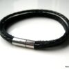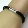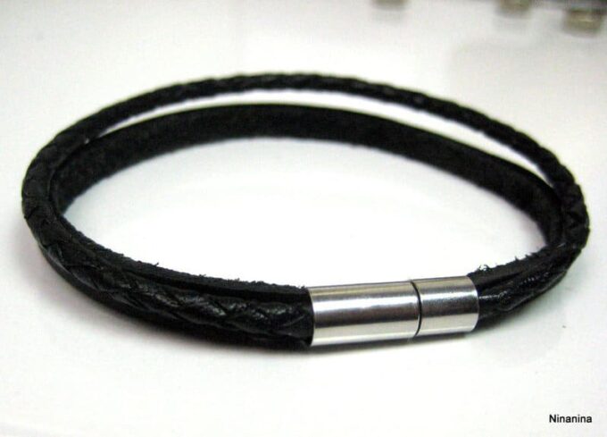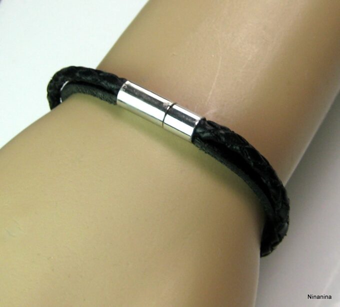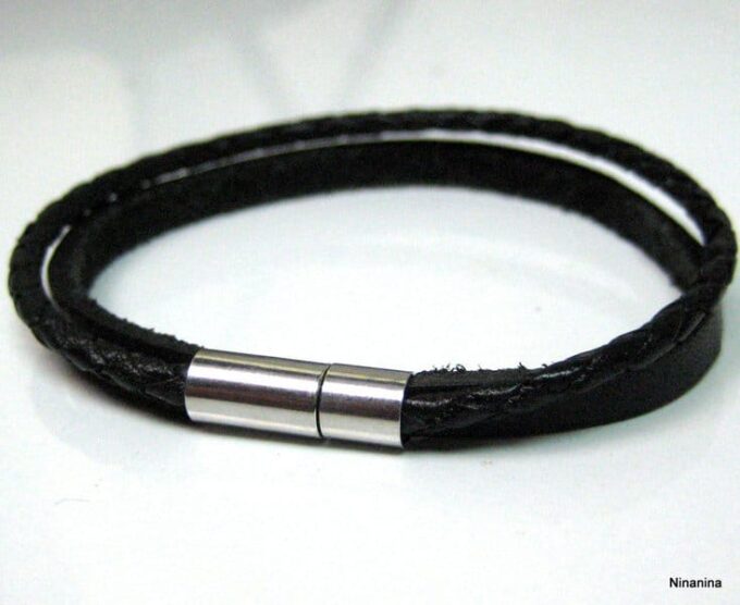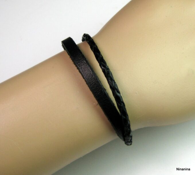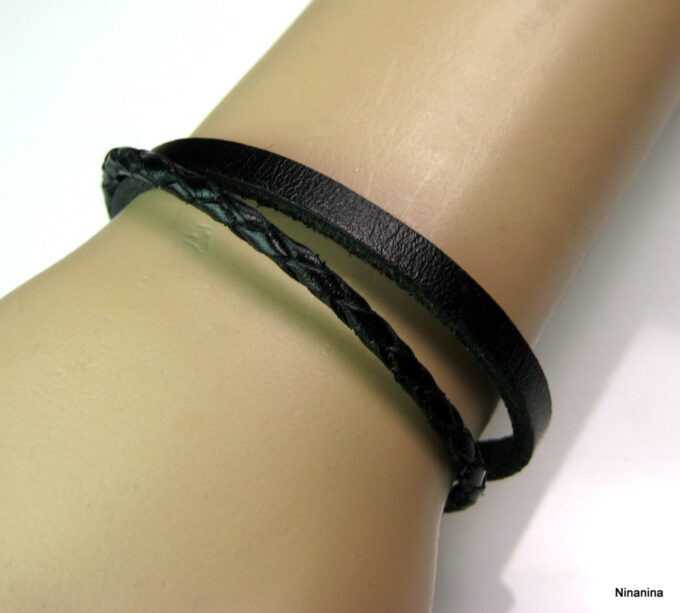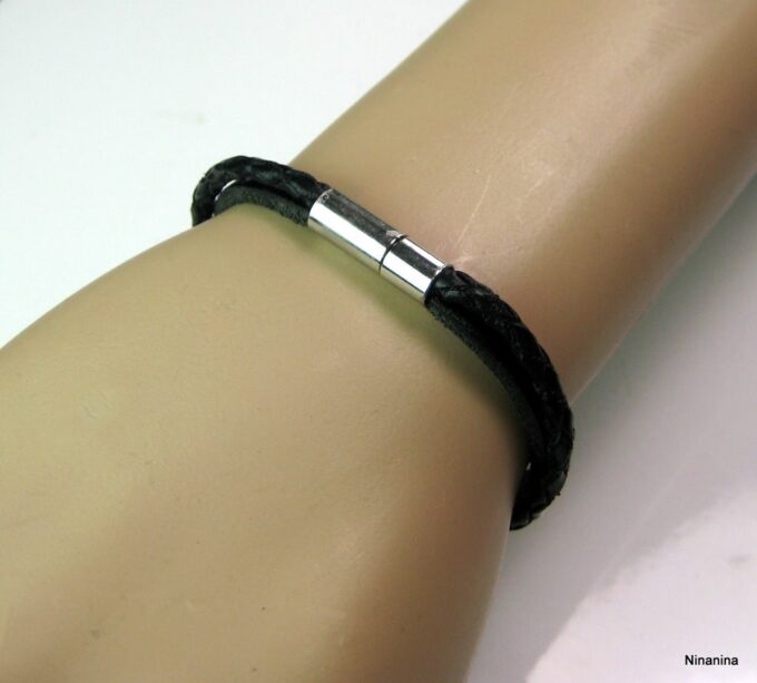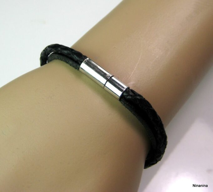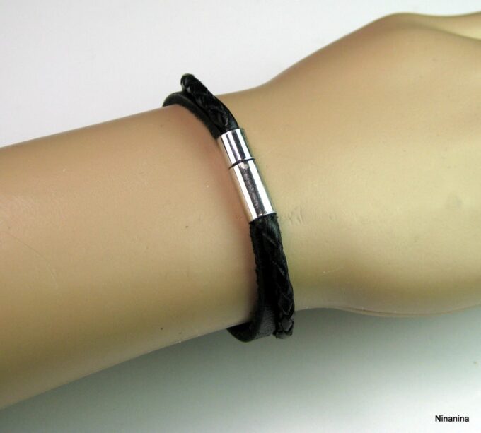 Bracelet original cordon cuir noir fermoir Acier argent composé d’une lanière de cuir noire (0,5 cm de large) et d’un cordon de cuir tressé noir (0,3 cm de diamètre). Fermoir cylindrique en acier inoxydable. Longueur totale (fermoir compris): 21 cm (homme) et 19 cm (femme). TOUTE AUTRE LONGUEUR POSSIBLE – longueur souhaitée à indiquer en commentaire. Livré dans sa pochette d’organza. Bijou 100% fait main.