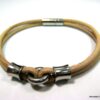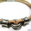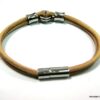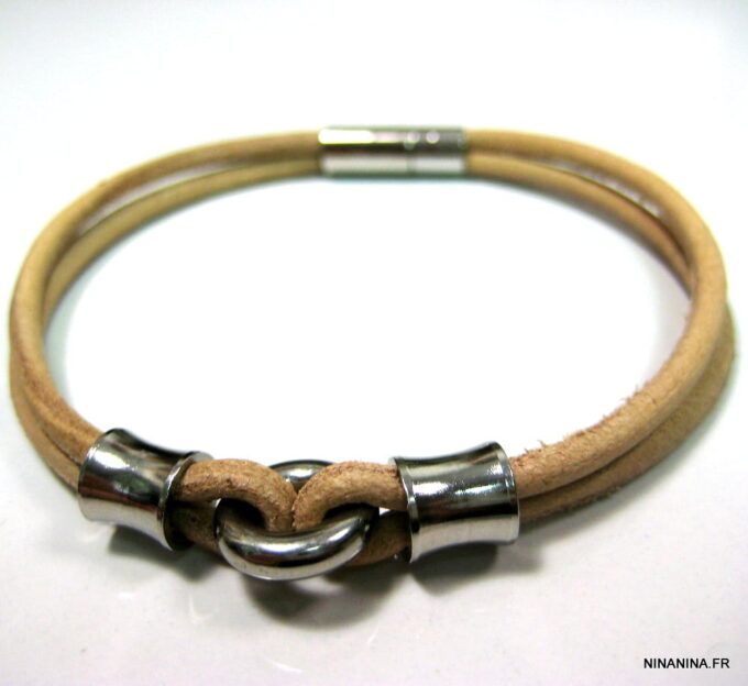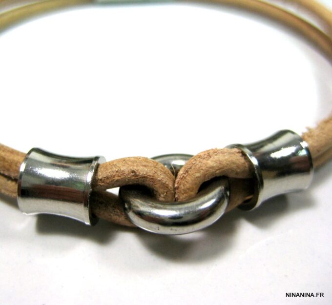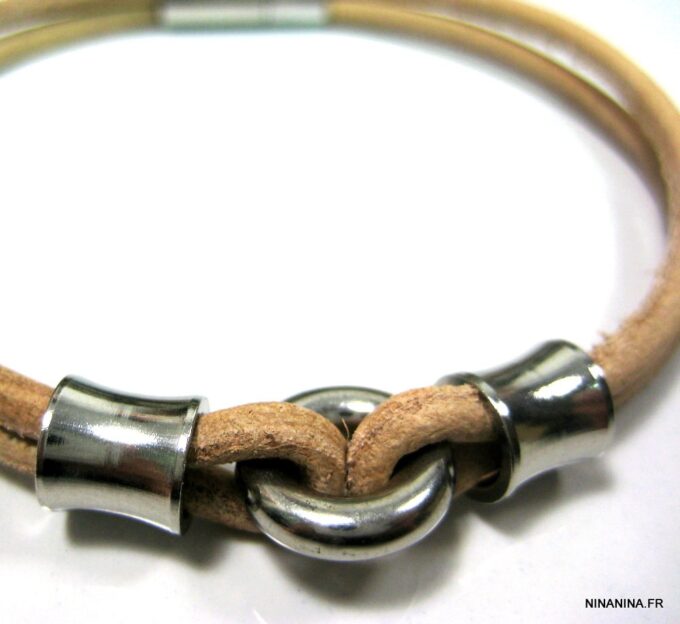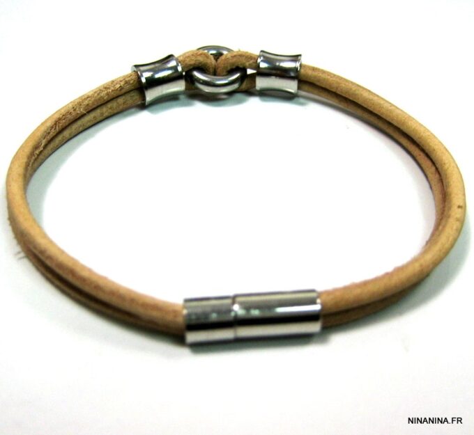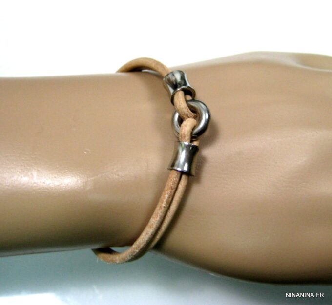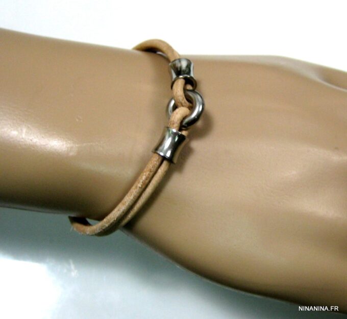 Bracelet cordon cuir homme anneau Acier inoxydable argent composé d’une rondelle et de deux tube en acier inoxydable montés sur un double cordon de cuir naturel (3mm de diamètre). Diamètre de la rondelle : 1,2 cm. Fermoir cylindrique. Longueur totale (fermoir compris): 21 cm (homme) et 19 cm (femme). TOUTE AUTRE LONGUEUR POSSIBLE – longueur souhaitée à indiquer en commentaire. Existe aussi avec une perle blanche. Livré dans sa pochette d’organza. Bijou 100% fait main.