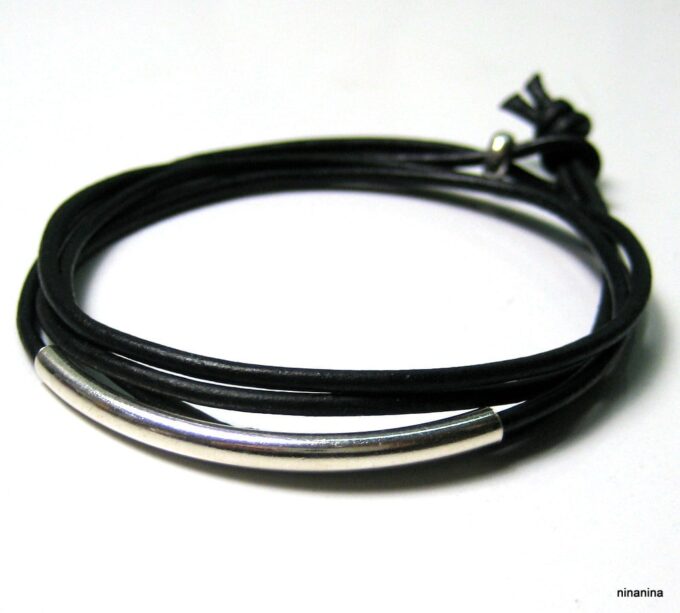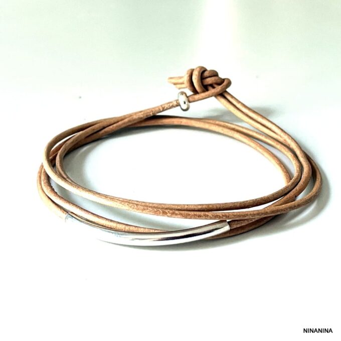 Bracelet Cordon Femme Tendance Cuir Enroulé Et perle cylindrique en Argent 925 Fait Main En France