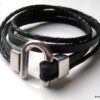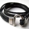 Bracelet fer a cheval homme métal argenté cordon cuir composé d’une lanière de cuir noire (0,5 cm de large) et d’un cordon de cuir tressé noir (0,3 cm de diamètre) à enrouler autour du poignet. Fermoir fer à cheval en métal argenté. Longueur totale (fermoir compris): 42 cm (homme) et 39 cm (femme). TOUTE AUTRE LONGUEUR POSSIBLE – longueur souhaitée à indiquer en commentaire. Livré dans sa pochette d’organza. Bijou 100% fait main.