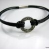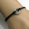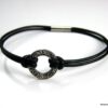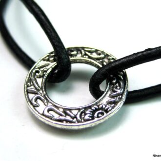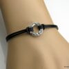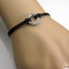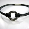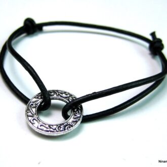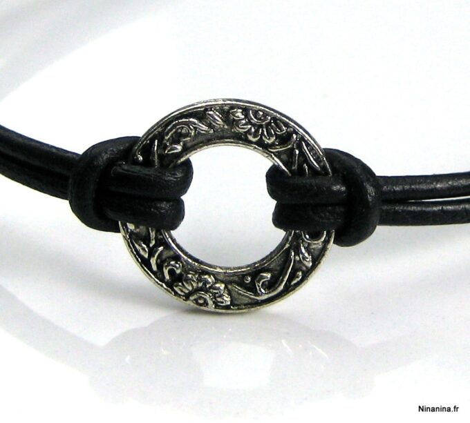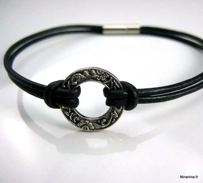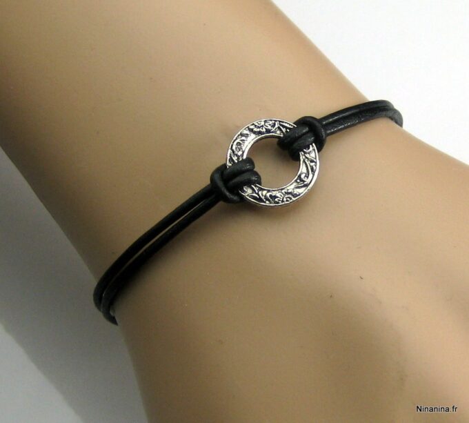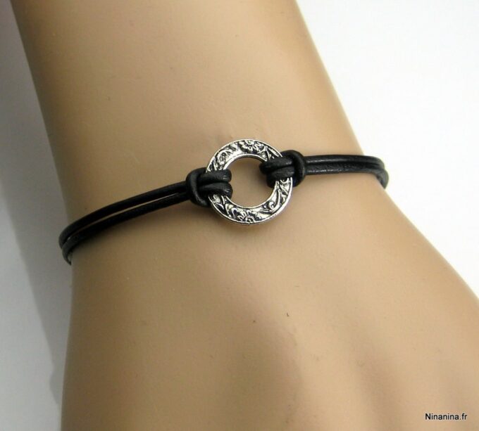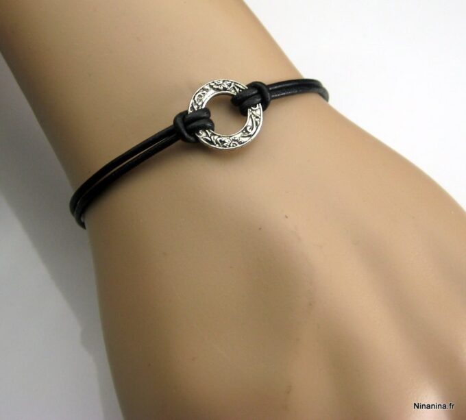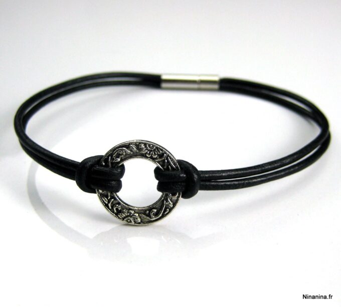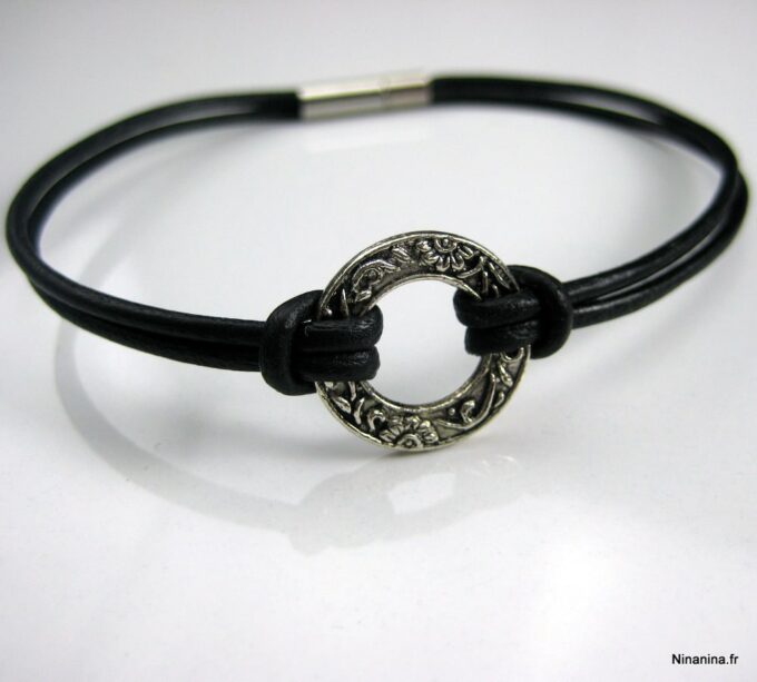 Bracelet homme cordon cuir noir disque métal argenté composé d’un anneau rond ciselé en métal argenté monté sur un double cordon de cuir noir (2 mm de diamètre). Existe en noir, marron chocolat, gris, bleu turquoise, rose foncé et naturel. Diamètre de l’anneau : 1,6 cm. Fermoir cylindrique en acier inoxydable. Longueur (fermoir compris) : 21 cm (homme) et 19 cm (femme). Livré dans sa pochette d’organza. Bijou 100% fait main.