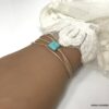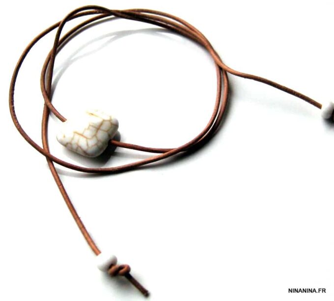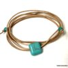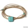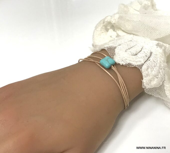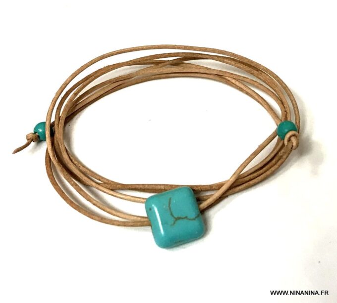 Bracelet fil cuir et perle carrée turquoise synthétique composé d’une perle carrée blanc cassé et de deux petites perles rondes en verre montées sur un cordon en cuir naturel (1mm de diamètre) à enrouler autour du poignet.