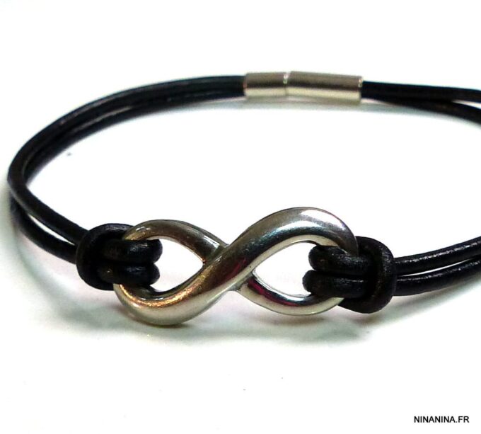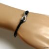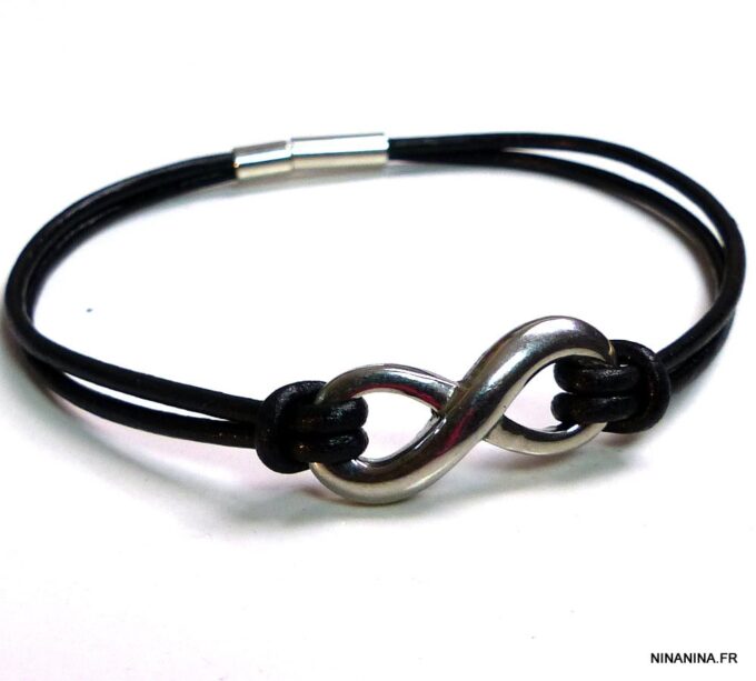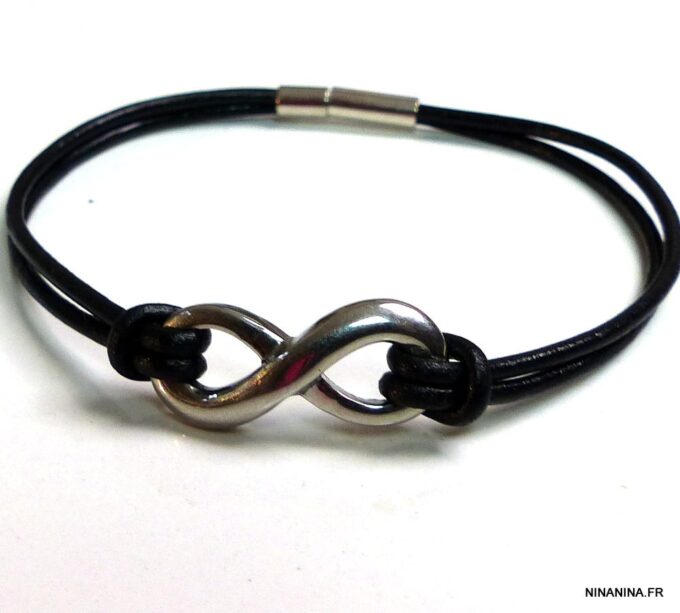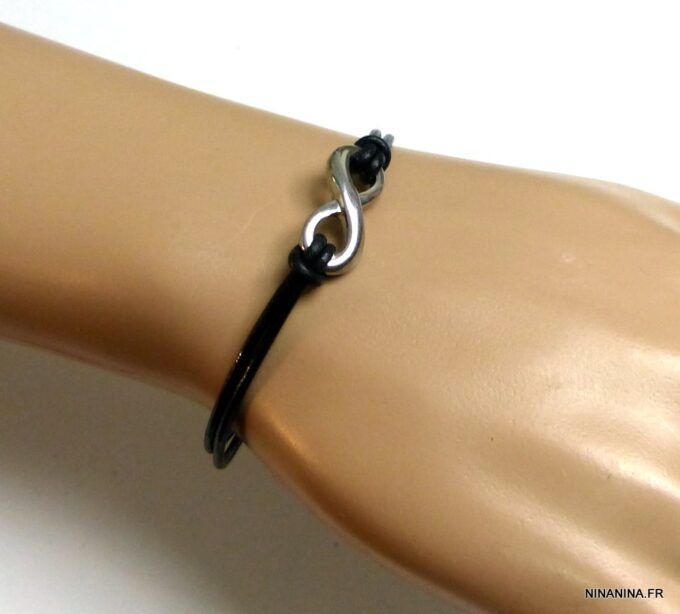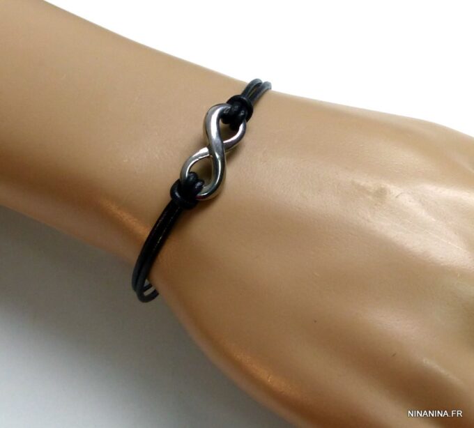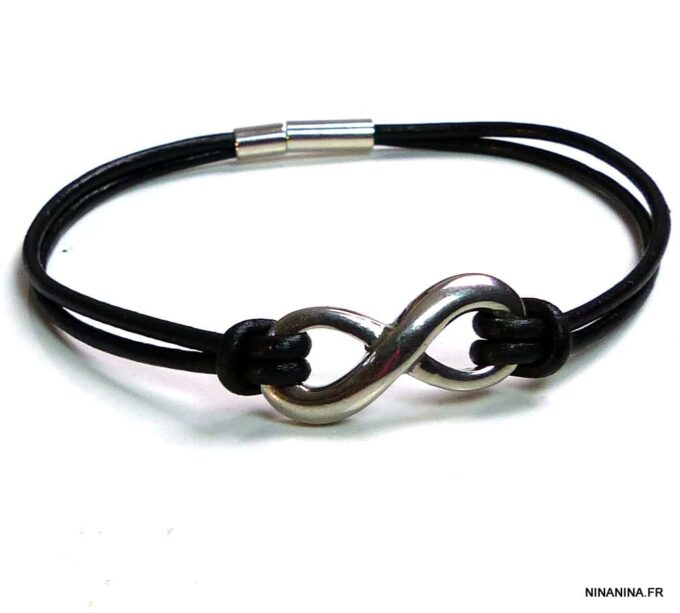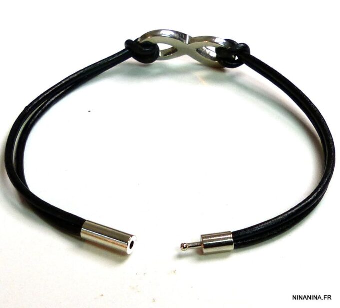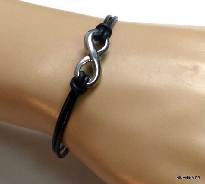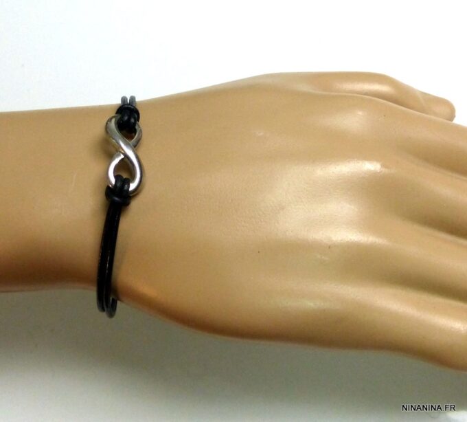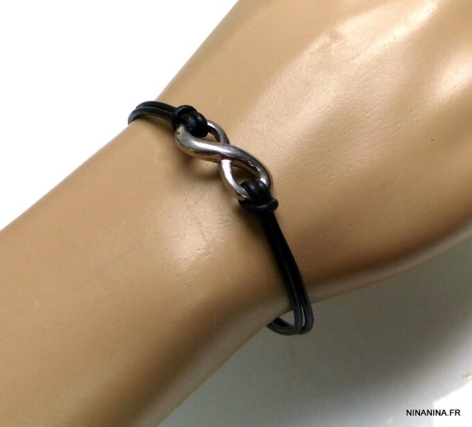 Bracelet infinité cordon cuir Acier argenté composé d’une entretoise infini en acier inoxydable montée sur un double cordon de cuir noir (2 mm de diamètre).