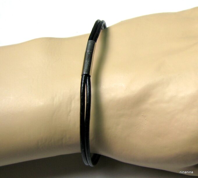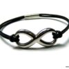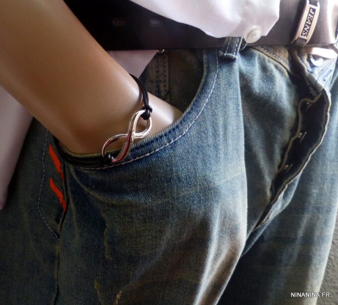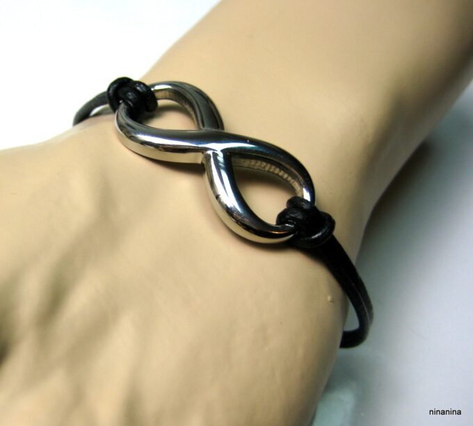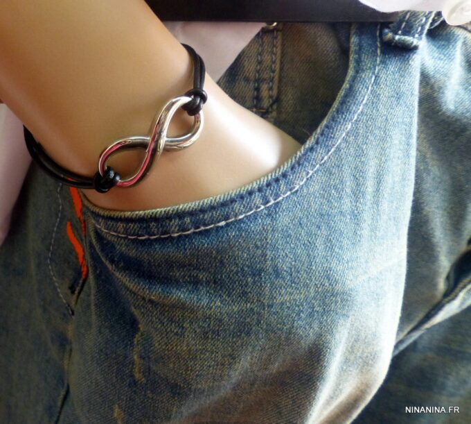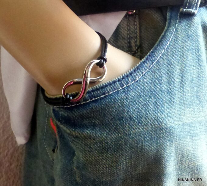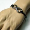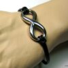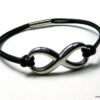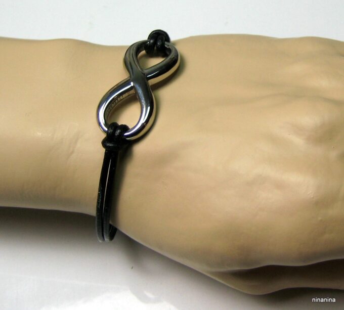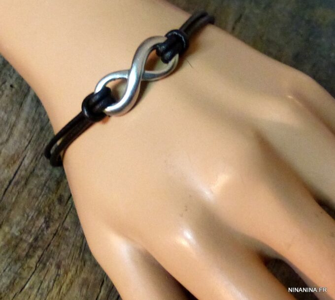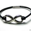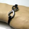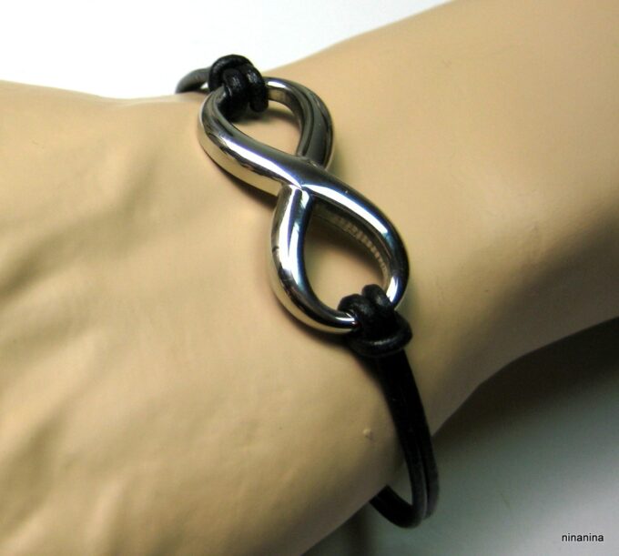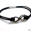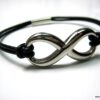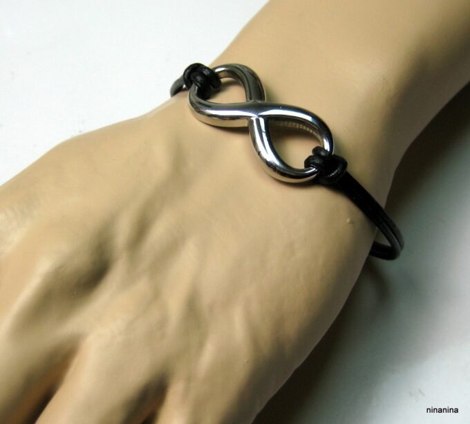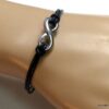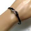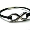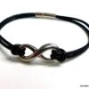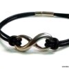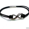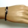 Bracelet infinité cordon cuir Acier argenté composé d’une entretoise infini en acier inoxydable montée sur un double cordon de cuir noir (2 mm de diamètre).