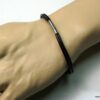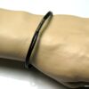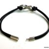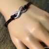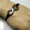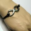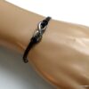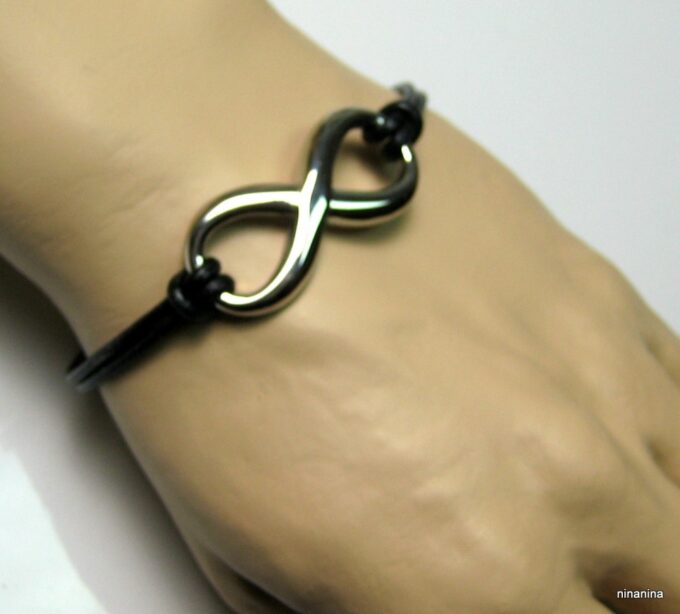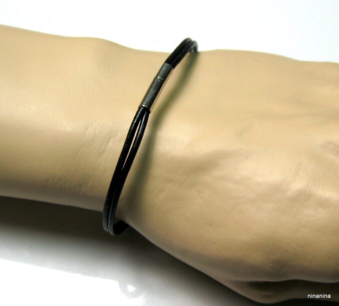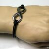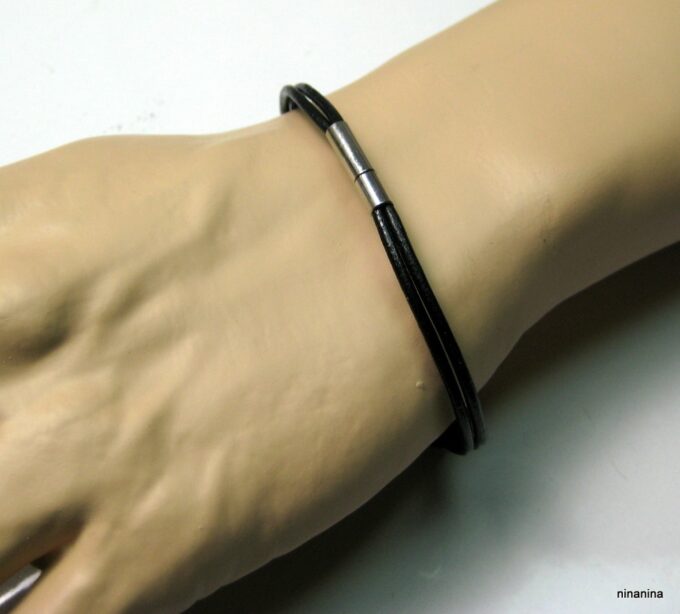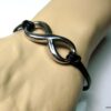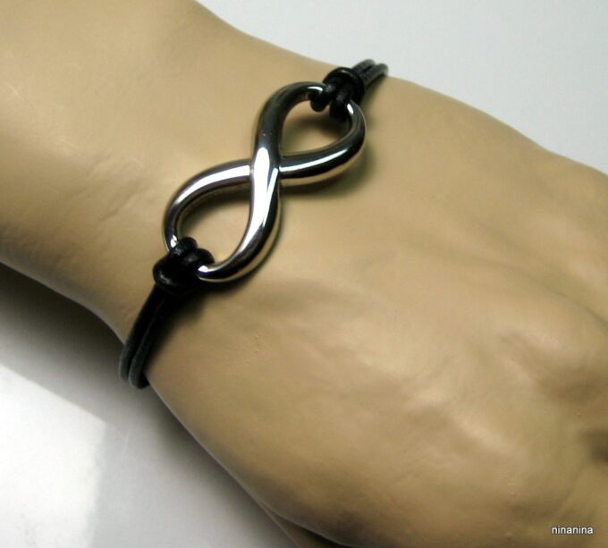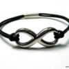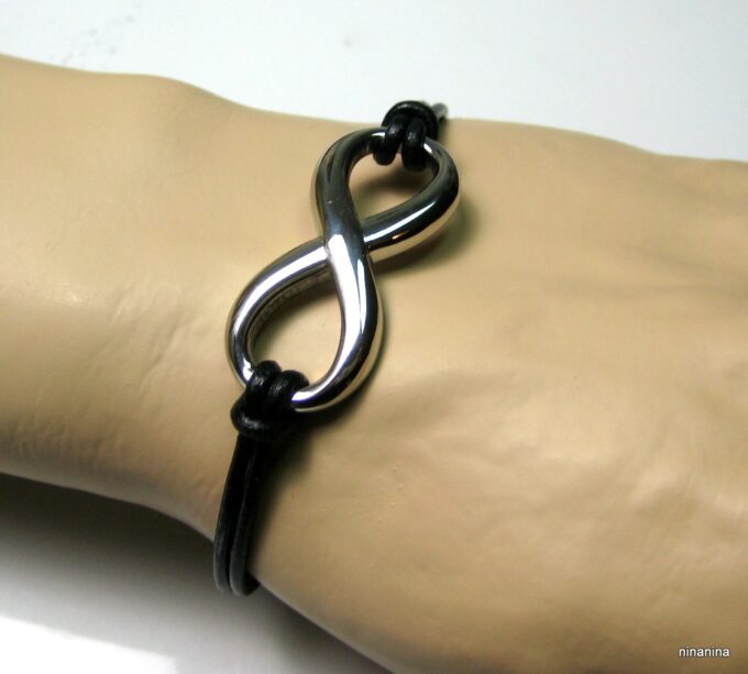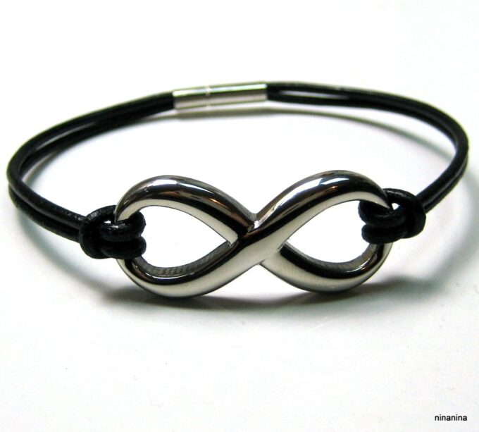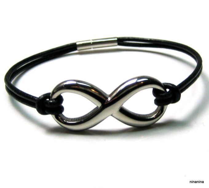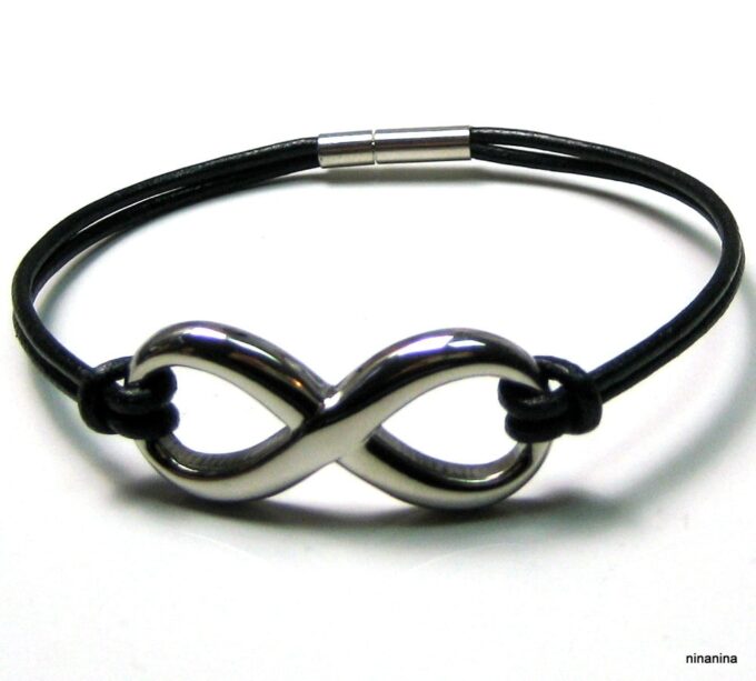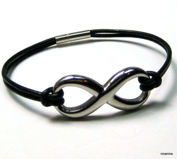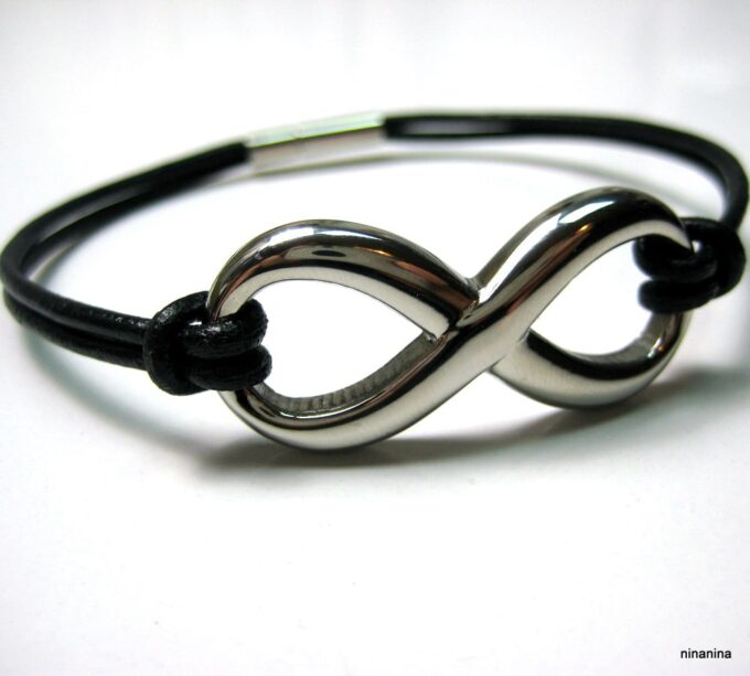 Bracelet infinité cordon cuir Acier argenté composé d’une entretoise infini en acier inoxydable montée sur un double cordon de cuir noir (2 mm de diamètre).