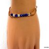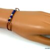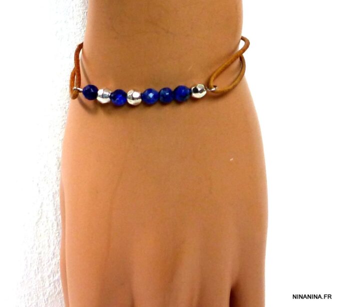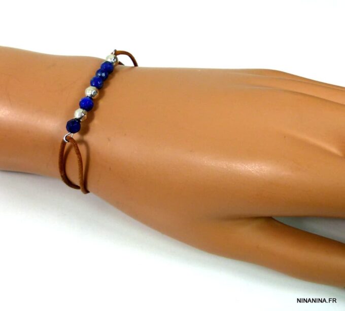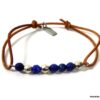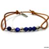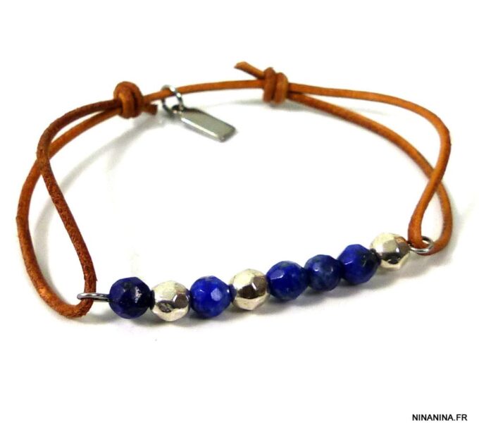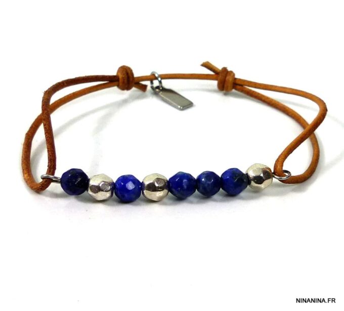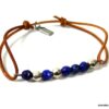 Bracelet cordon cuir lapis lazuli composée de perles rondes facettées lapis lazzuli et de rondelles en acier inoxydable montées sur un cordon de cuir caramel (1,5 mm de diamètre). Diamètre des lapis lazuli : 0,6 mm. Fermeture par liens coulissants. Longueur ajustable de 17 à 32 cm env. Livré dans sa pochette d’organza. Bijou 100% fait-main