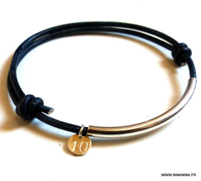 Réalisé à partir d’un cordon cuir noir solide et d’une barre demi-lune en argent 925 massif, ce Bracelets noeuds coulissants est agrémenté d’une petite médaille personnalisable gravée à la main (initiales, chiffre, symbole…).