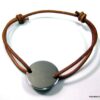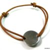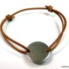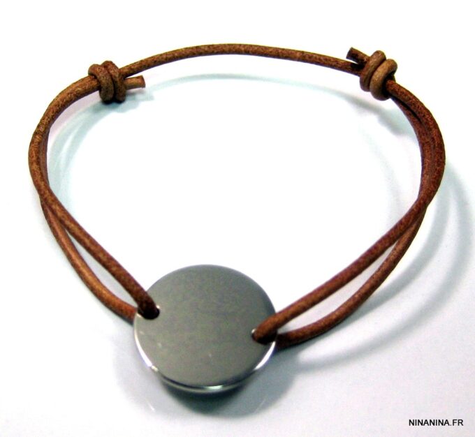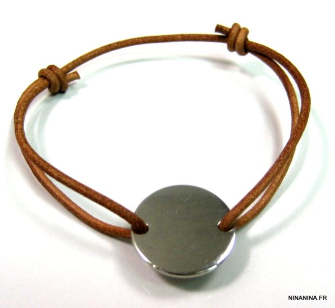 Bracelet cordon cuir composé d’un disque et d’une petite breloque ronde en métal argenté montés sur un cordon en cuir véritable (2mm de diamètre). Diamètre du disque : 2 cm. Existe en noir, marron chocolat, gris, naturel et rouge. Diamètre : 5 cm env réglable Livré dans sa pochette d’organza.