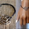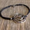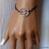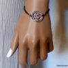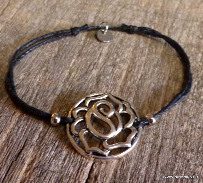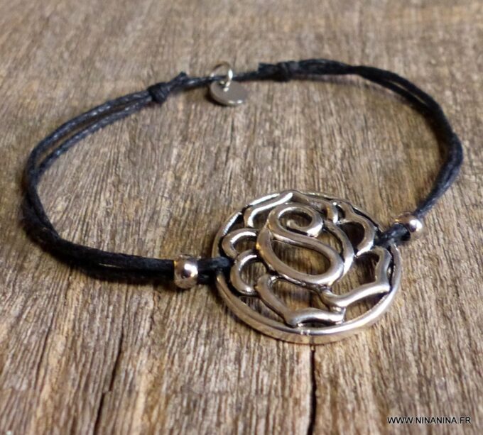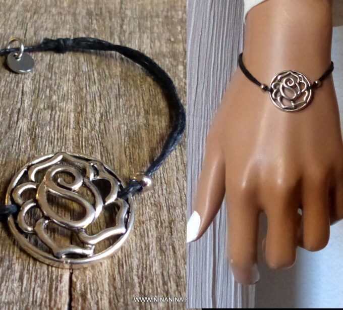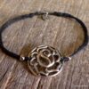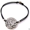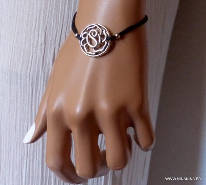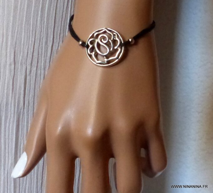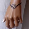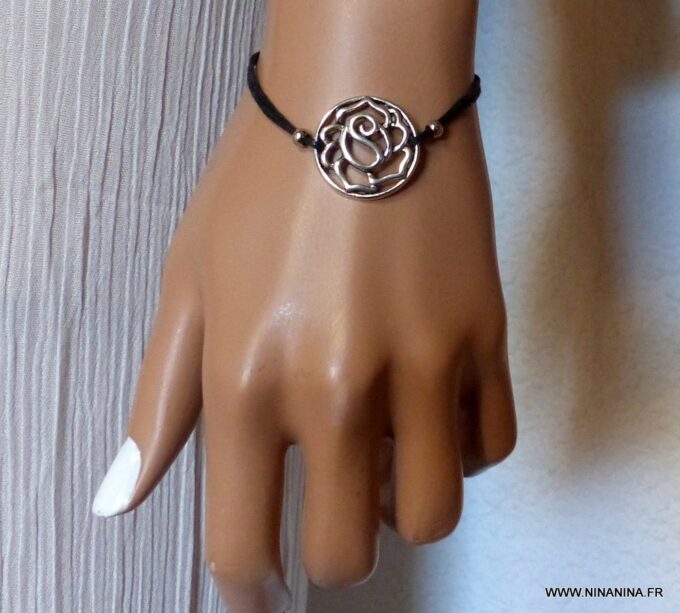Bracelet femme cordon fleur métal argenté composé d’une estampe fleur ronde ajourée, de deux petites perles et d’une pastille ronde en métal argenté montées sur un cordon en coton ciré (1mm de diamètre).