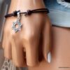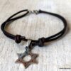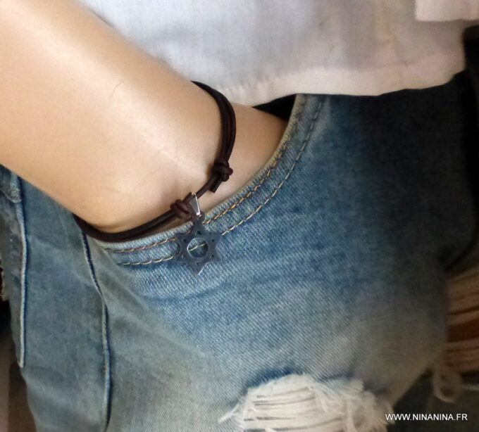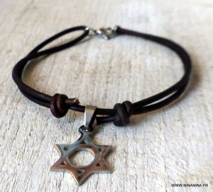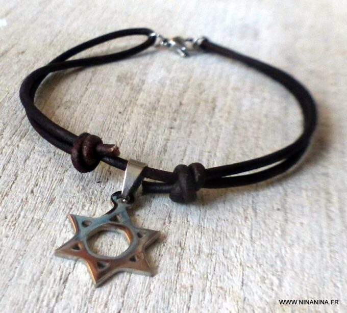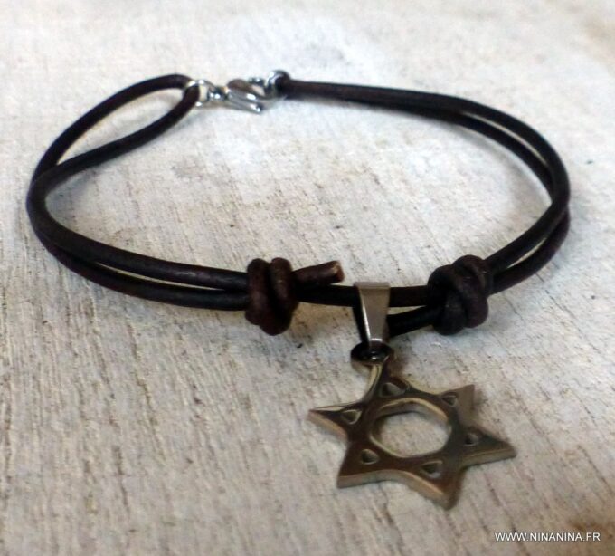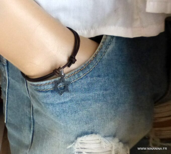 Vous serez charmé par l’élégance de ce Bracelet cordon cuir pendentif Etoile de david, composé d’un pendentif étoile de david en Acier inoxydable argenté coulissant sur un cordon de cuir noir, qui apportera à votre style et votre tenue une certaine assurance ! Une connotation religieuse bien sûr, mais pas seulement, un bracelet porte bonheur très tendance! Le Cordon de cuir noir mesure 2 mm de diamètre. Le pendentif étoile de david mesure 2 X 2 cm. Le bracelet étoile de david est terminé par un fermoir mousqueton en acier, sûr et facile d’utilisation.