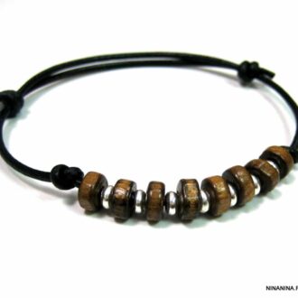 Bracelet homme perles bois argent massif composé de tubes cylindriques ciselés et de rondelles en argent 925 et de rondelles en bois turquoise et blanc cassé montées sur un cordon de cuir marron chocolat.