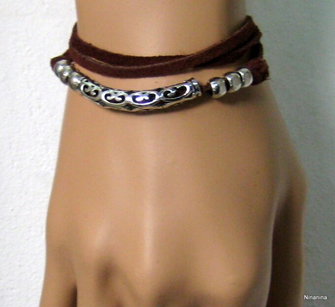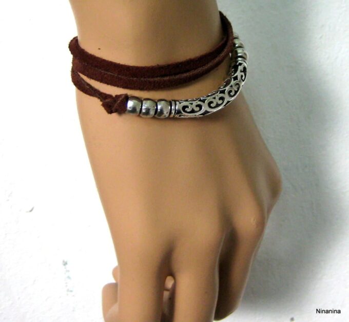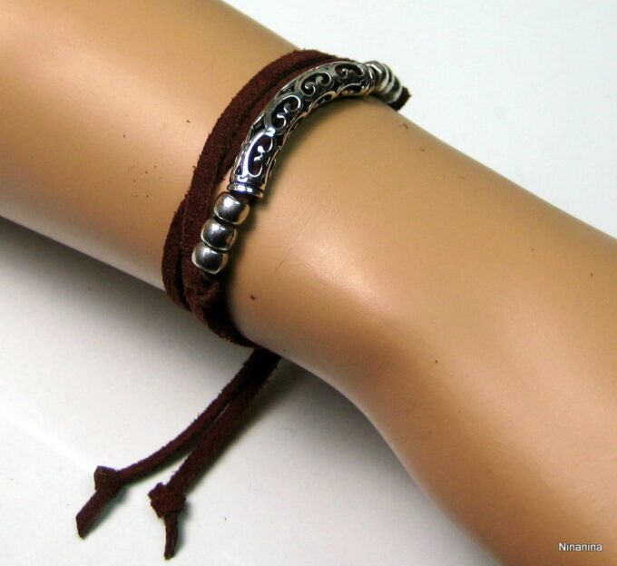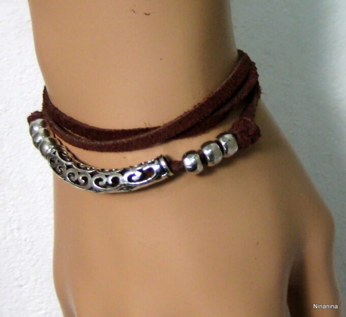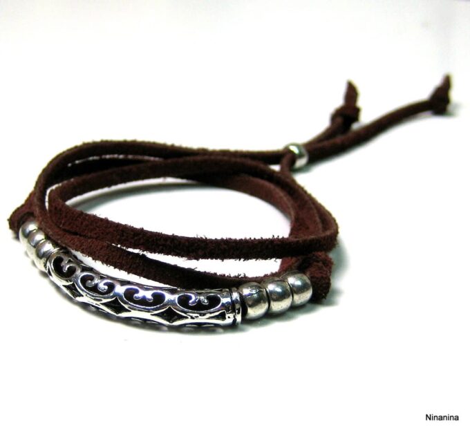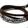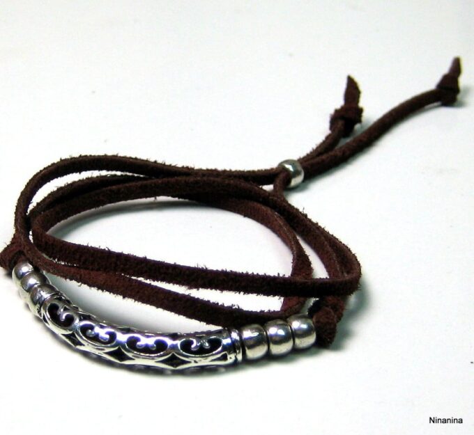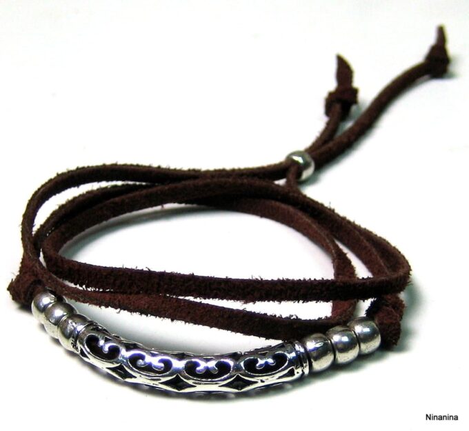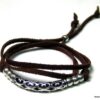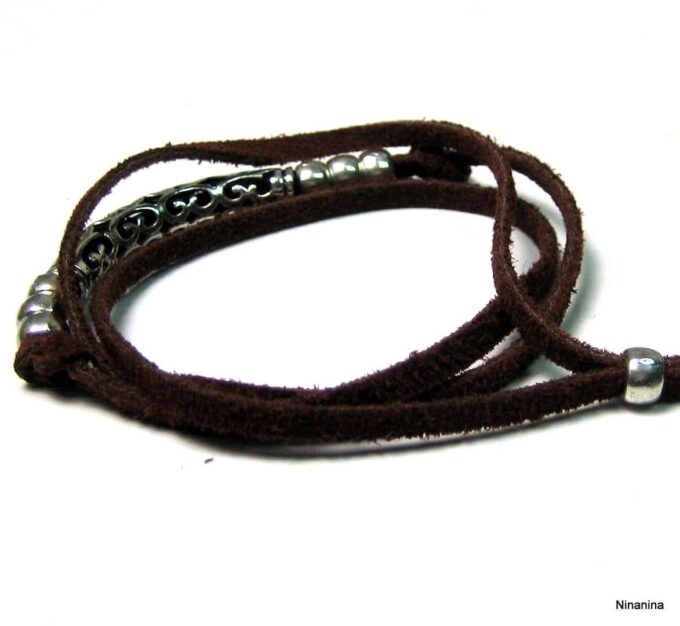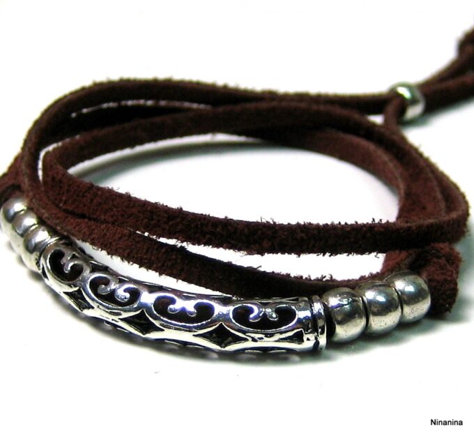 Bracelet cordon daim et métal argenté composé de rondelles en métal argenté montées sur un lacet de daim marron chocolat, à enrouler autour du poignet (3 tours). Fermeture coulissante. Longueur totale (ajustable): 60 cm env. Livré dans sa pochette d’organza. Bijou 100% fait-main