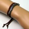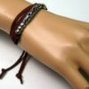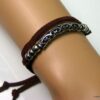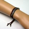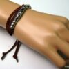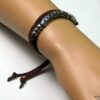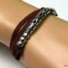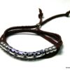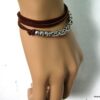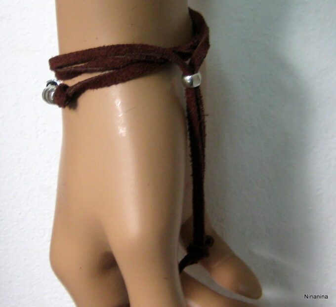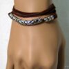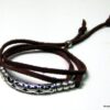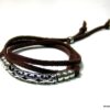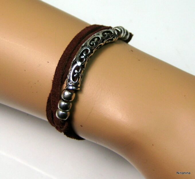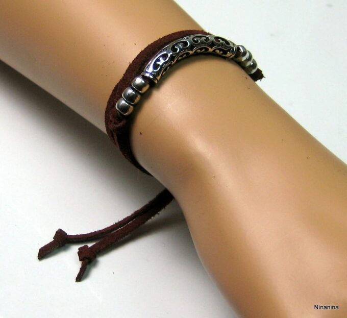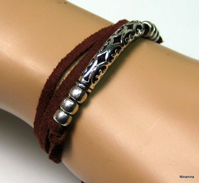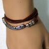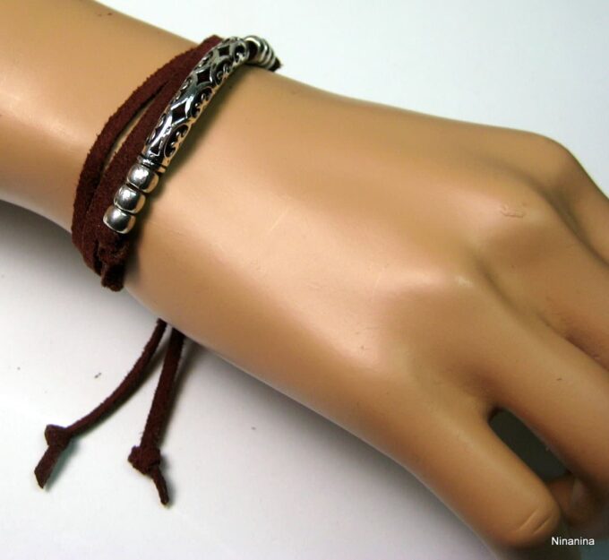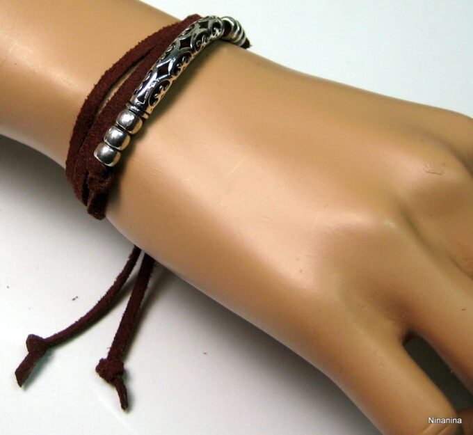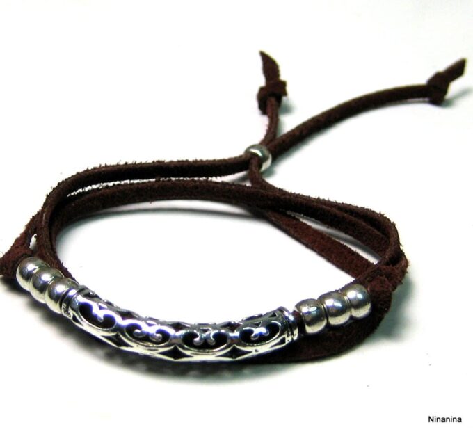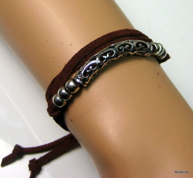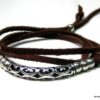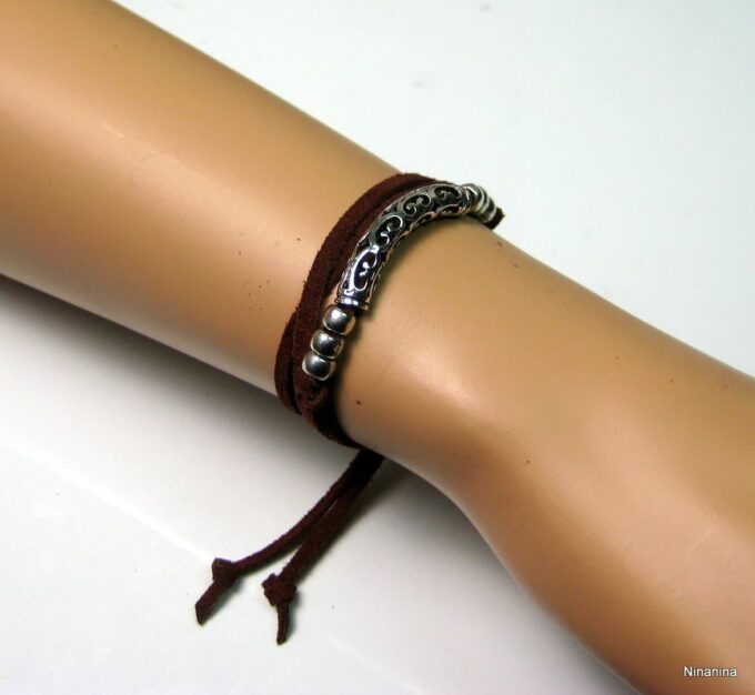 Bracelet cordon daim et métal argenté composé de rondelles en métal argenté montées sur un lacet de daim marron chocolat, à enrouler autour du poignet (3 tours). Fermeture coulissante. Longueur totale (ajustable): 60 cm env. Livré dans sa pochette d’organza. Bijou 100% fait-main