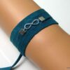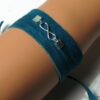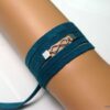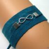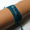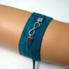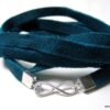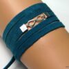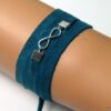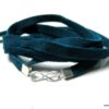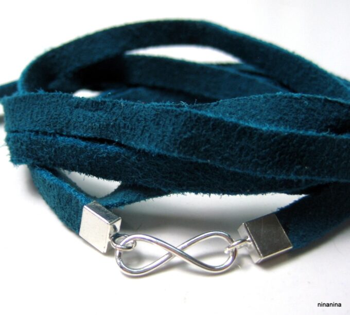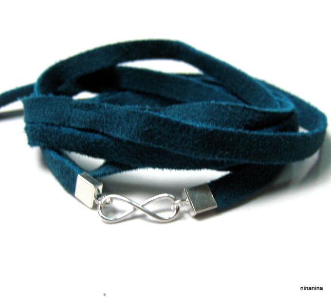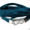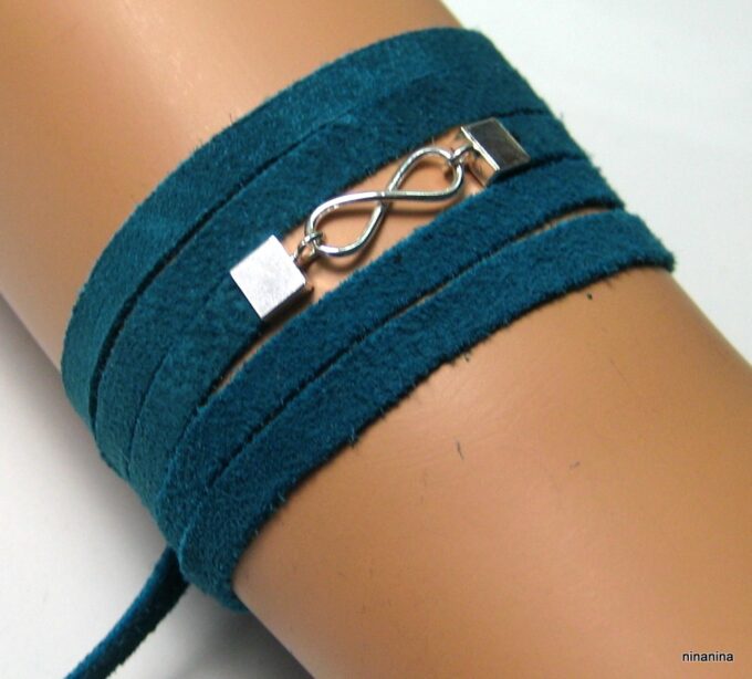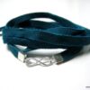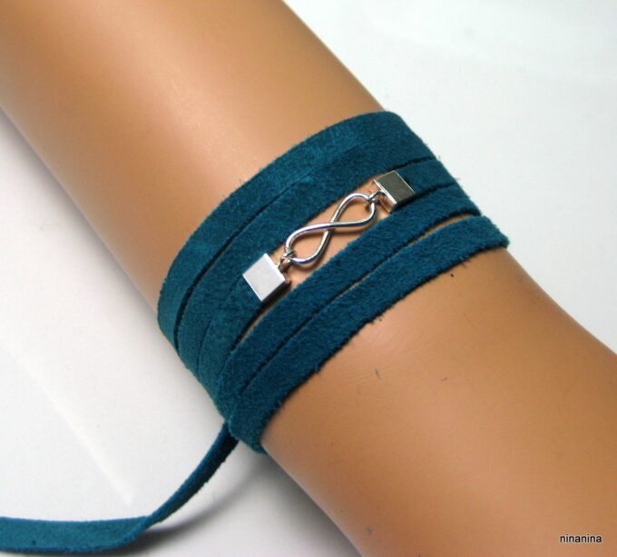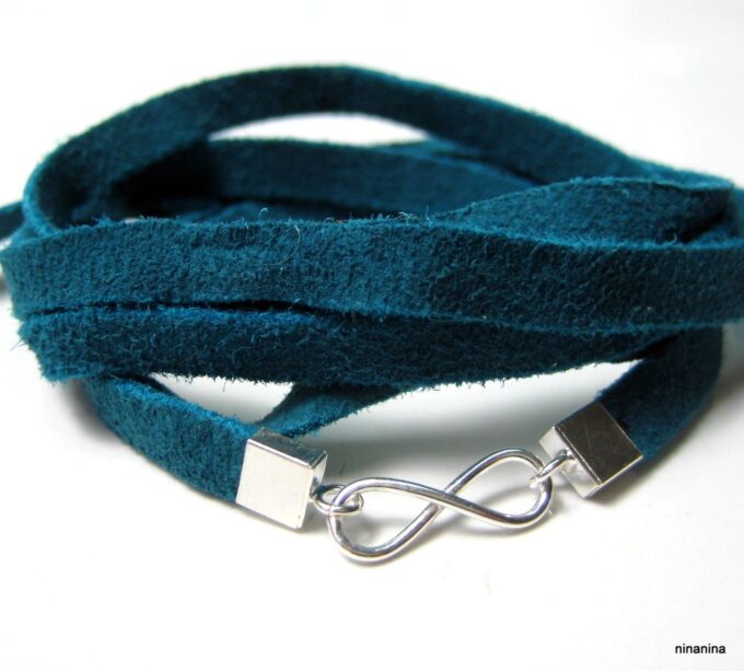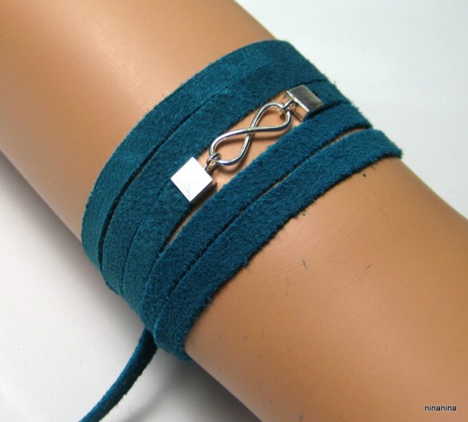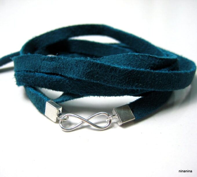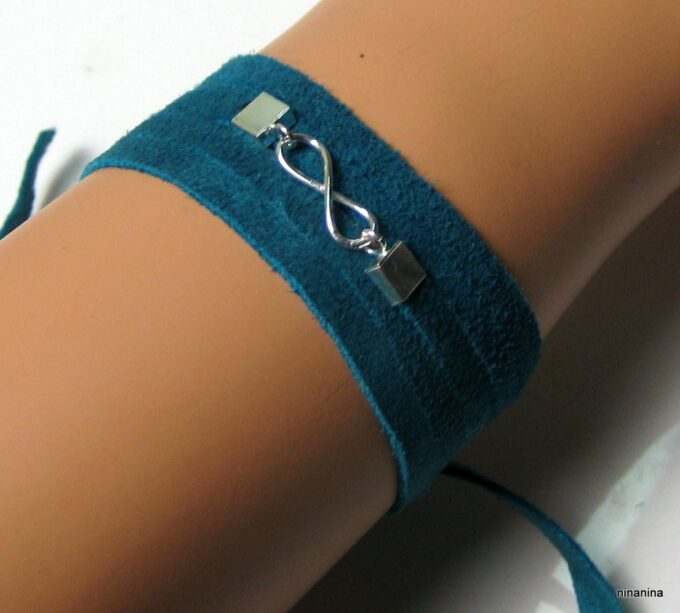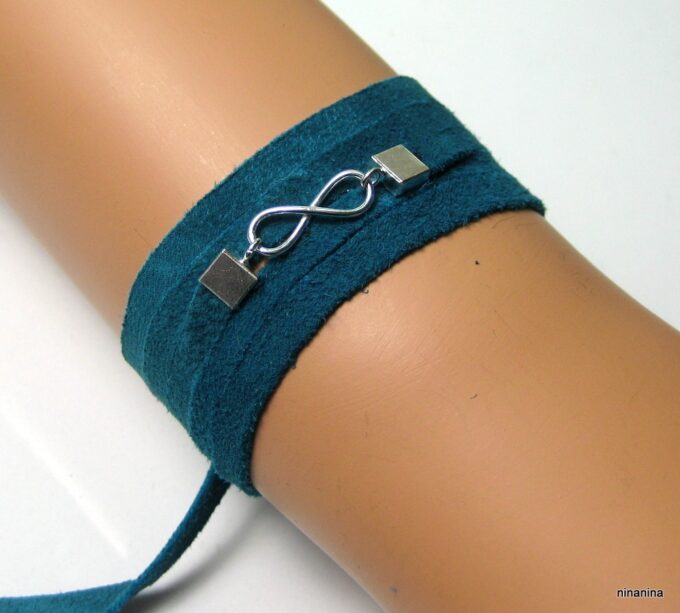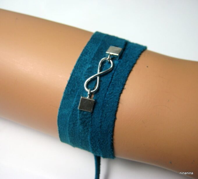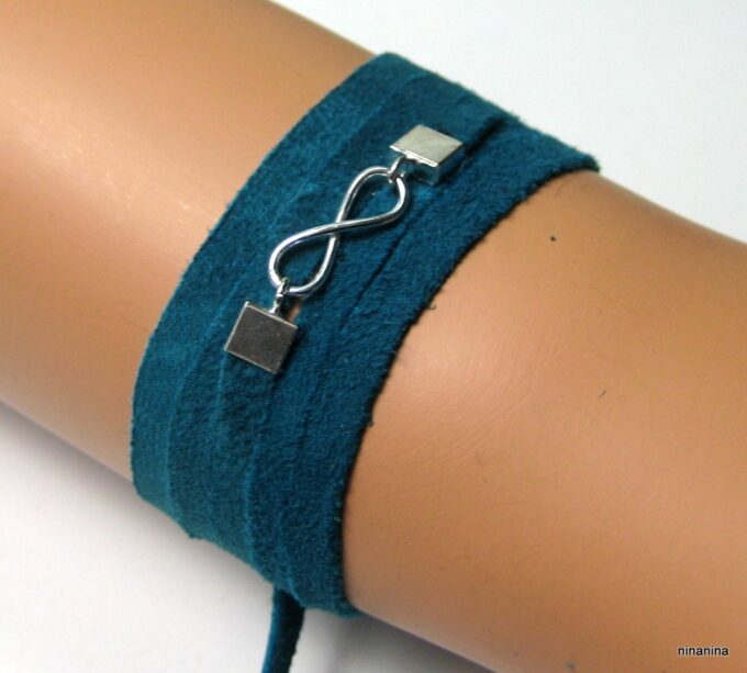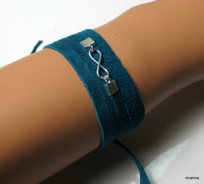 Bracelet wrap cordon daim infini argent massif composé d’une entretoise infini en argent 925 montée sur un lacet de daim turquoise, à enrouler autour du poignet (3 tours). Largeur du lacet : 5 mm.  Dim de l’entretoise : 1,5 X 0,5 cm.  Longueur : 100 cm env. Fermeture par un noeud simple. Livré dans sa pochette d’organza. Bijou 100% fait-main.  Poids : 2 g
