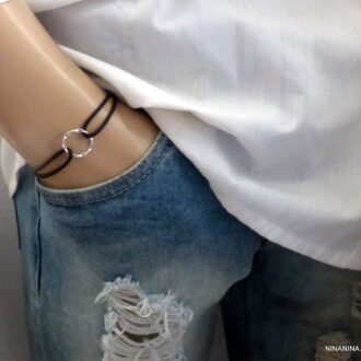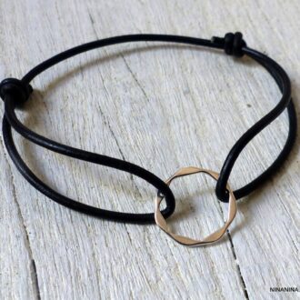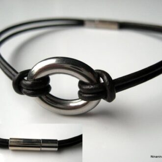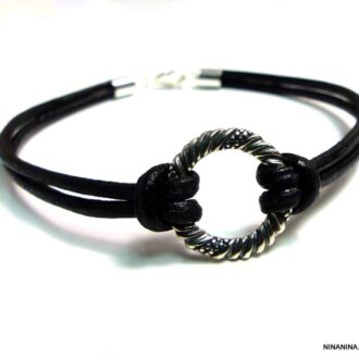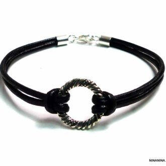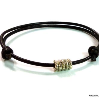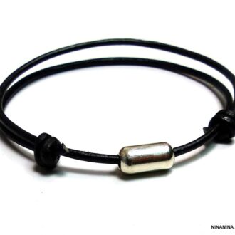 Bracelet homme cordon cuir et perles en bois? composé d’une perle cylindrique en bois marron et de perles en métal argenté et bois montées sur un cordon de cuir noir (2 mm de diamètre).