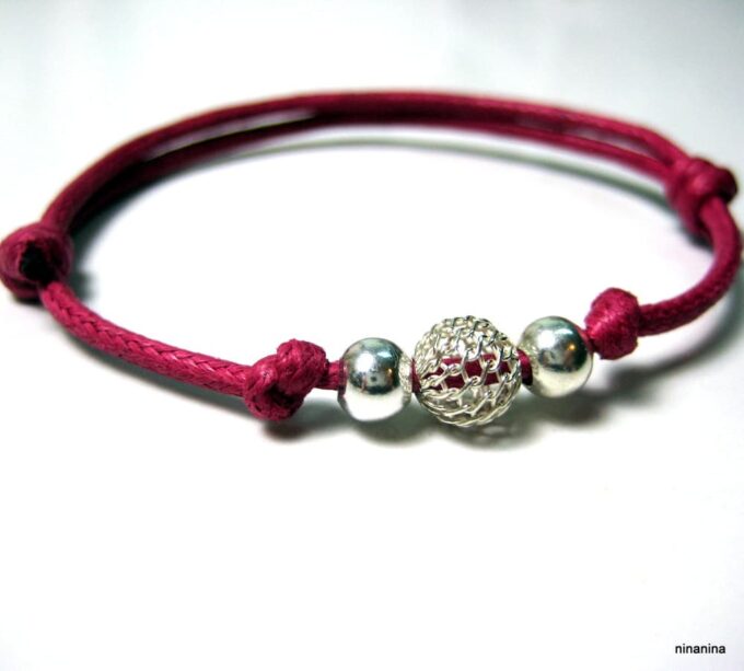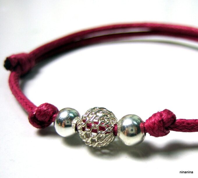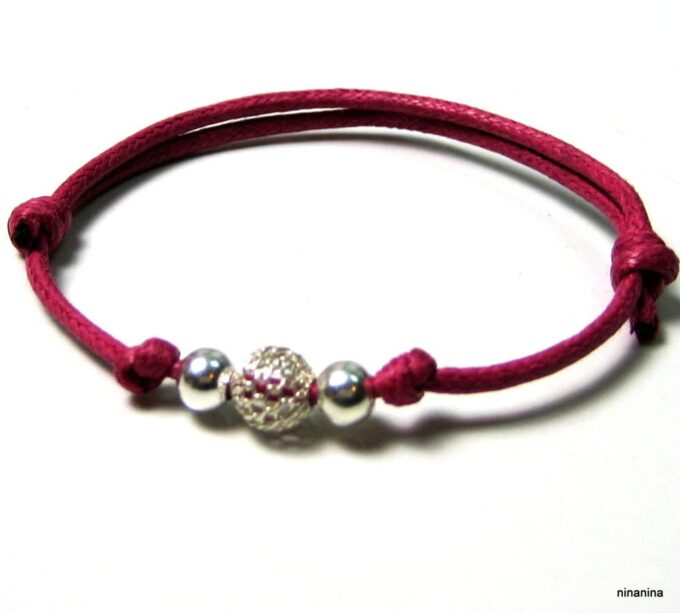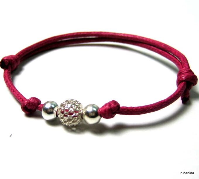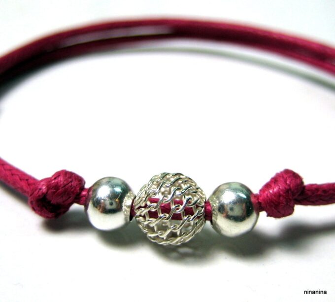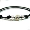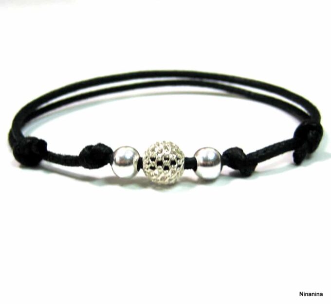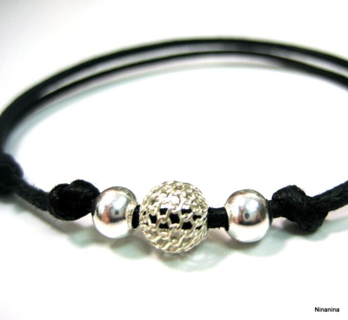 Bracelet homme cordon perles argent massif composé de perles lisses et filigranées en argent 925 montées sur un cordon en coton ciré (2mm de diamètre).