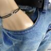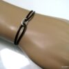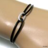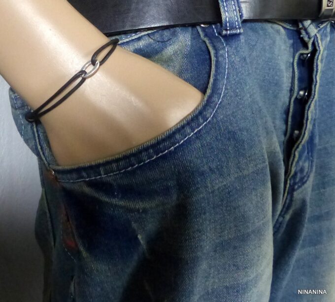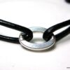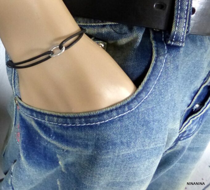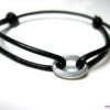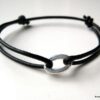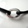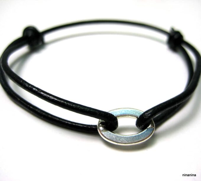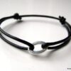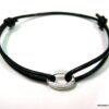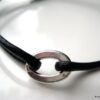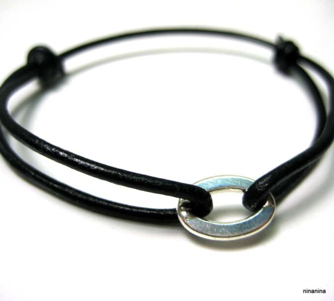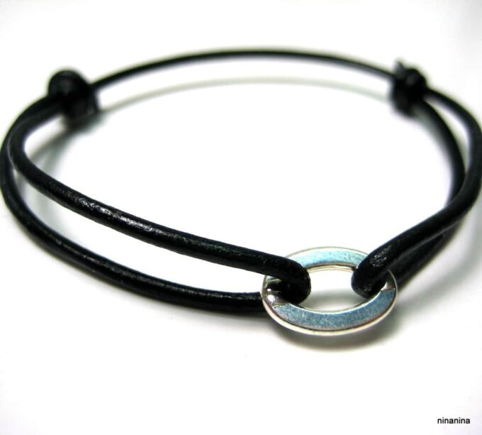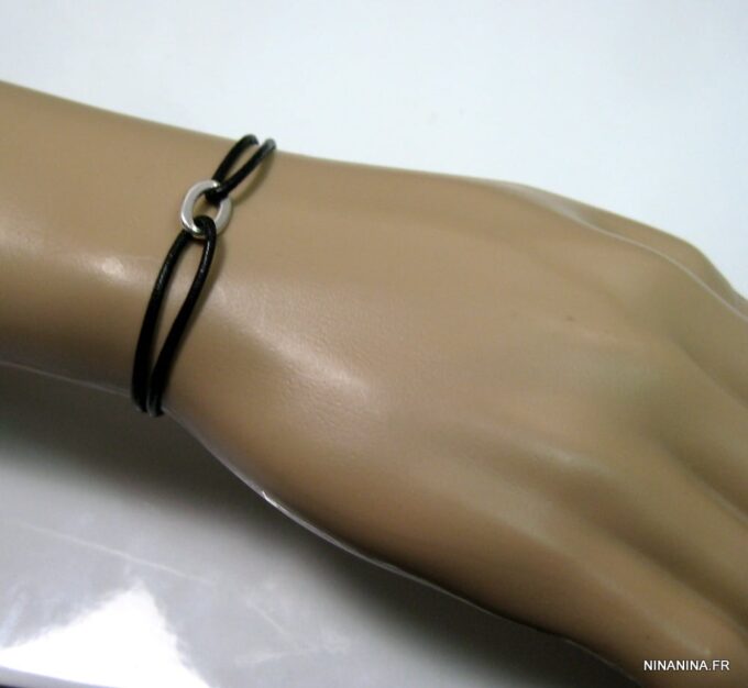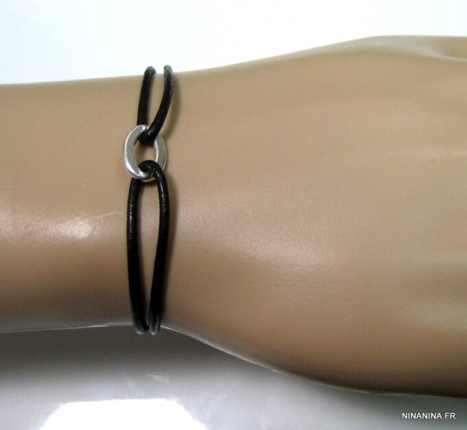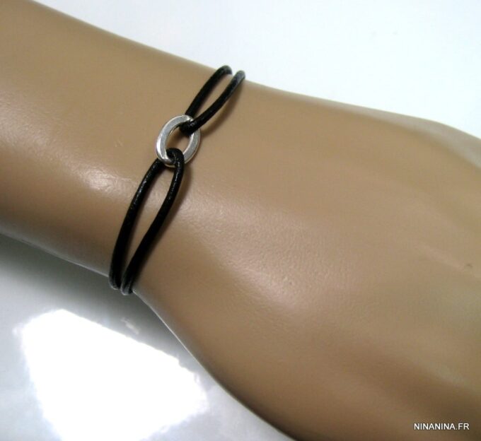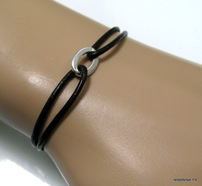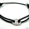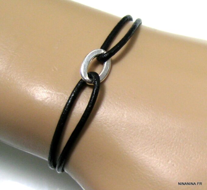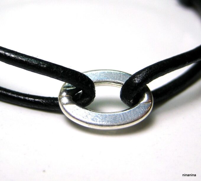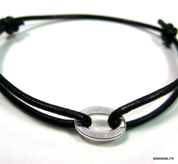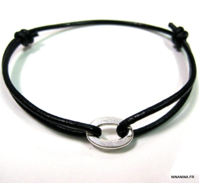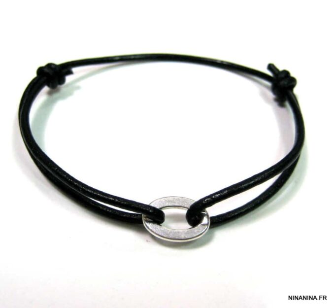 Bracelet homme cordon cuir anneau ovale plaqué Argent composé d’un anneau en plaqué argent monté sur un cordon de cuir noir (2 mm de diamètre).