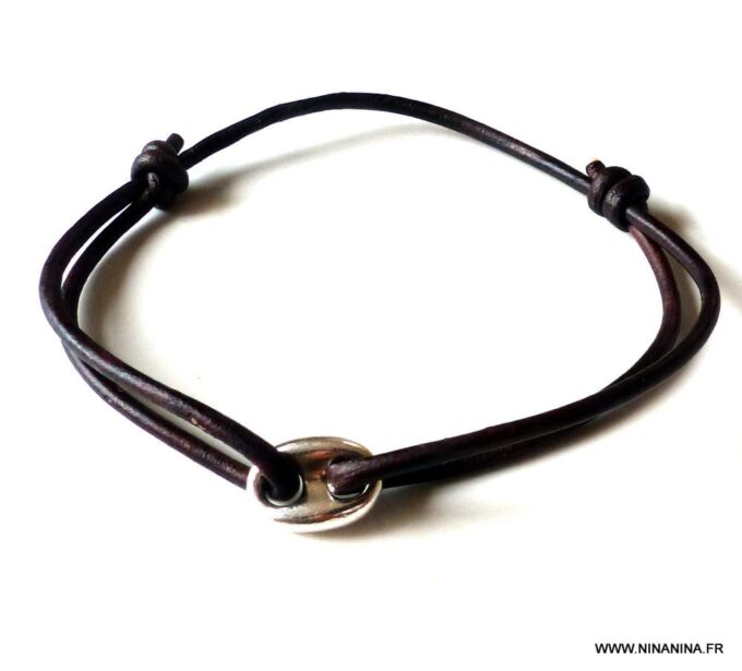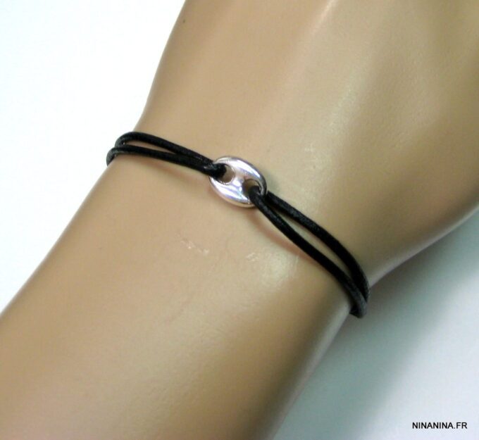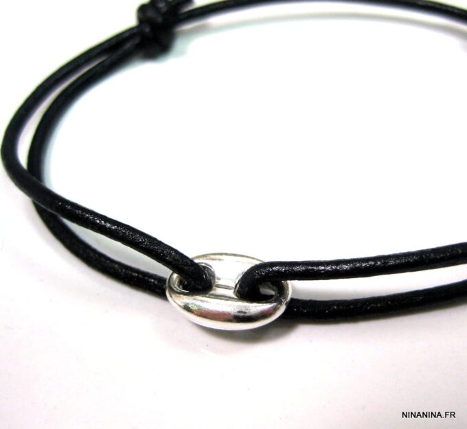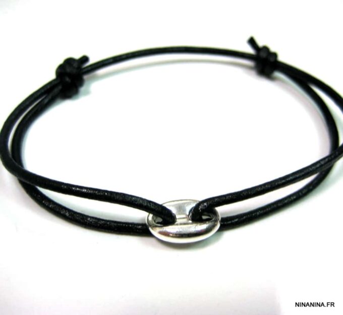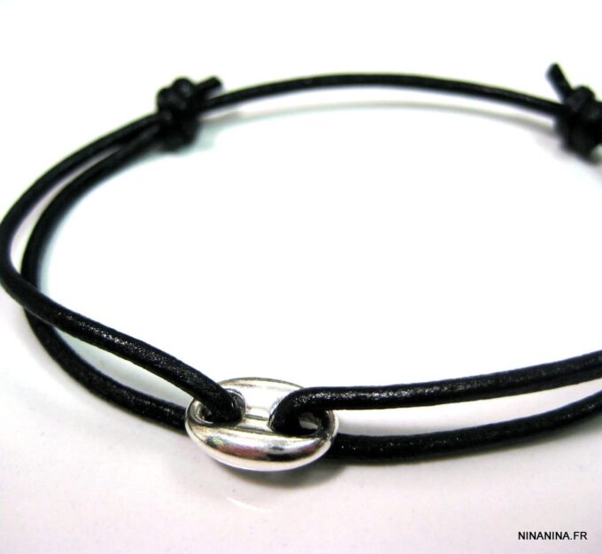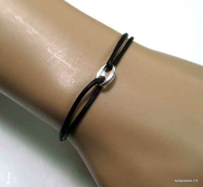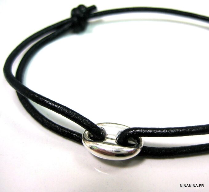 Bracelet grain de café Argent plaqué cordon cuir réglable composé d’un grain de café en plaqué argent monté sur un cordon de cuir noir.