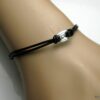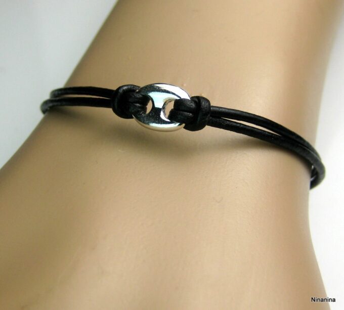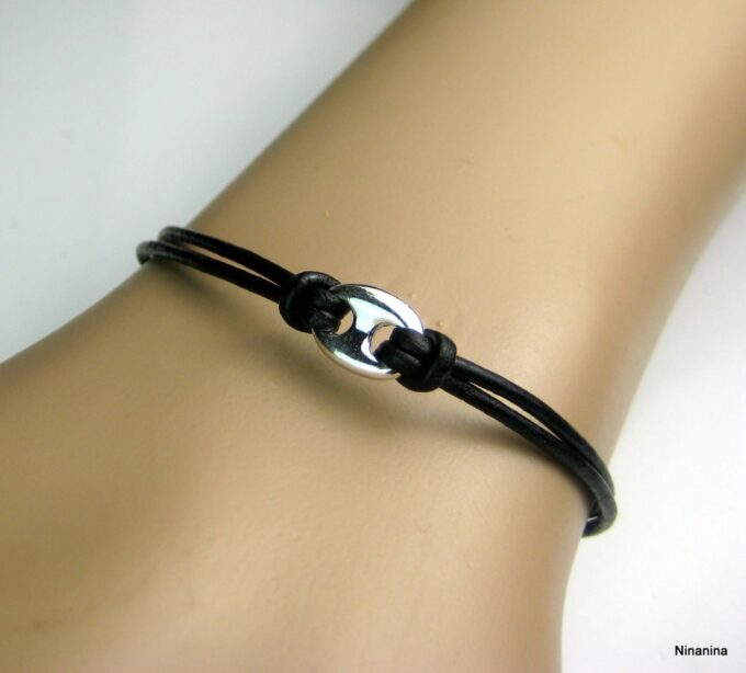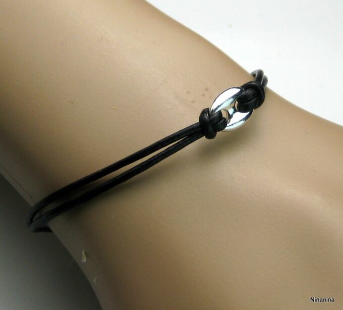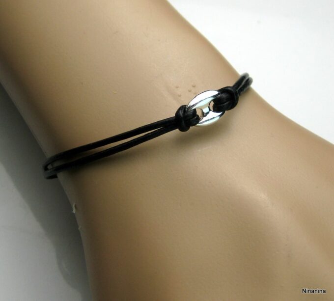 Bracelet homme cordon cuir grain de café plaqué Argent composé d’un grain de café en plaqué argent monté sur un double cordon de cuir noir.