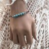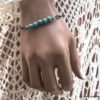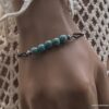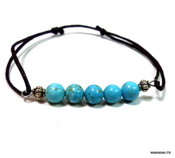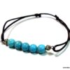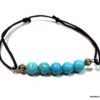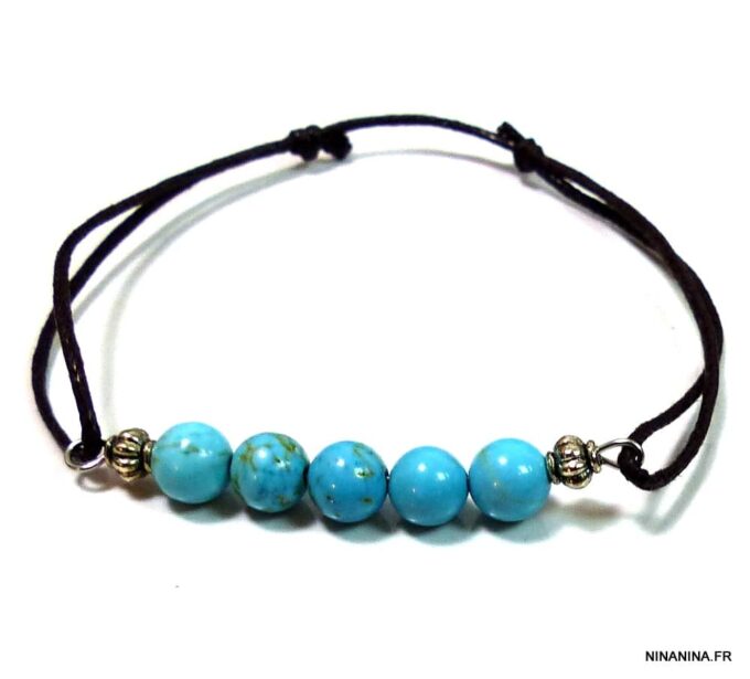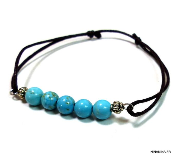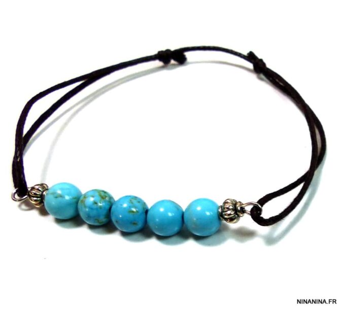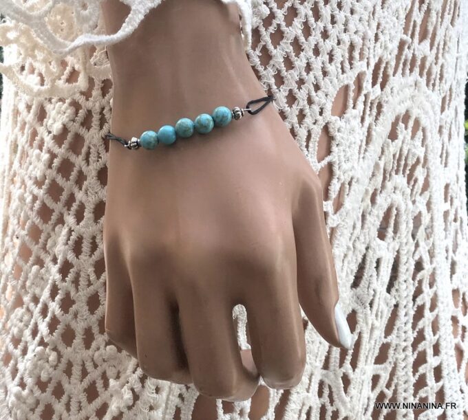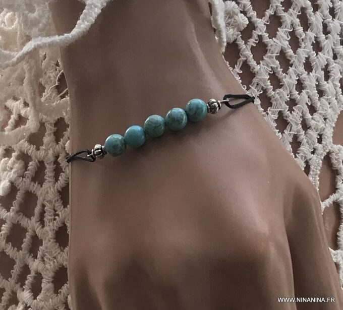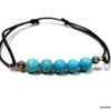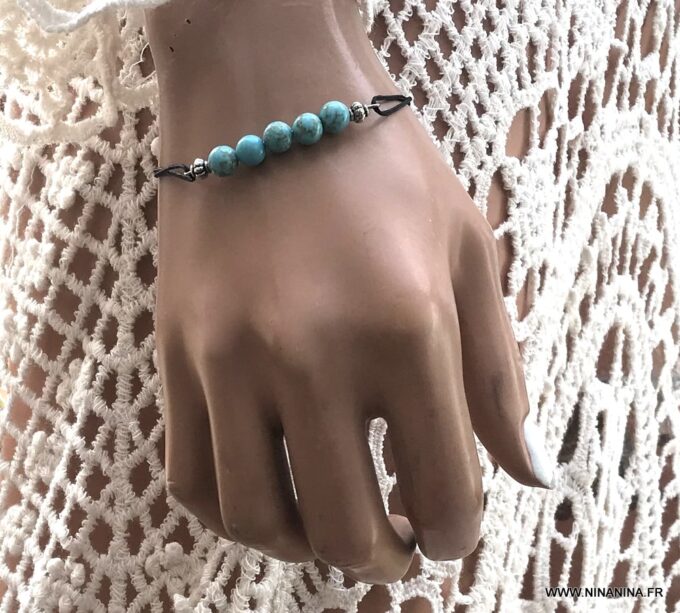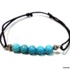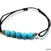 Bracelet cordon turquoise naturelle perles réglable composé de perles rondes en turquoise véritable et perles lanterne en métal argenté montées sur un cordon de coton ciré noir (1 mm de diamètre).