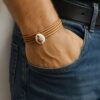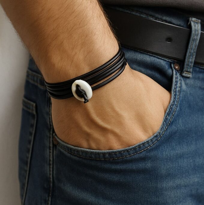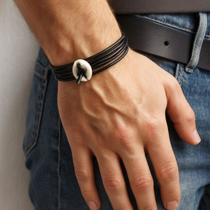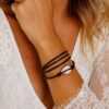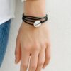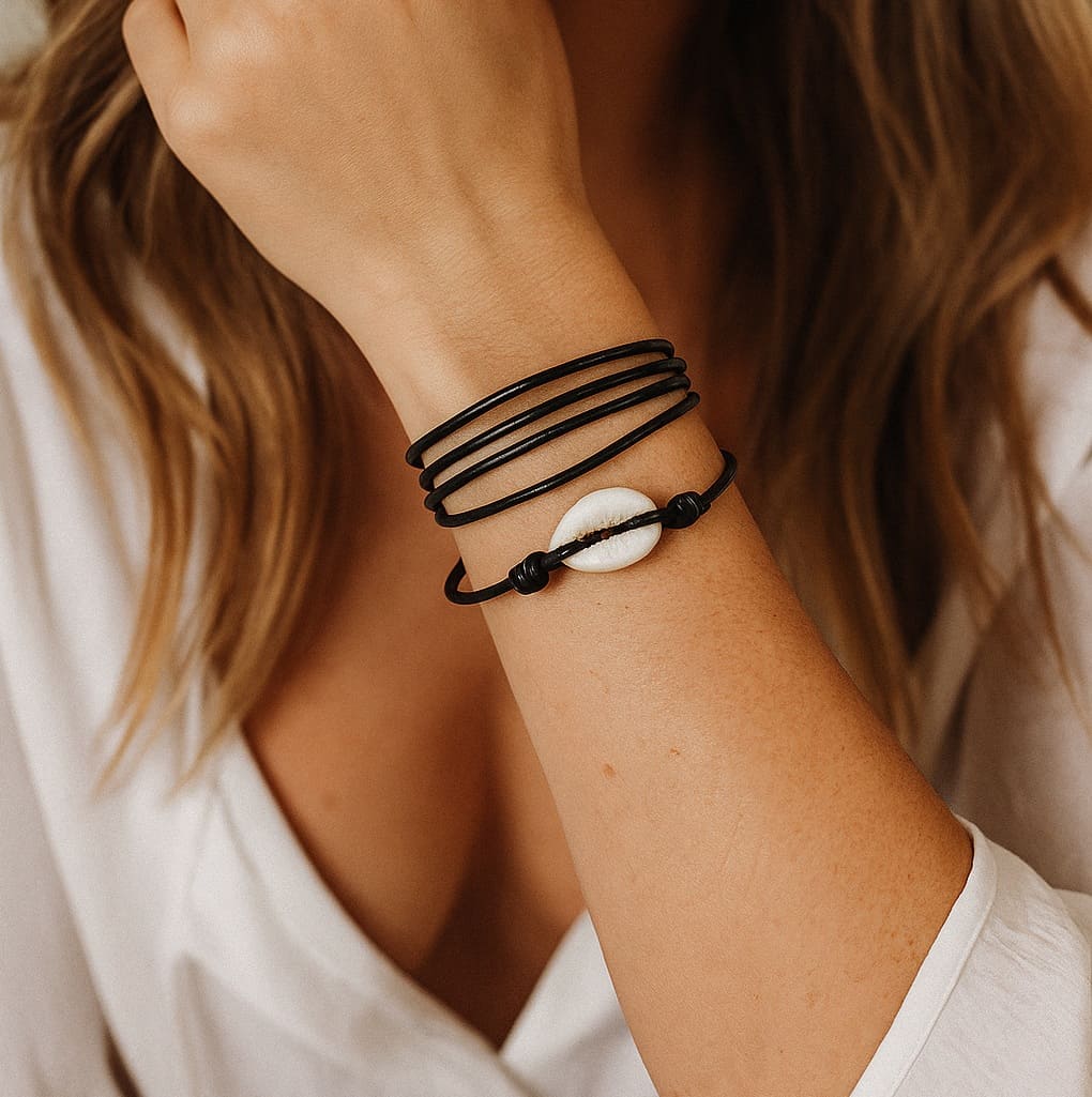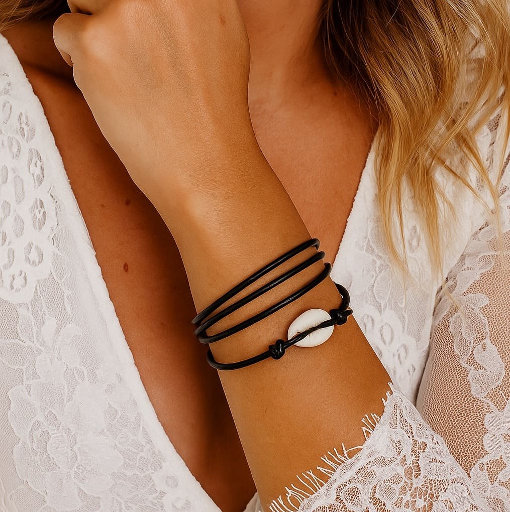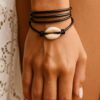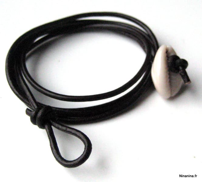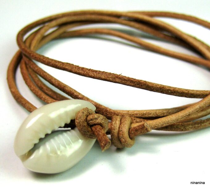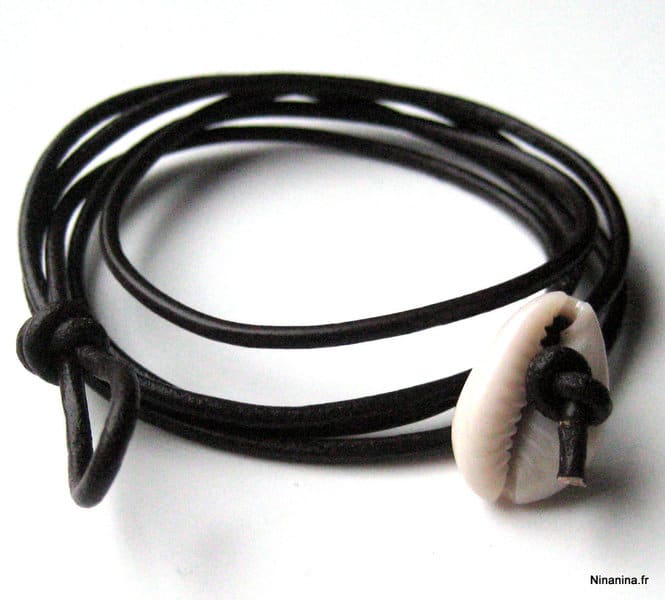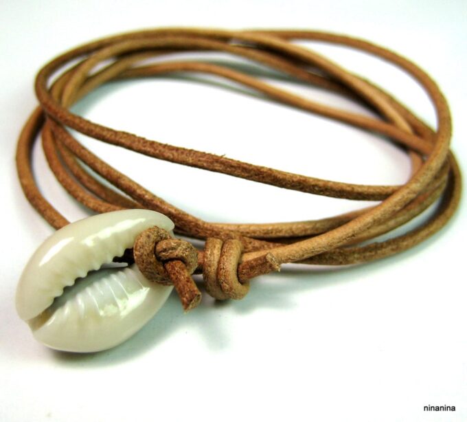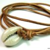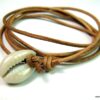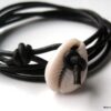 Bracelet cordon coquillage cauri femme cuir composé d’un coquillage cauri blanc monté sur un cordon de cuir (2 mm de diamètre).