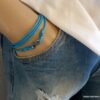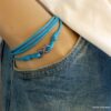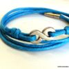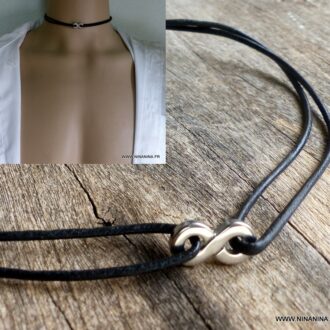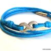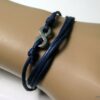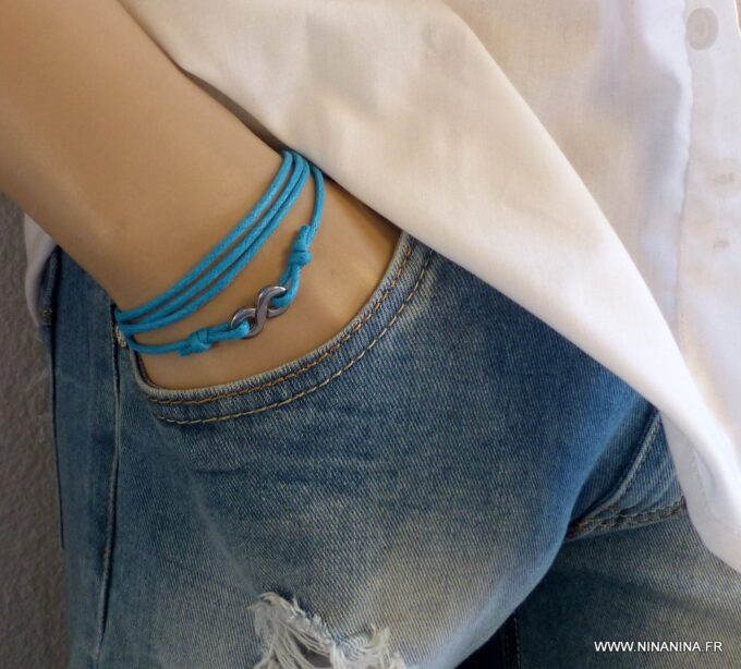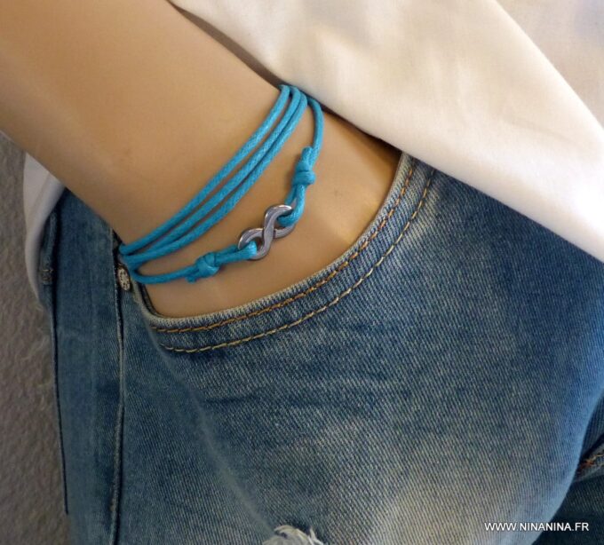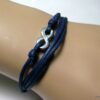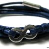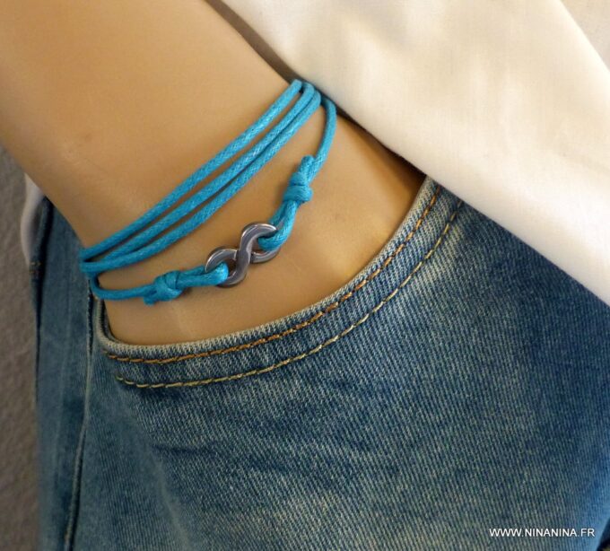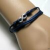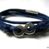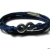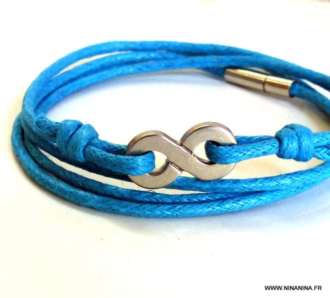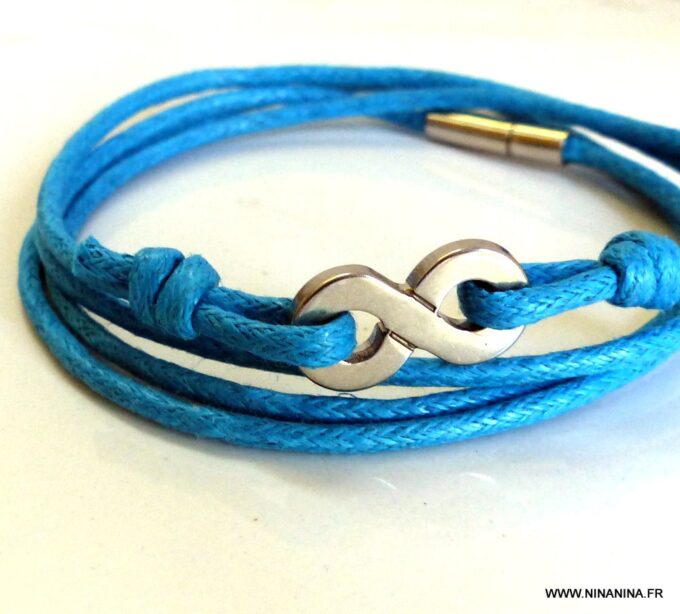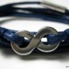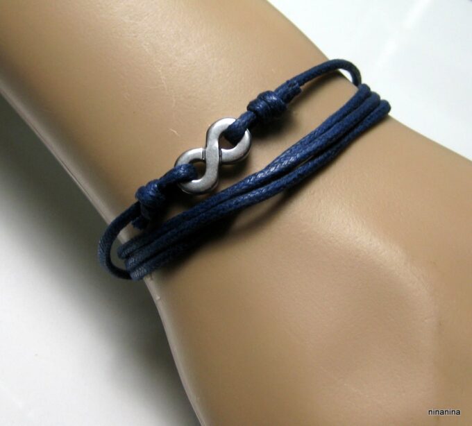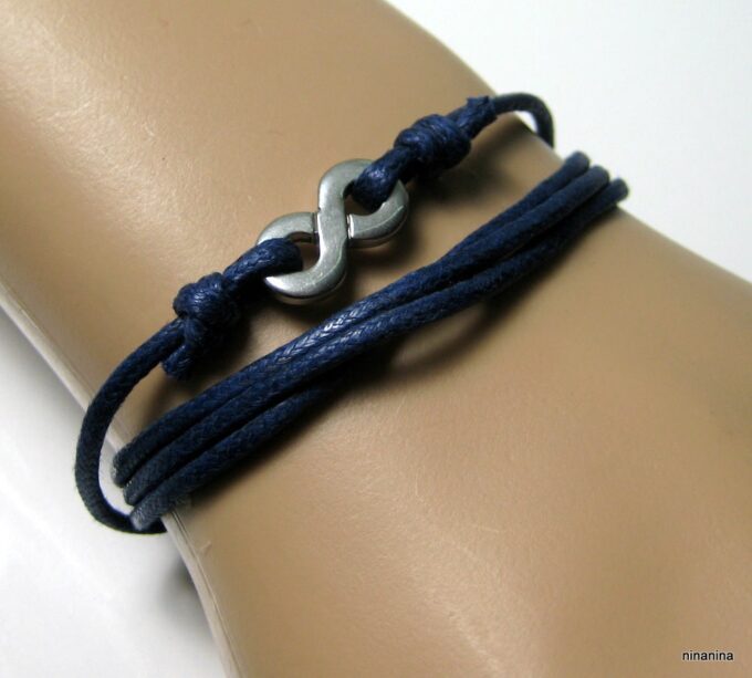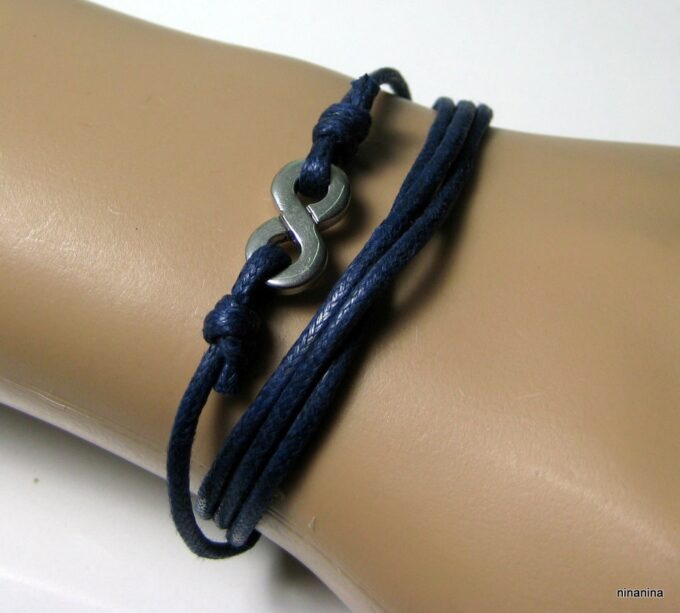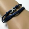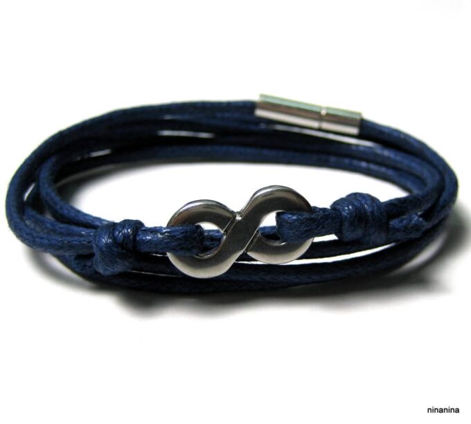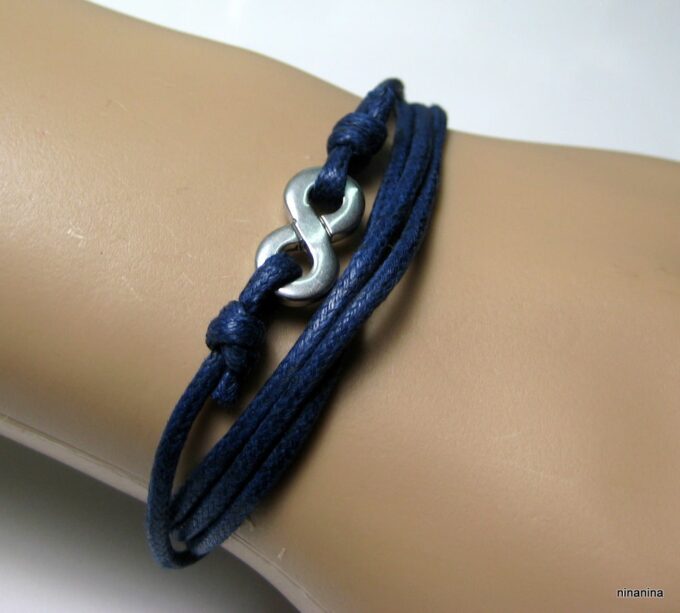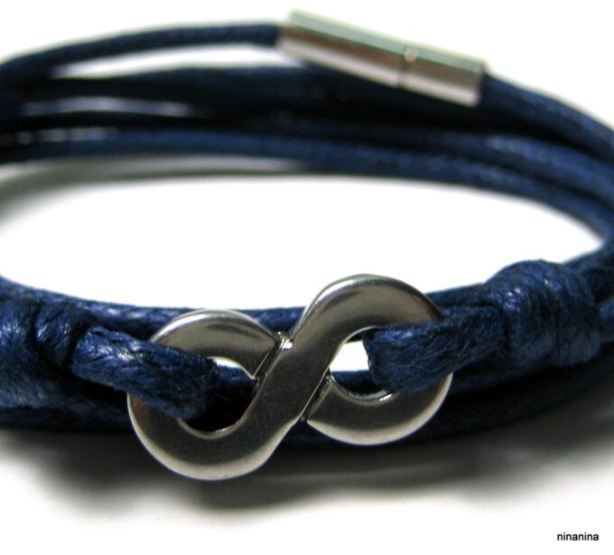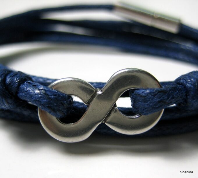 Bracelet infini homme et femme cordon wrap Acier argenté composé d’un connecteur infini en acier inoxydable monté sur un lacet de coton ciré bleu nuit (2 mm de diamètre) terminé par un fermoir cylindrique en acier inoxydable.