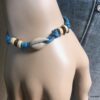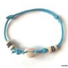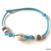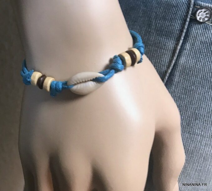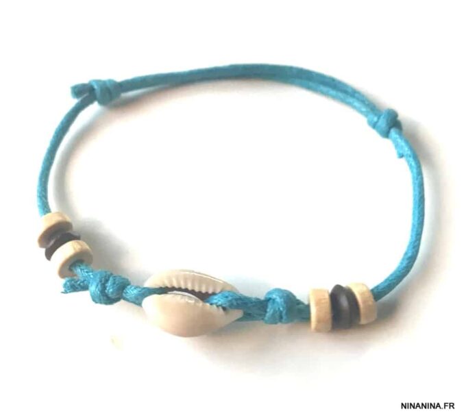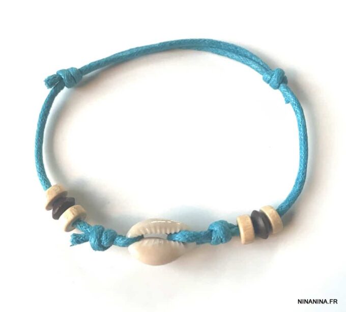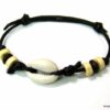 Bracelet coquillage Cauris femme ou homme cordon composé d’un coquillage grain de café blanc et de rondelles de bois montés sur un cordon de coton ciré marron chocolat (2 mm de diamètre).
