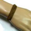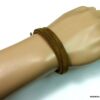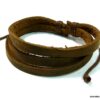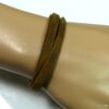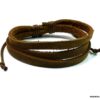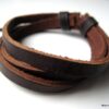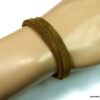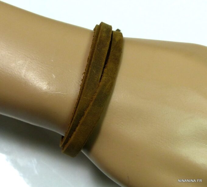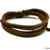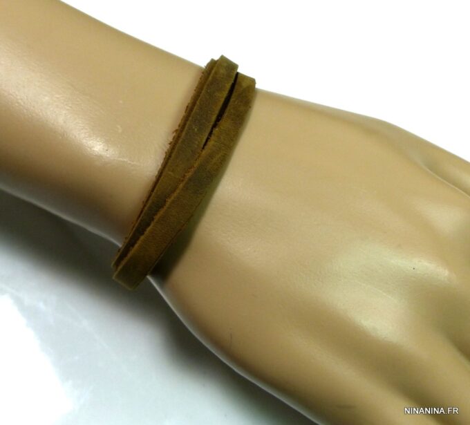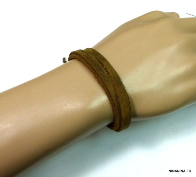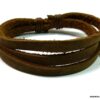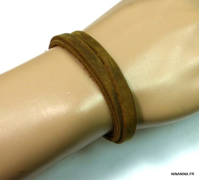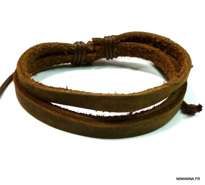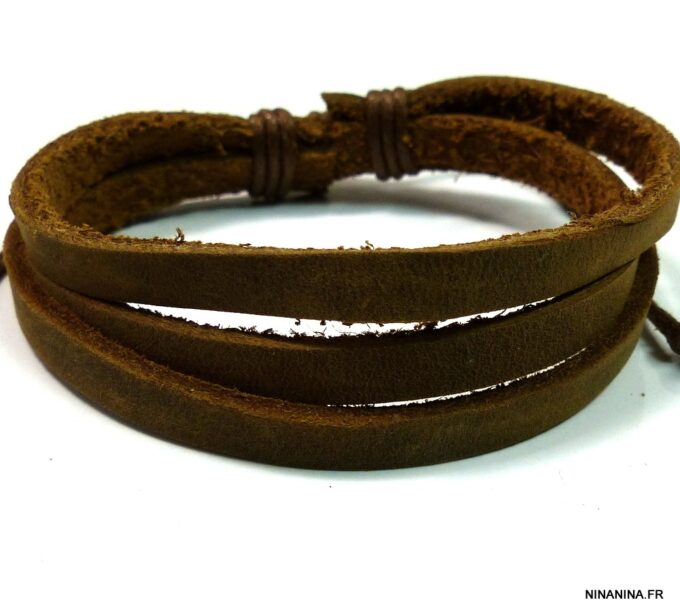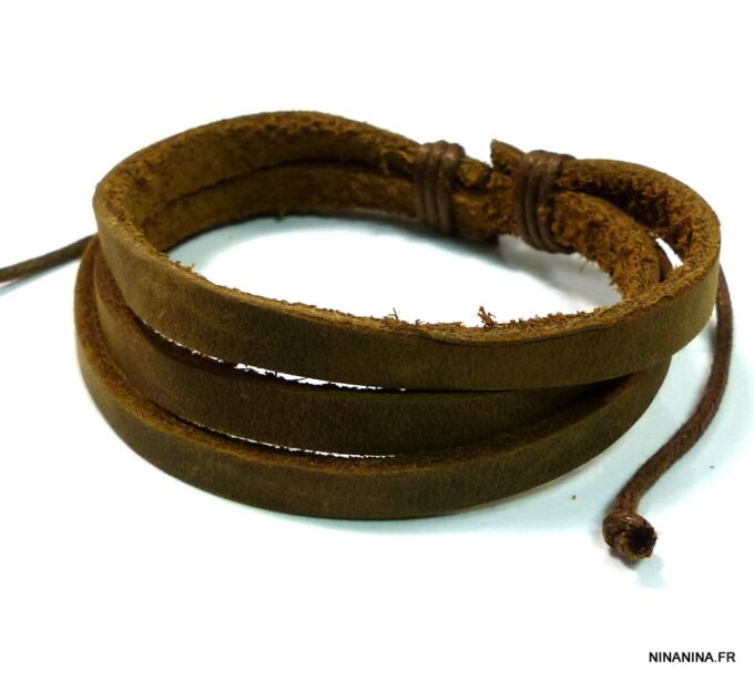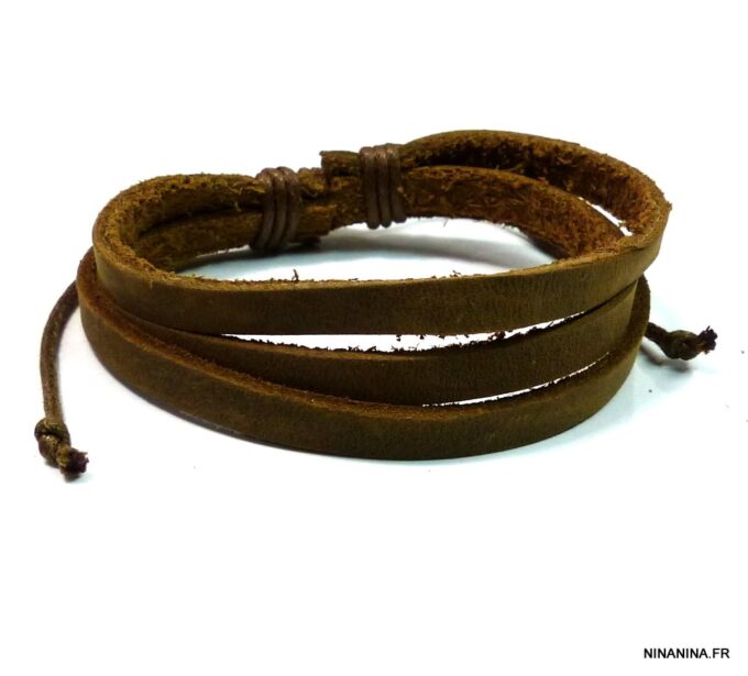 Bracelet cuir 3 rangs mixte composé de trois lanières de cuir marron clair (5 mm de large) fermées par un cordon de coton ciré. Largeur : 1,5 cm. Diamètre : de 6 à 8 cm ajustable. Fermeture par noeud coulissant. Livré dans sa pochette d’organza
