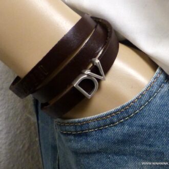 Bracelet homme cuir 3 tours personnalisé composé d’une lettre en métal argenté coulissant sur un lacet de cuir noir (10 mm de large) terminé par un fermoir mousqueton en acier inoxydable, à enrouler autour du poignet.