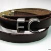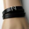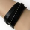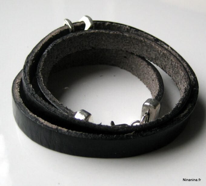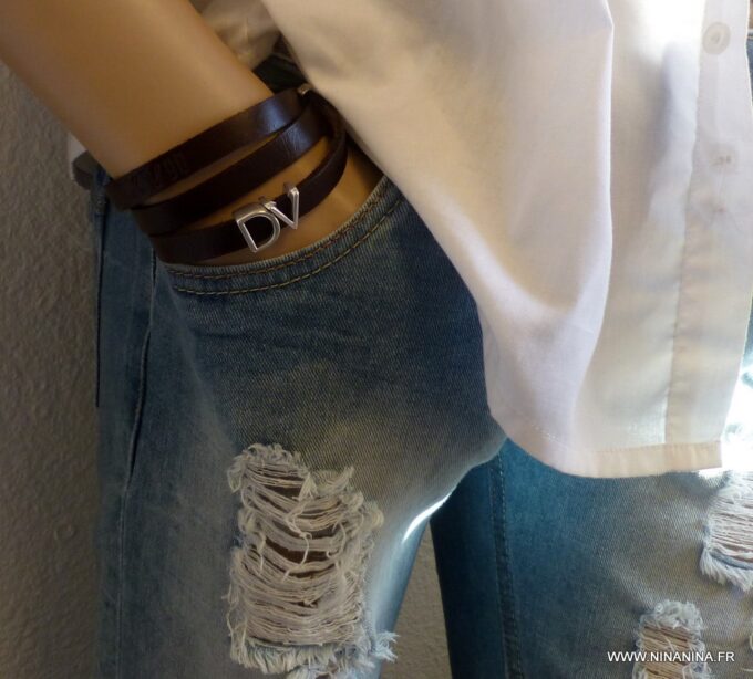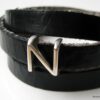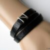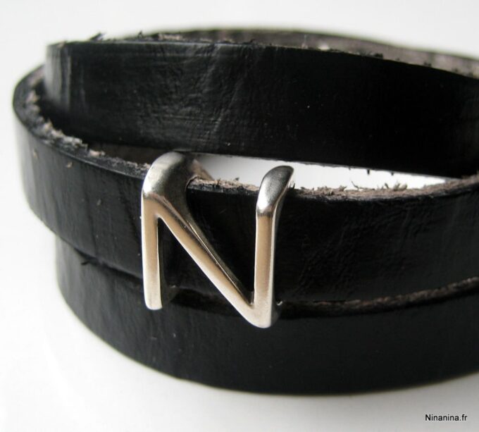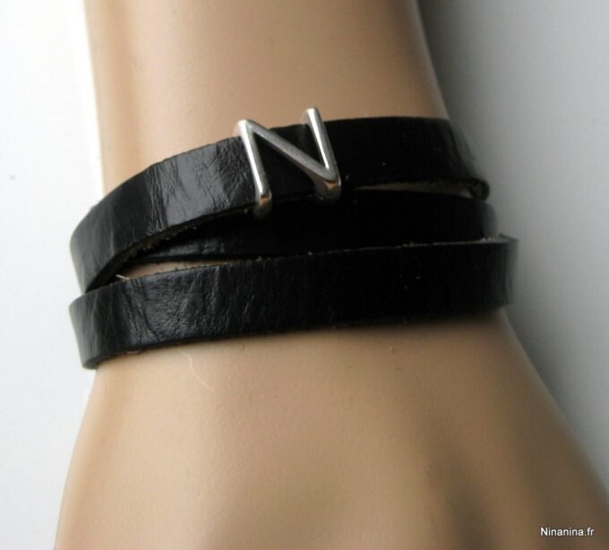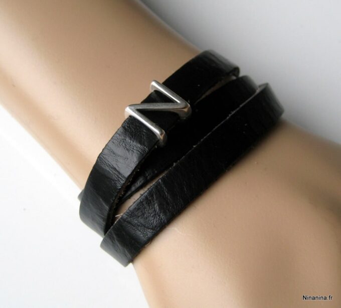 Bracelet homme personnalisé cuir trois tours avec lettre composé de deux lettres en métal argenté coulissant sur un lacet de cuir noir (10 mm de large) terminé par un fermoir mousqueton en acier inoxydable, à enrouler autour du poignet.