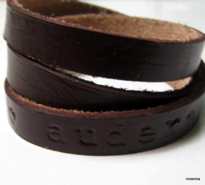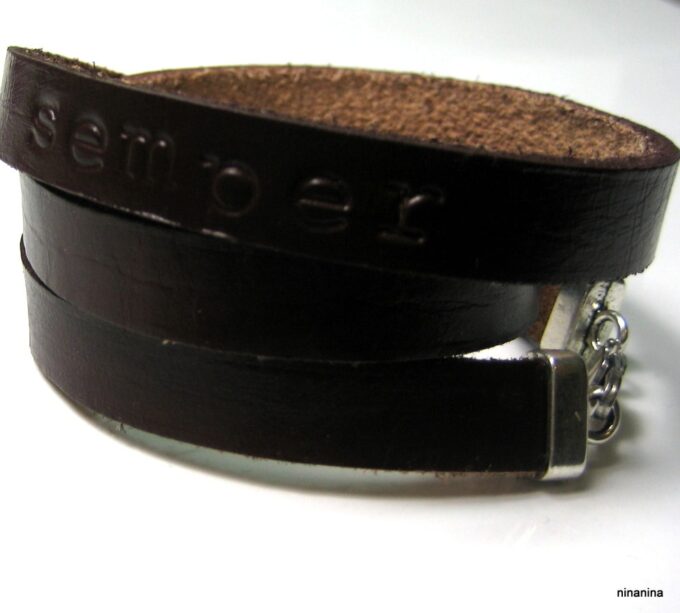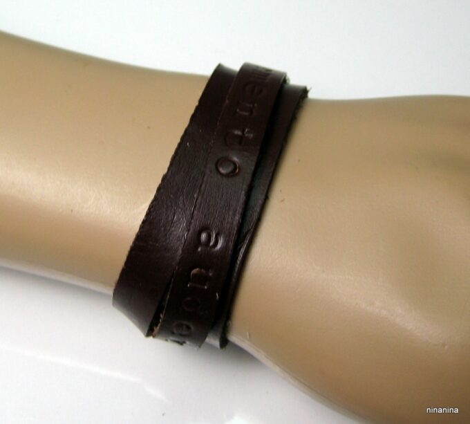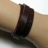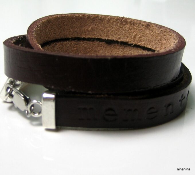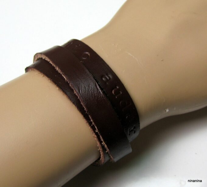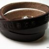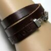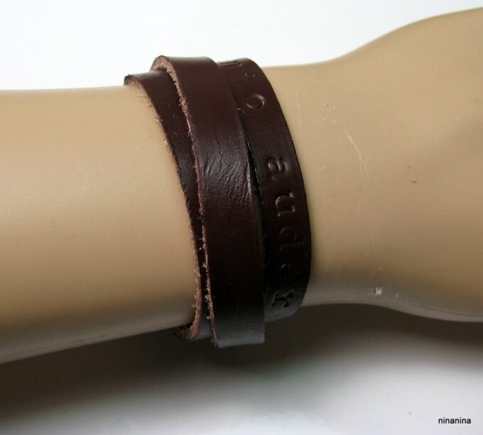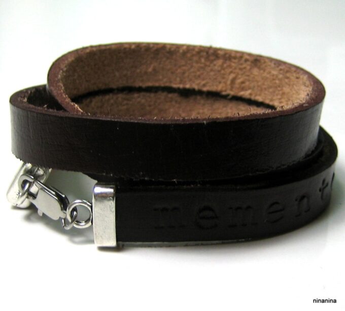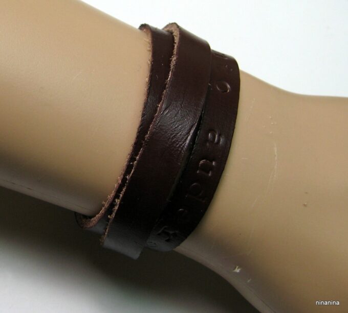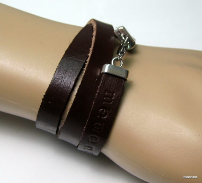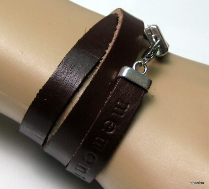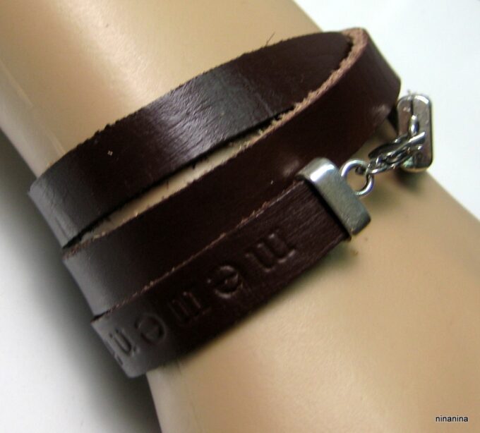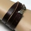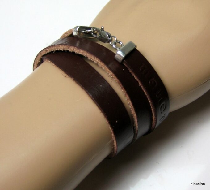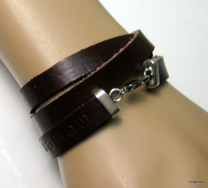 Bracelet 3 tours cuir personnalisé composé d’un bandeau de cuir marron chocolat (1 cm de large) à enrouler autour du poignet.   Fermoir mousqueton. A personnaliser avec un texte de votre choix (caractères minuscules – 36 caractères maximum) .  Longueur totale (fermoir compris): 61 cm (homme) et 59 cm (femme). TOUTE AUTRE LONGUEUR POSSIBLE – longueur souhaitée à indiquer en commentaire. Livré dans sa pochette d’organza. Bijou 100% fait main.