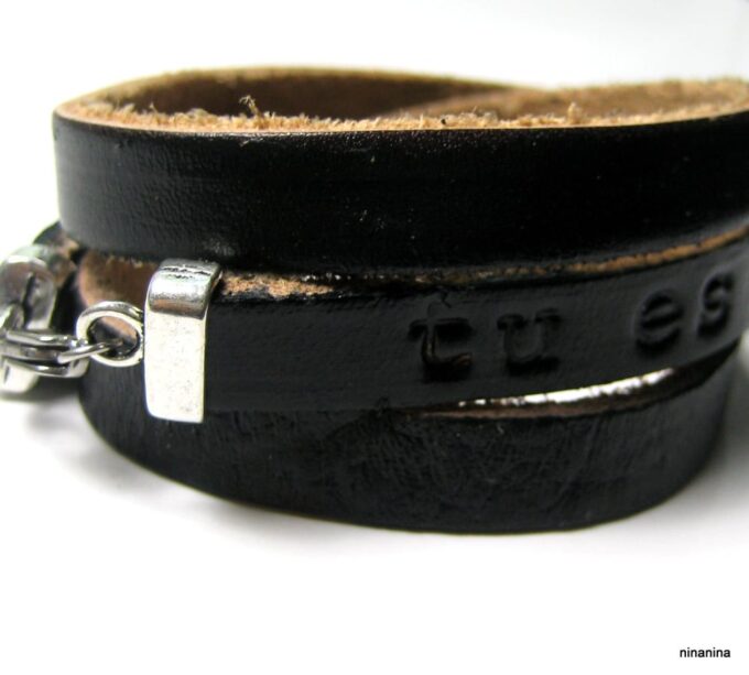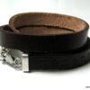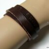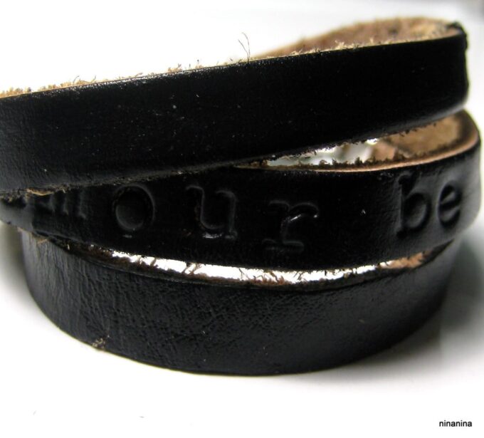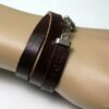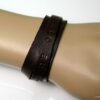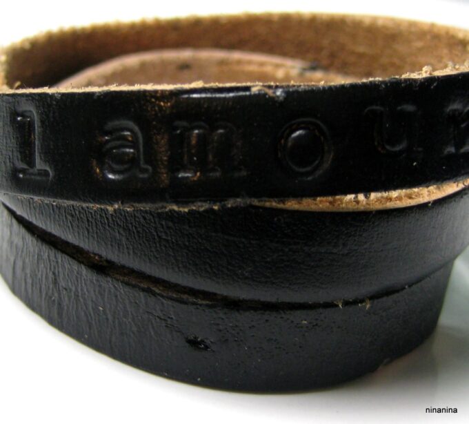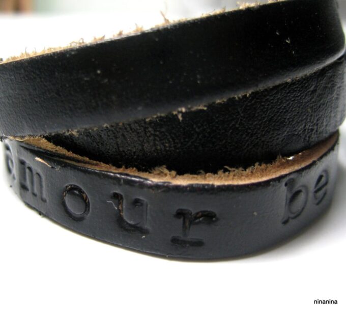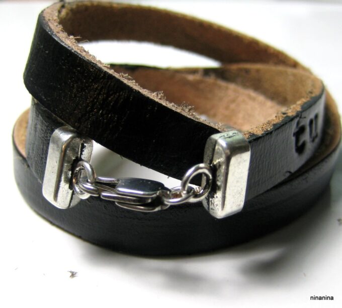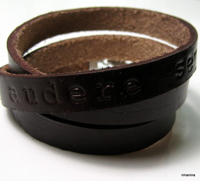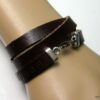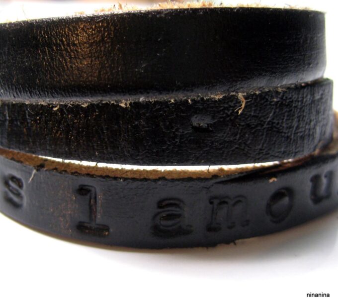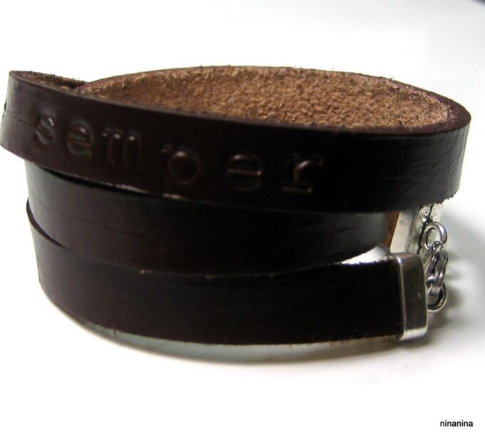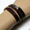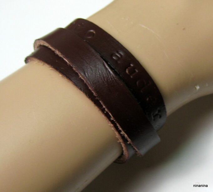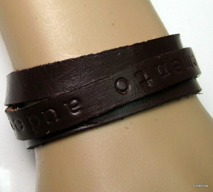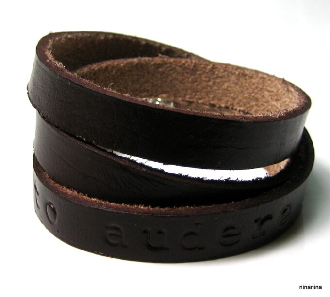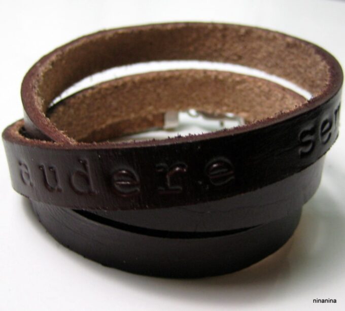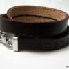Bracelet 3 tours cuir personnalisé composé d’un bandeau de cuir marron chocolat (1 cm de large) à enrouler autour du poignet.   Fermoir mousqueton. A personnaliser avec un texte de votre choix (caractères minuscules – 36 caractères maximum) .  Longueur totale (fermoir compris): 61 cm (homme) et 59 cm (femme). TOUTE AUTRE LONGUEUR POSSIBLE – longueur souhaitée à indiquer en commentaire. Livré dans sa pochette d’organza. Bijou 100% fait main.