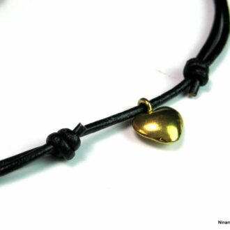 Bracelet cordon cuir anneau argent massif plaqué or composé d’un anneau rond en argent massif plaqué or 24 carats martelé monté sur un cordon de cuir noir (2mm de diamètre).