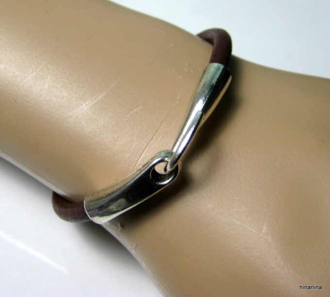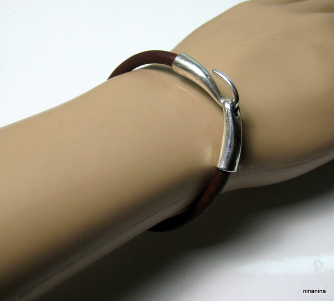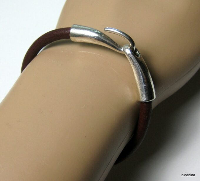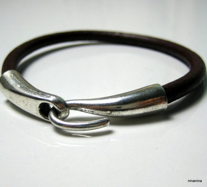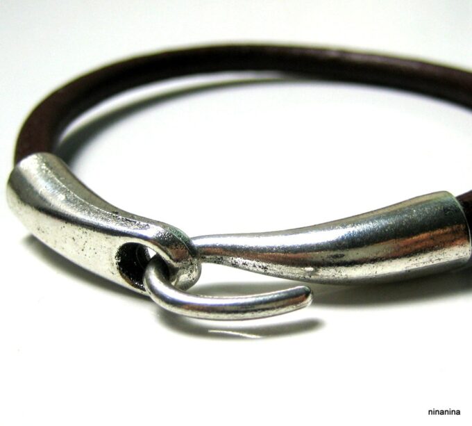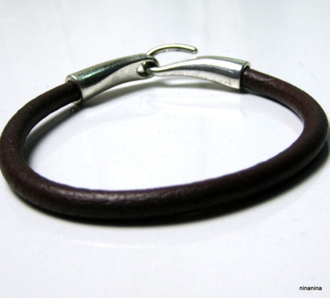 Bracelet cuir homme fermoir crochet métal argenté composé d’un cordon de cuir marron chocolat monté sur un fermoir crochet en métal argenté. Diamètre du cordon : 0,5 cm. Existe aussi en noir, rouge et naturel. Longueur : 21 cm (homme) et 19 cm (femme). TOUTE AUTRE LONGUEUR POSSIBLE – longueur souhaitée à indiquer en commentaire. Livré dans sa pochette d’organza. Bijou 100% fait-main