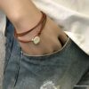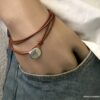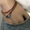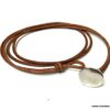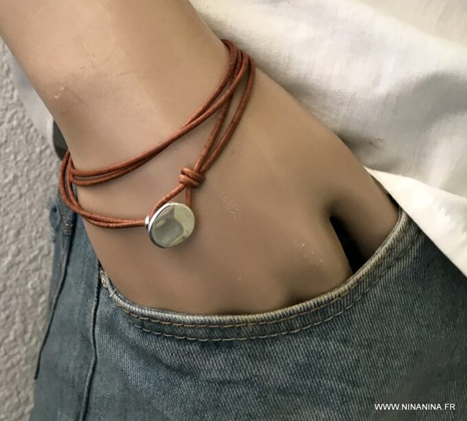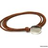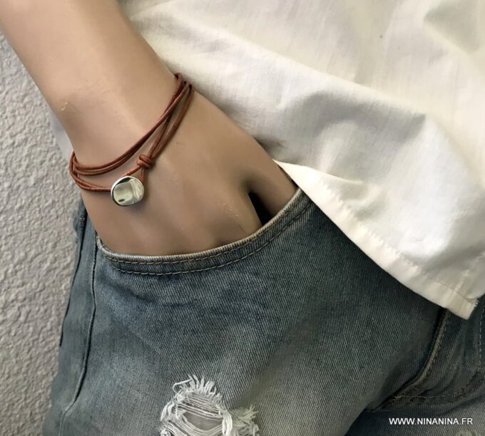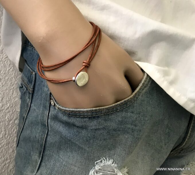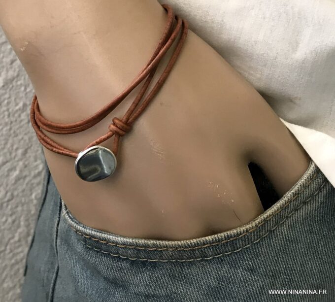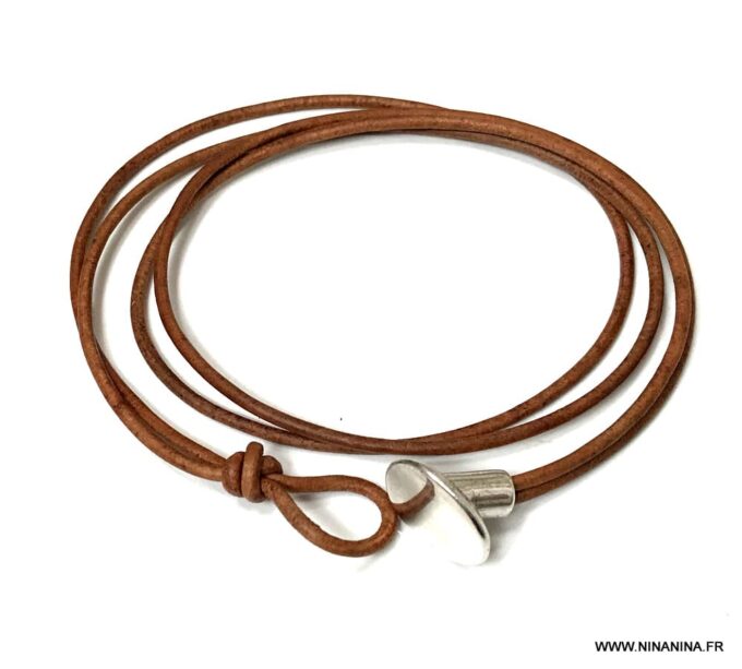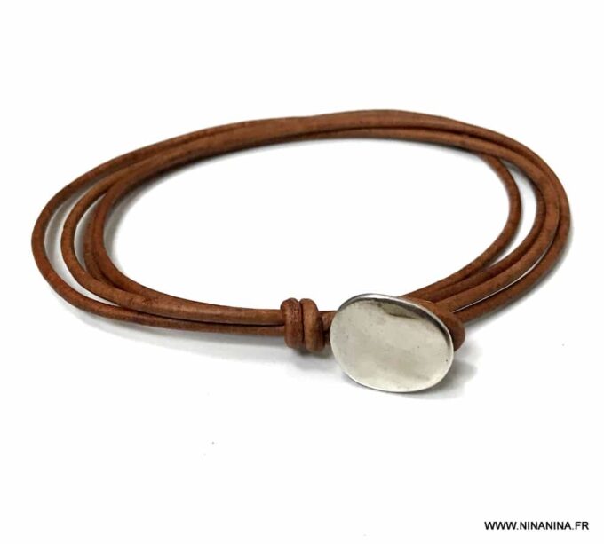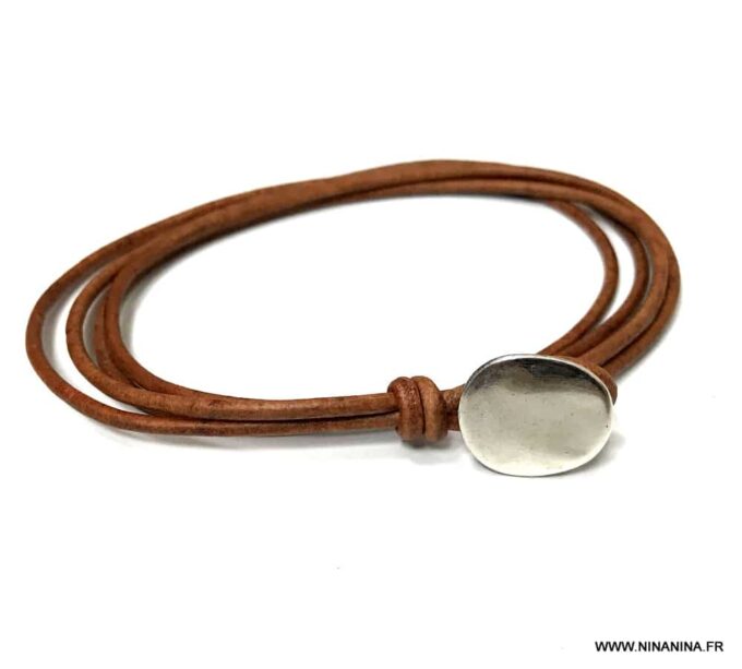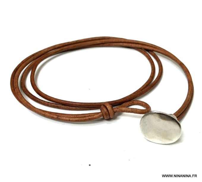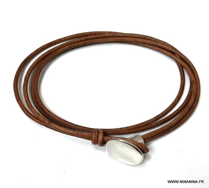 Bracelet cuir homme plusieurs tours fermoir bouton composé d’un bouton en zamak monté sur un double cordon de cuir naturel (2 mm de diamètre), à enrouler autour du poignet (2 tours).