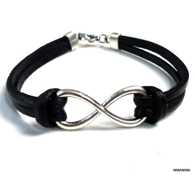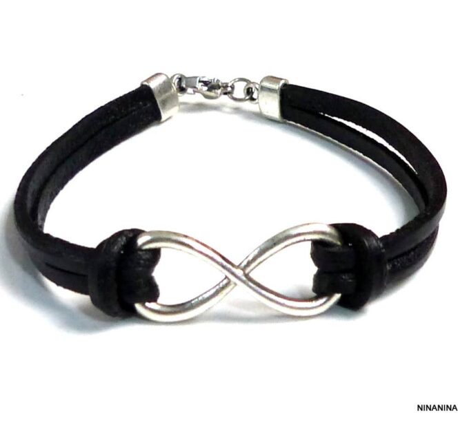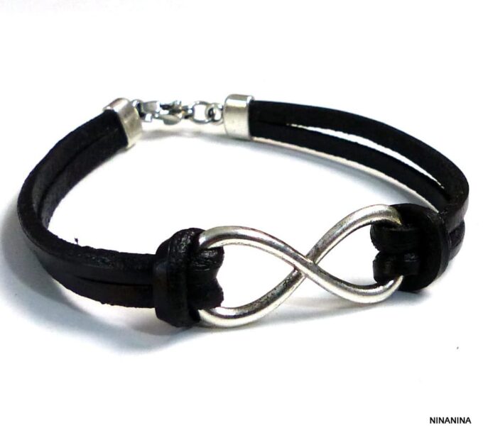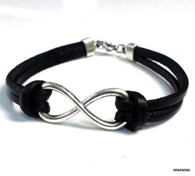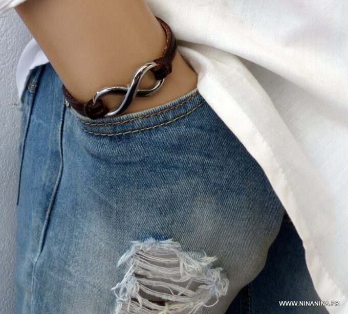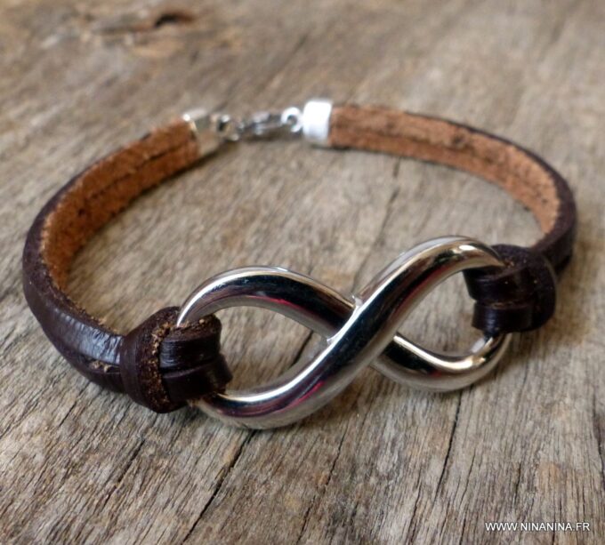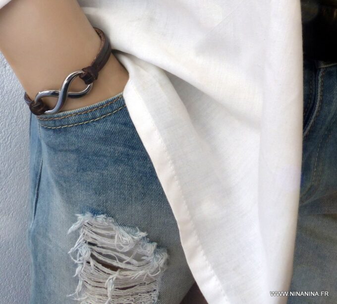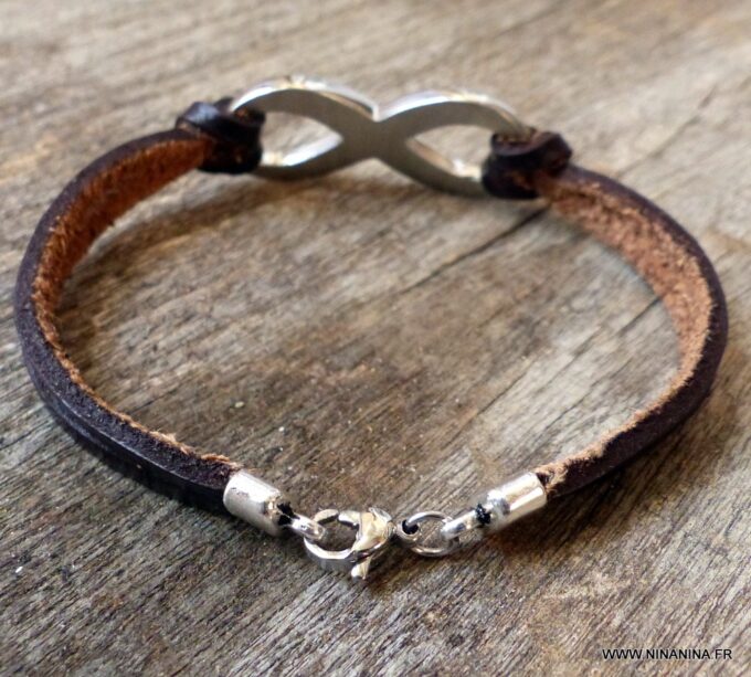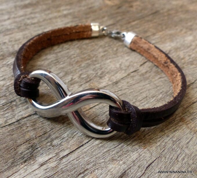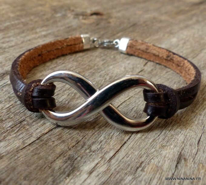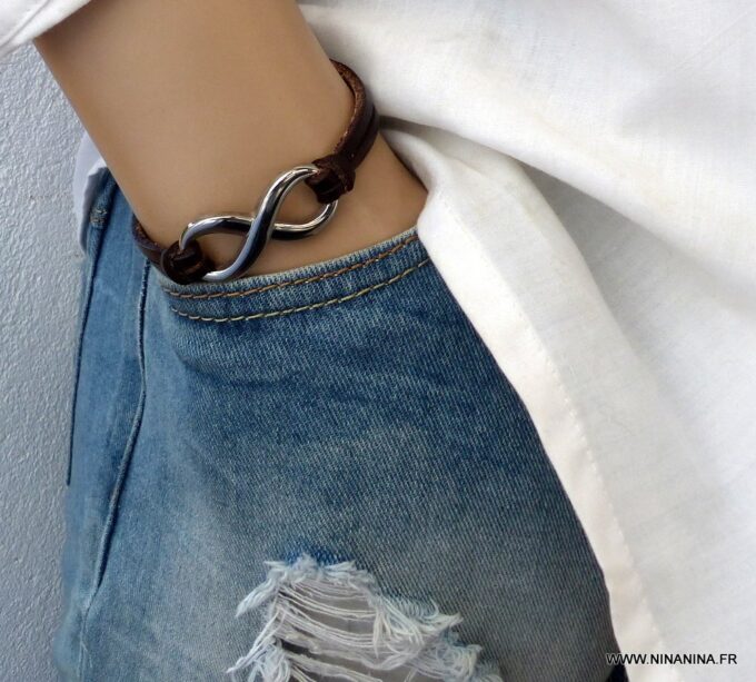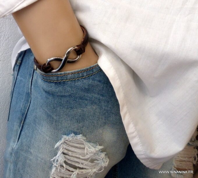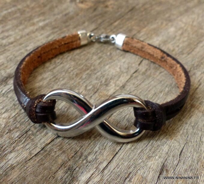 Bracelet homme cuir infini acier inoxydable argenté